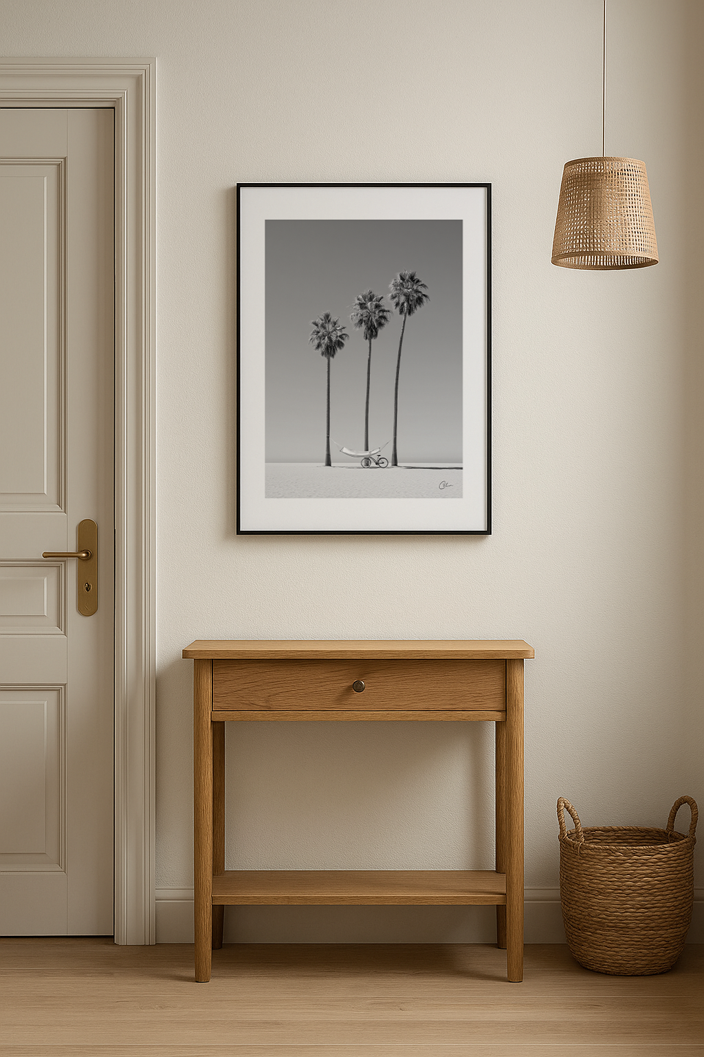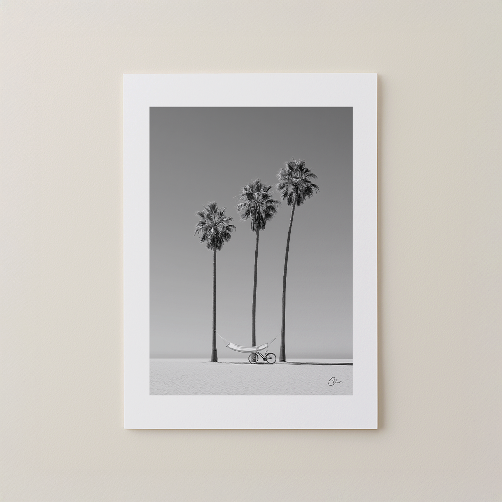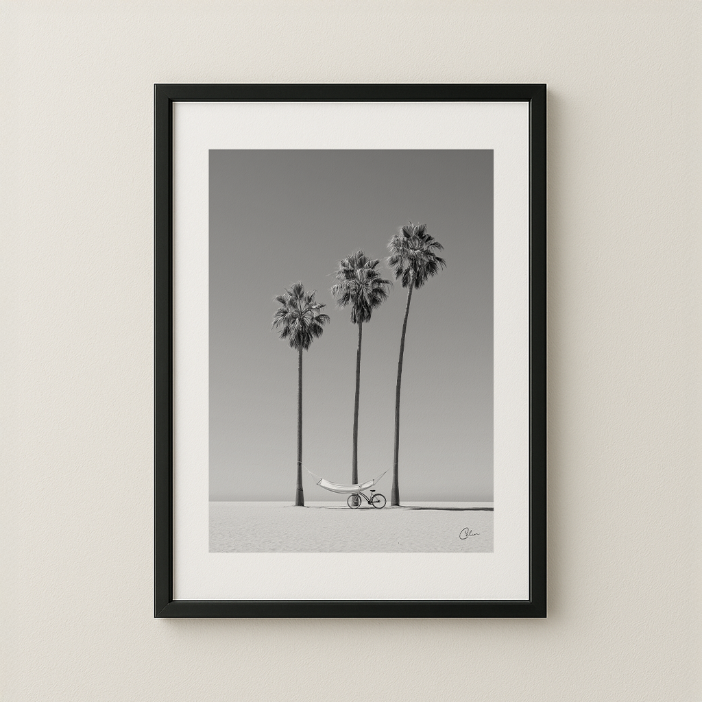 Coastal Stillness captures a serene minimalist beach scene where tall palms, a hammock and a lone bicycle create a peaceful balance. The black and white palette emphasizes calm, light and simplicity, making it ideal for living-room, bedroom or hallway interiors. It pairs beautifully with Scandinavian, coastal or modern minimalist design.