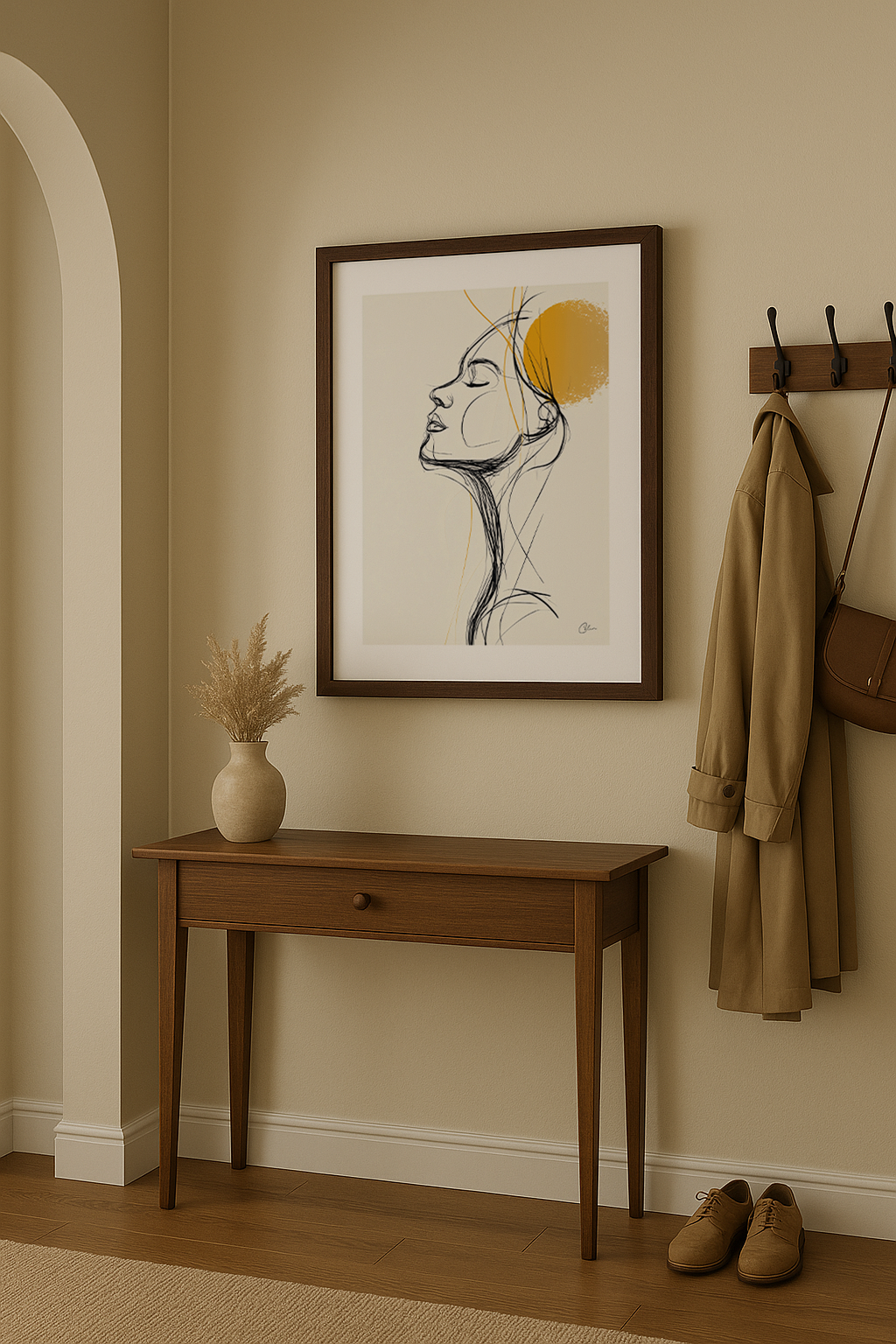 Golden Quiet is a minimal line portrait defined by elegant black strokes and a warm golden accent that creates a soft, contemplative mood. The airy negative space and fluid sketching give the artwork a serene, modern expression perfect for living-room, bedroom or hallway interiors. Its refined simplicity makes it a natural fit for Scandinavian, minimalist and contemporary decor.
