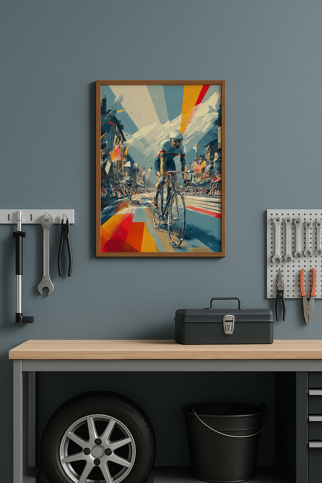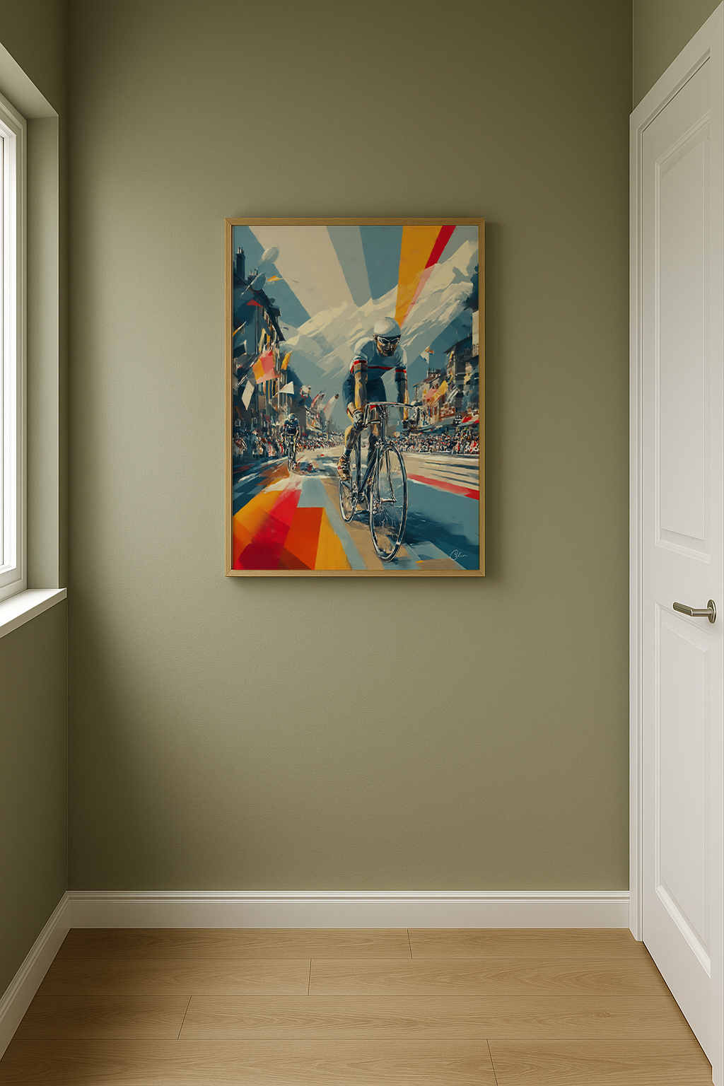 En cyklist rusar fram genom en jublande bergsstad, flankerad av flaggor och skarpa färgstrålar som sprider sig över vägen. Ett slående inslag för hallar, spelrum eller hemmagym – särskilt med djärva primärfärger, svala gråtoner eller industriella accenter.