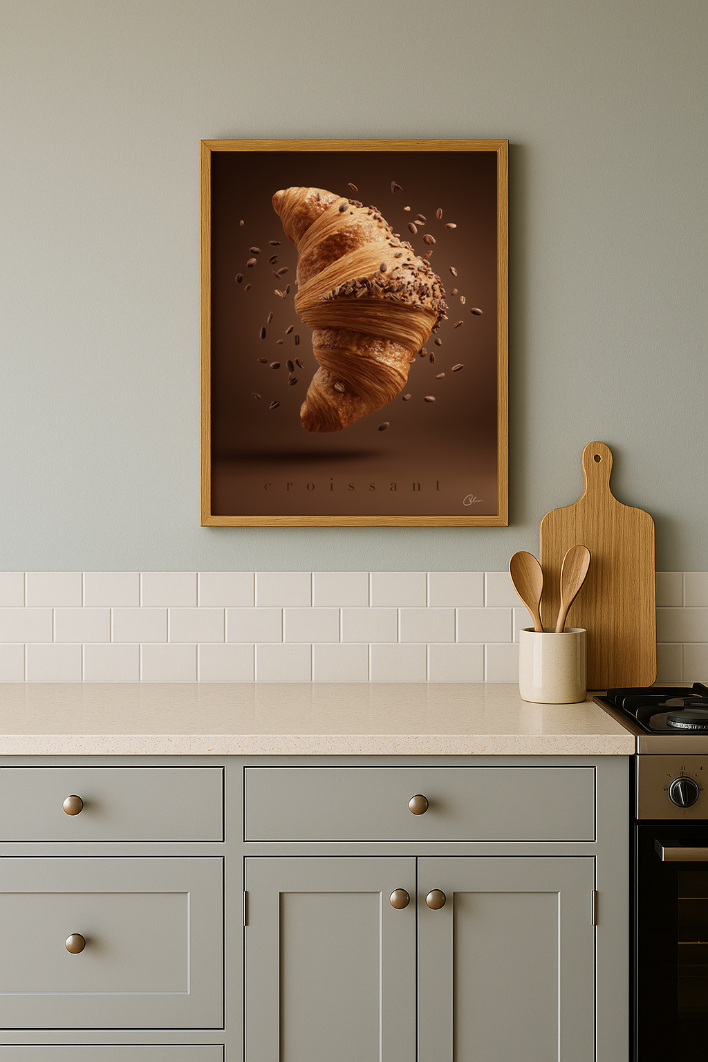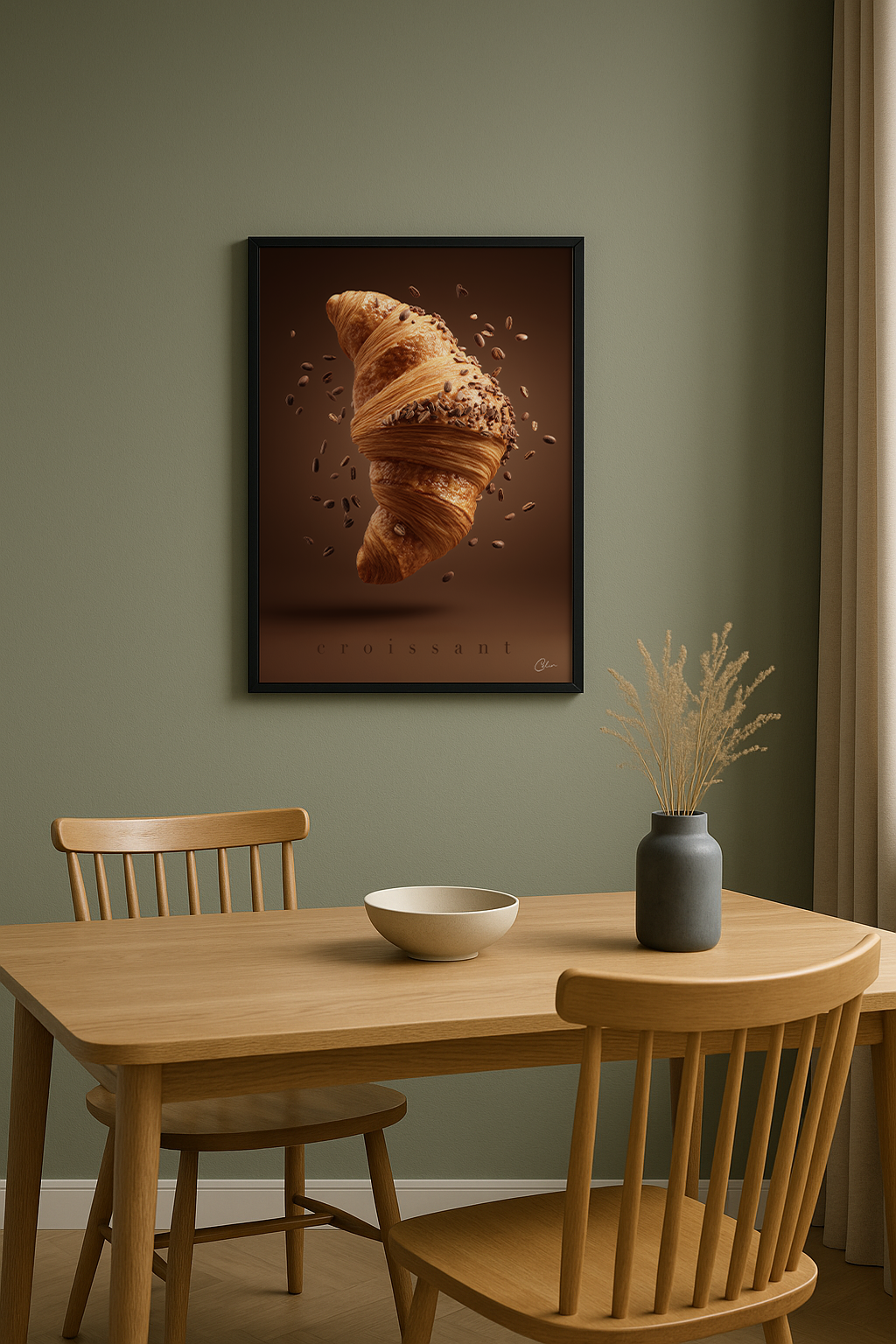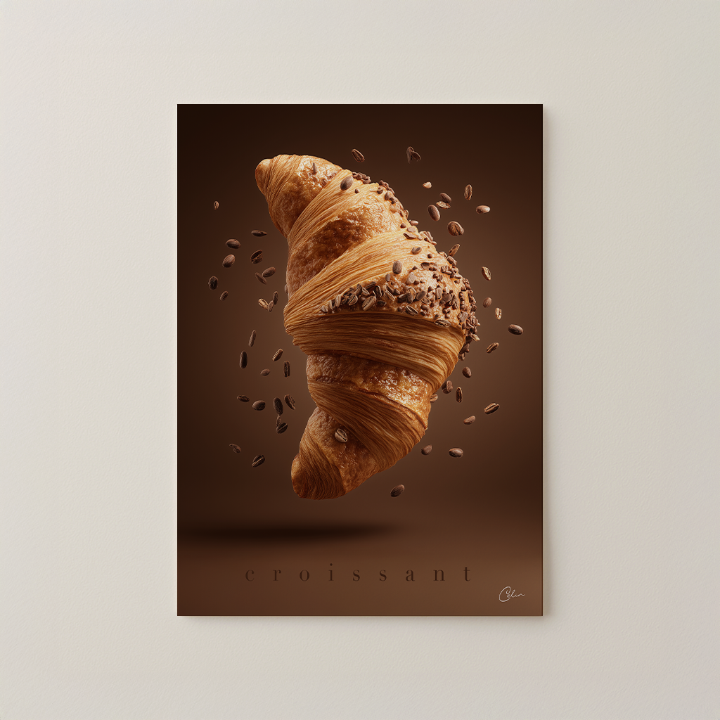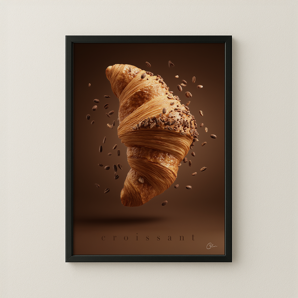 En croissant svävar i luften, insvept i gyllene lager och bestrött med rostade kaffebönor – lekfull, fyllig och oemotståndligt texturerad. Perfekt för kök, kaféer eller matsalar med varma toner, matälskares hem eller utrymmen med naturligt trä och mysig belysning.
