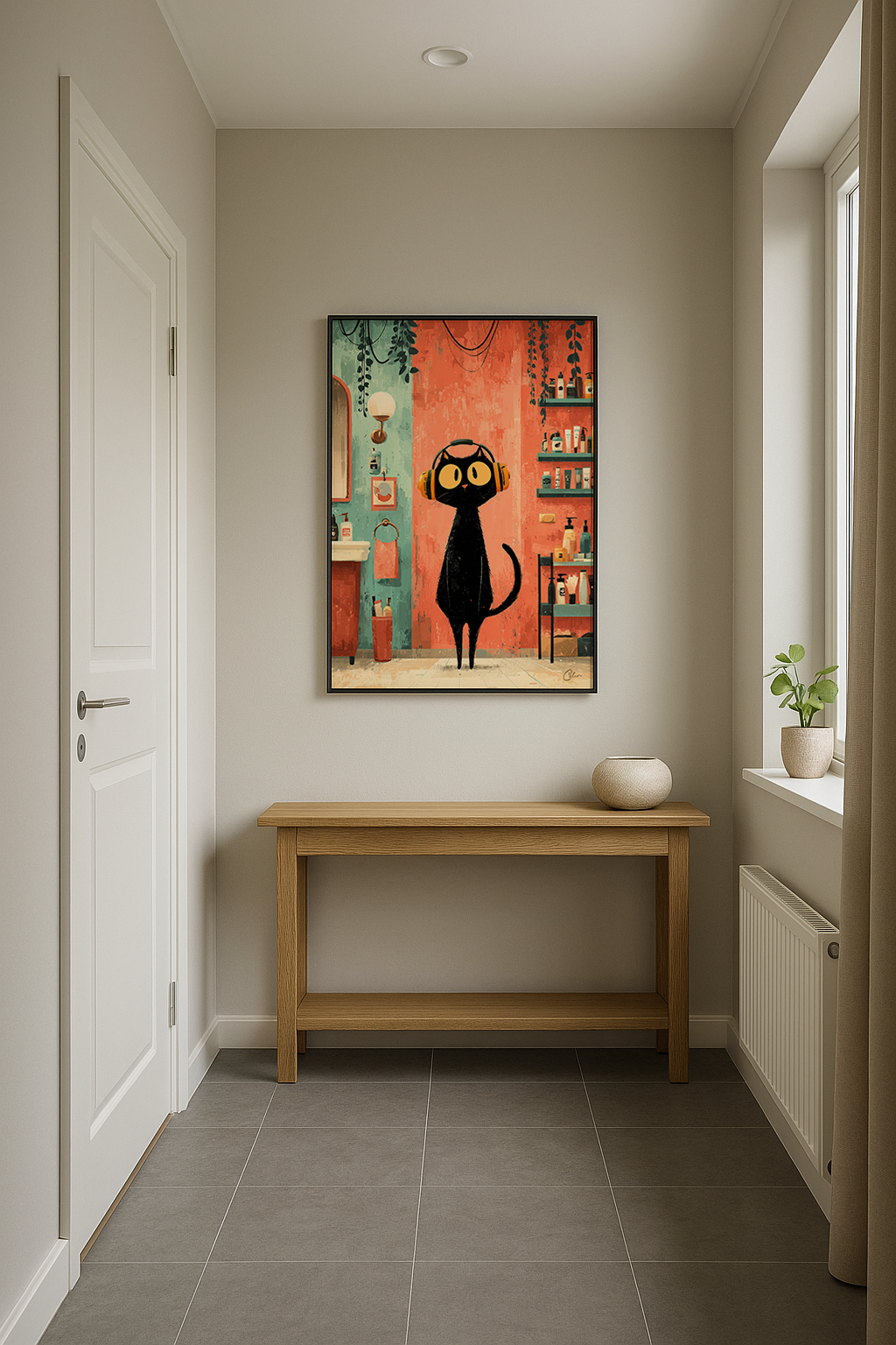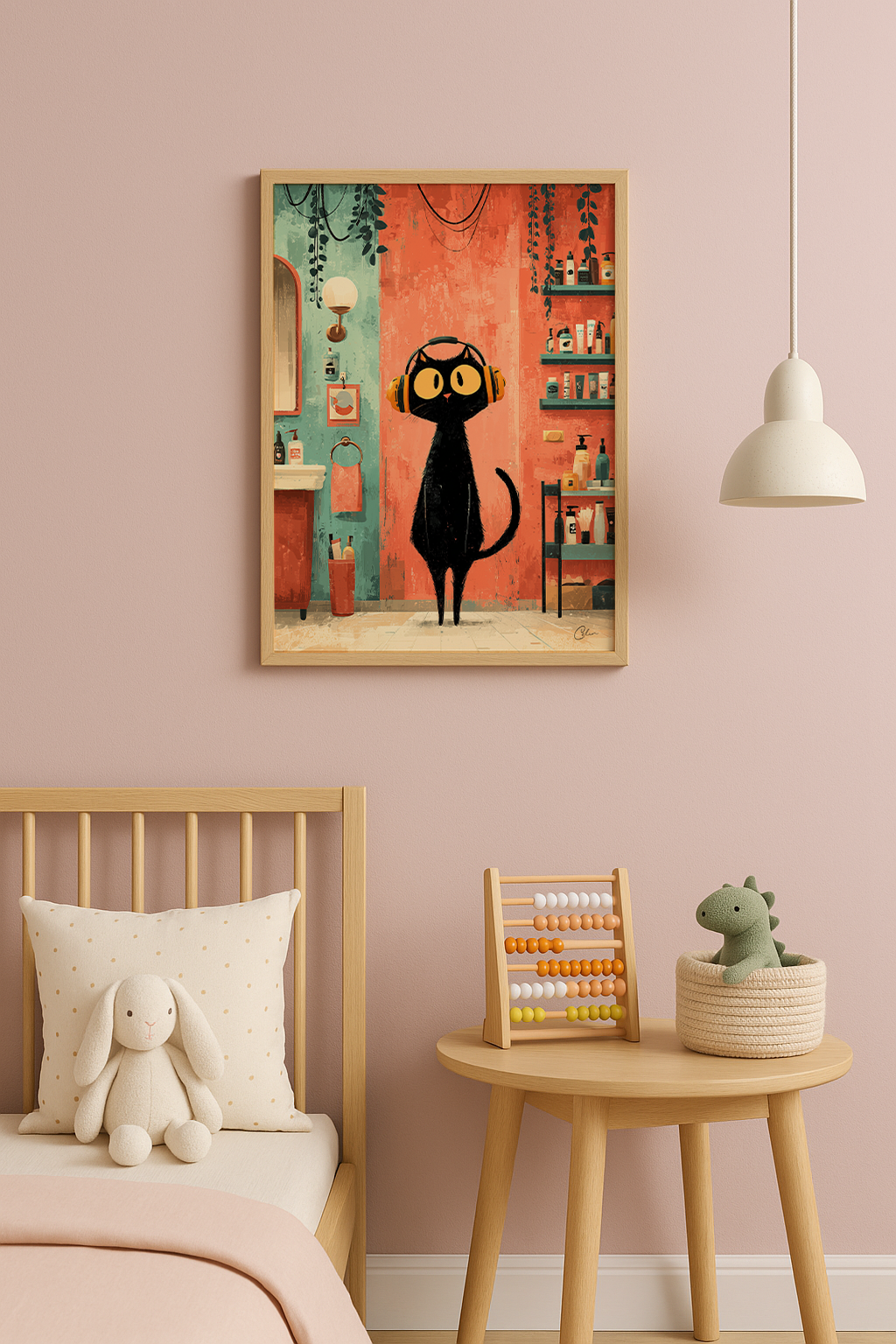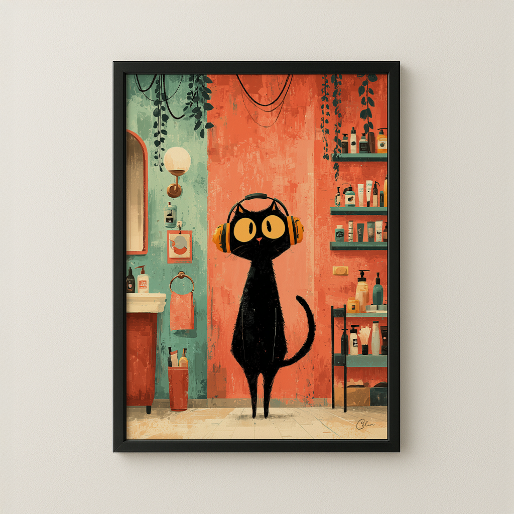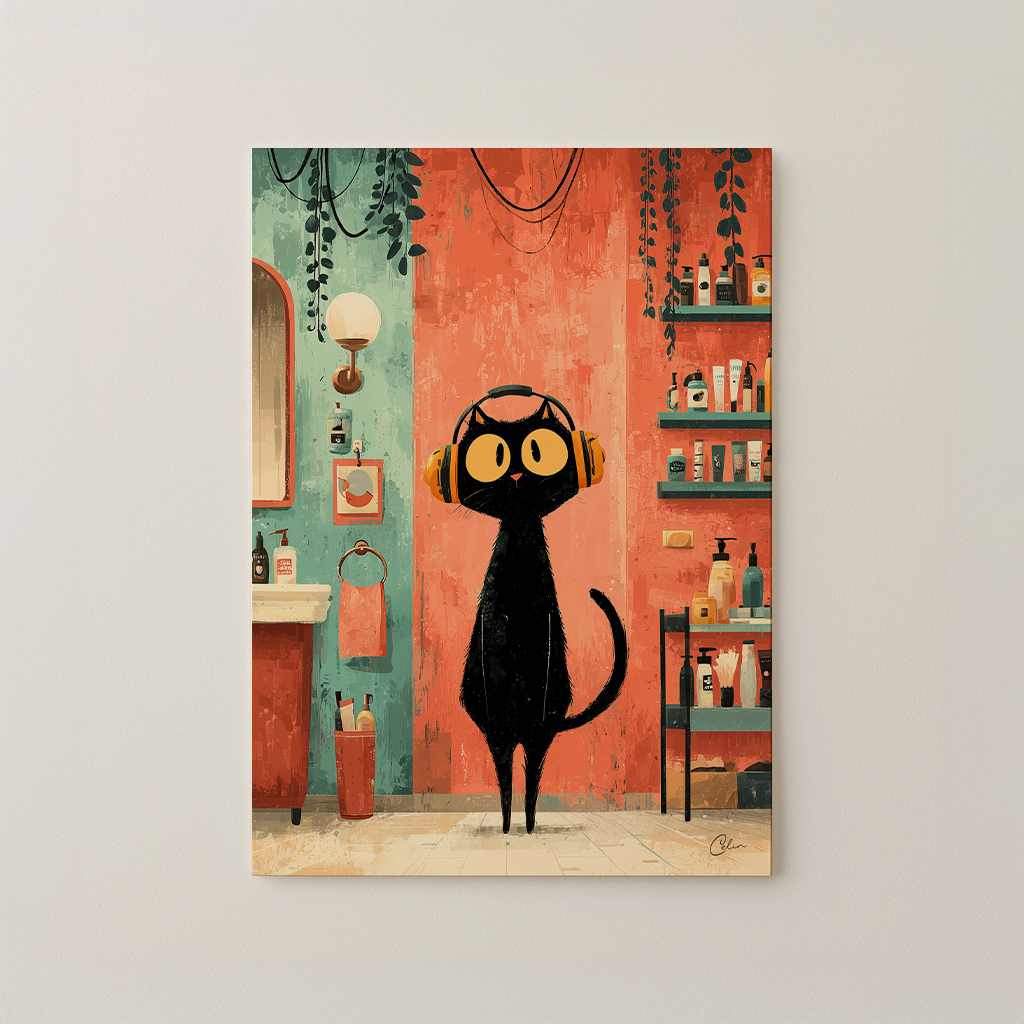 En svart katt med överdimensionerade hörlurar står med vidöppna ögon i ett udda, färgblockerat badrum fyllt med flaskor, handdukar och släpande växter. Scenen utstrålar glädje, nyfikenhet och rytm.