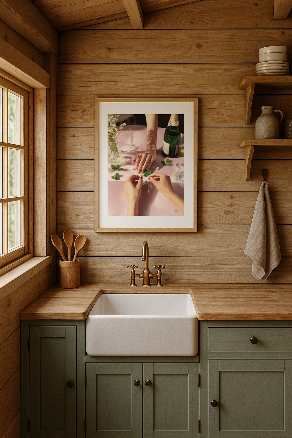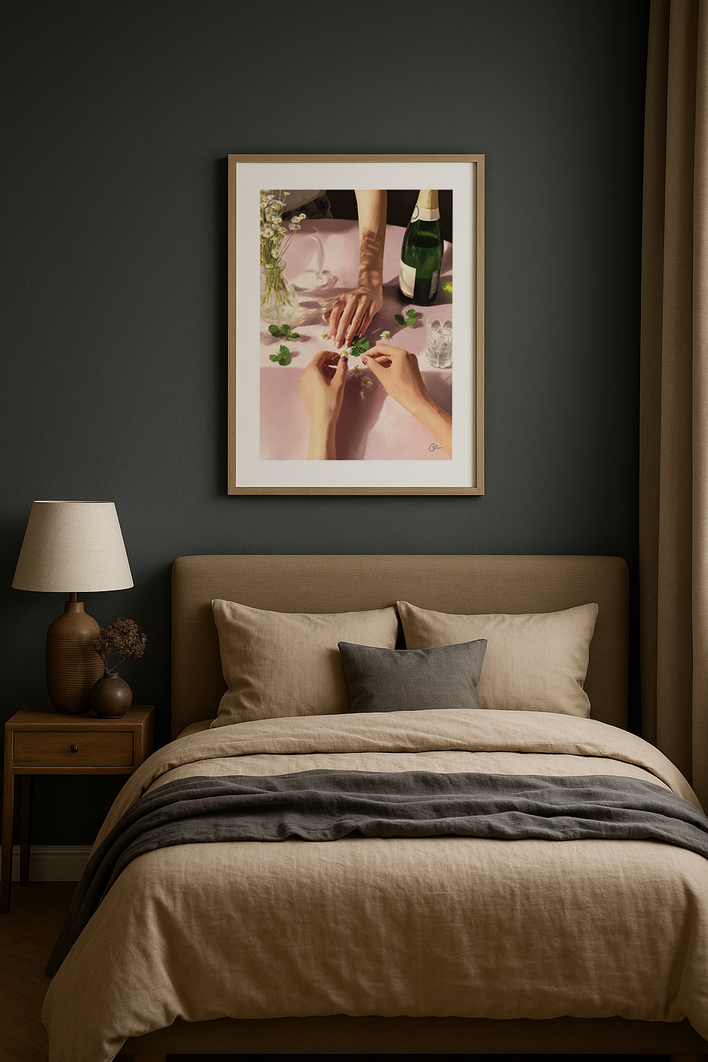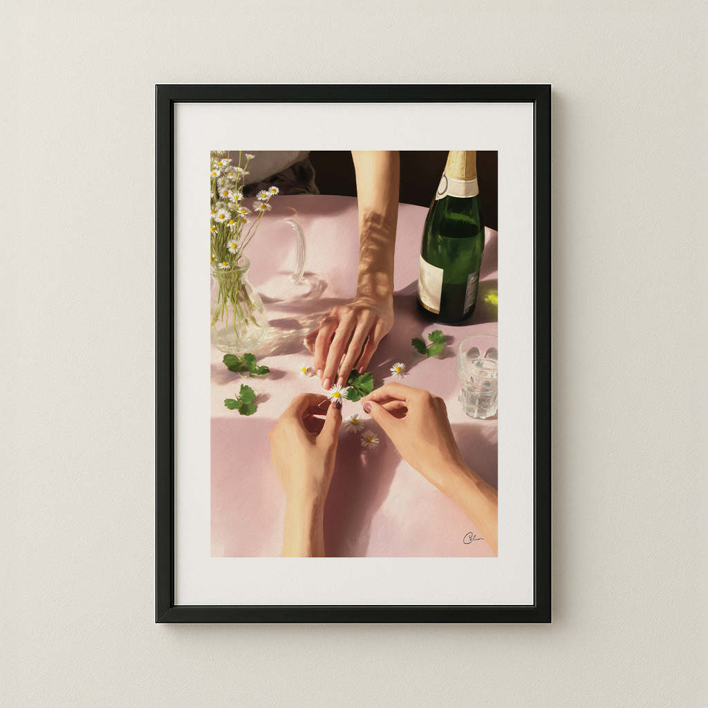 Prästkragar, gröna blad och tysta gester utspelar sig över ett pastellrosa bord, upplyst av eftermiddagssolen. En flaska champagne antyder fest, men ögonblicket känns lugnt, avslappnat, nästan filmiskt. Perfekt för kök, matplatser eller sovrum – i kombination med mjuka toner, glas och ljust trä.