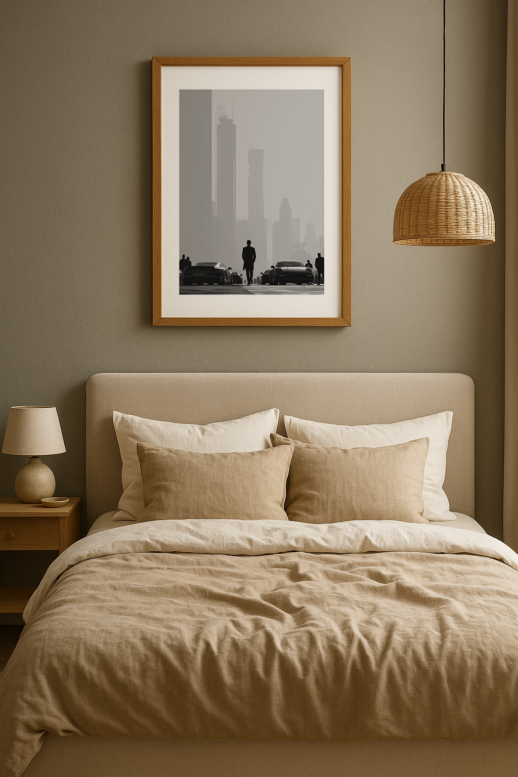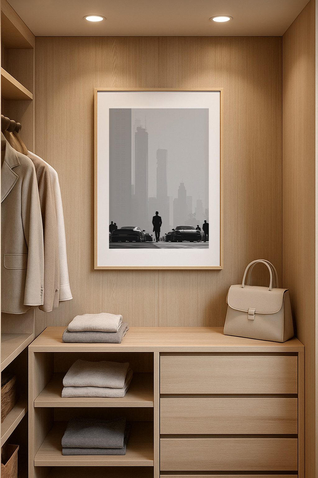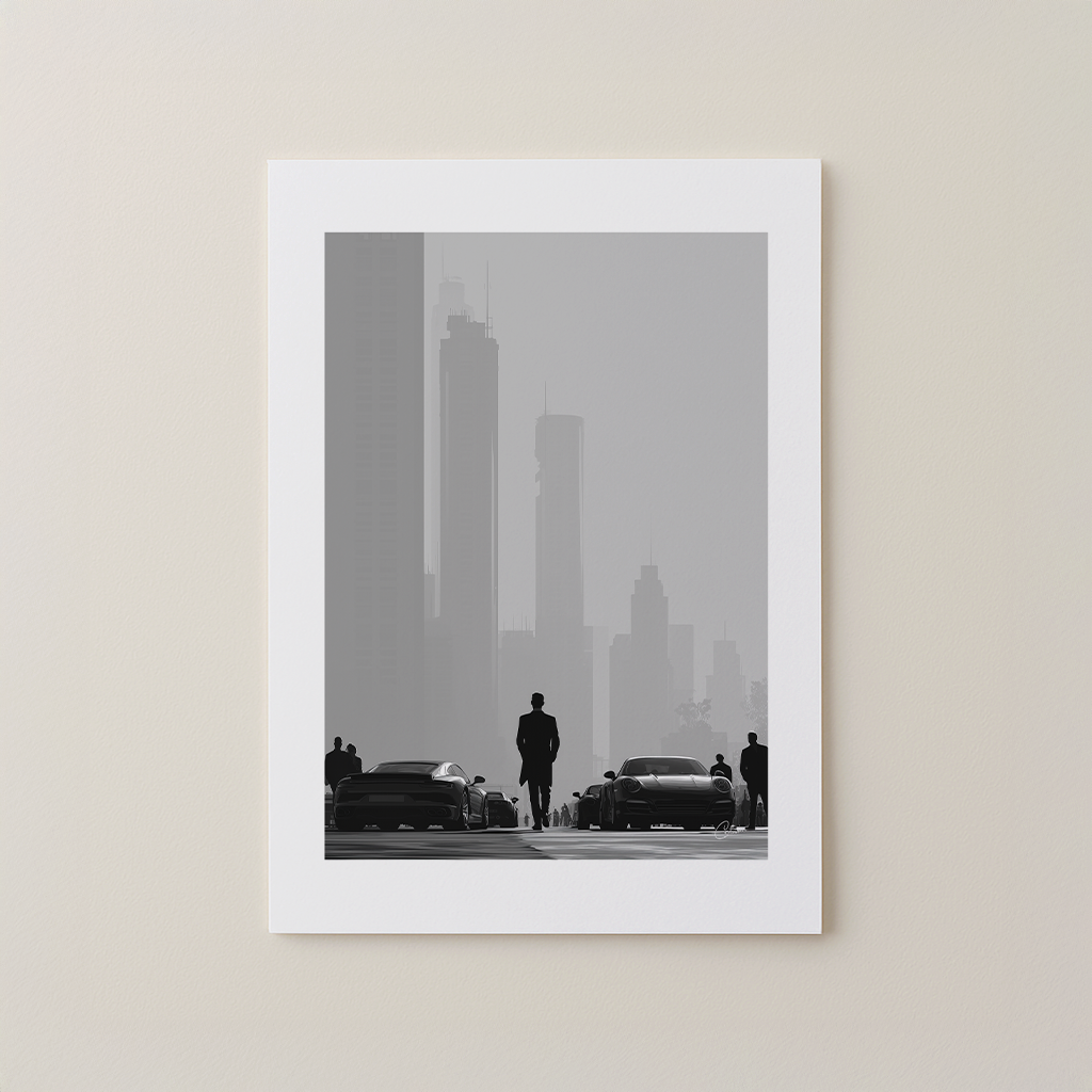 City Dominion blandar arkitektonisk kraft med bilperfektion – en filmisk svartvit scen där moderna skyskrapor reser sig bakom en balanserad silhuett och två Porsche-ikoner. Kompositionen förkroppsligar precision, framgång och rörelse – ett porträtt av ambition i rörelse. Perfekt för vardagsrum, kontor eller hall. Kompletterar interiörer med grå, svarta eller metalliska färgscheman.