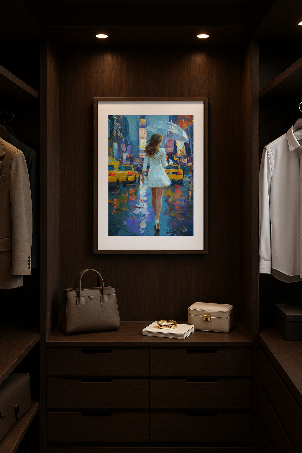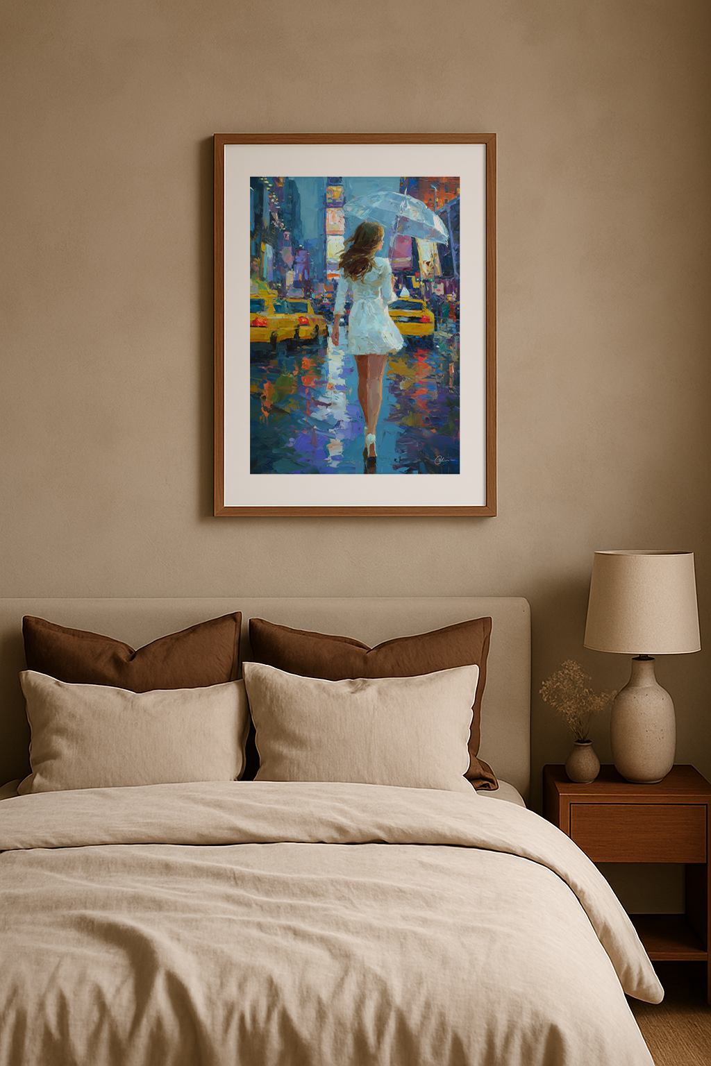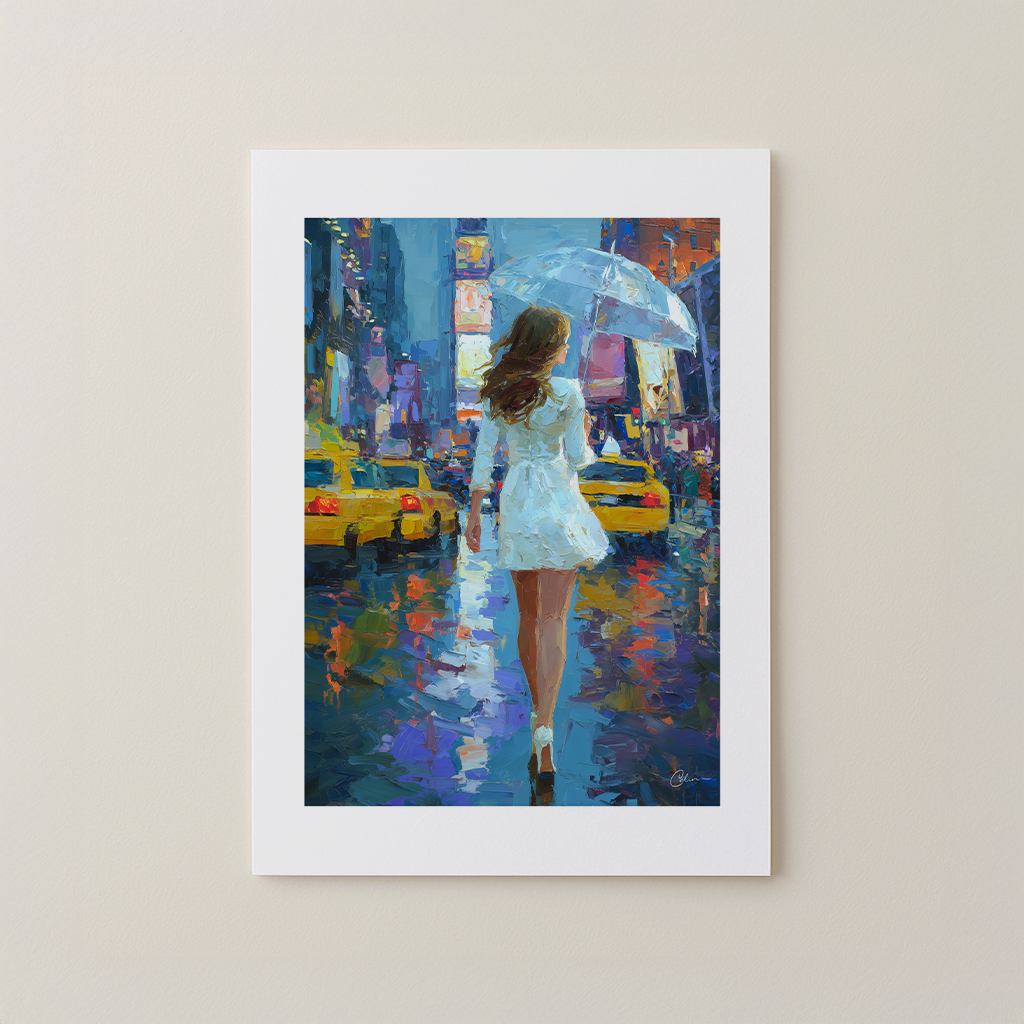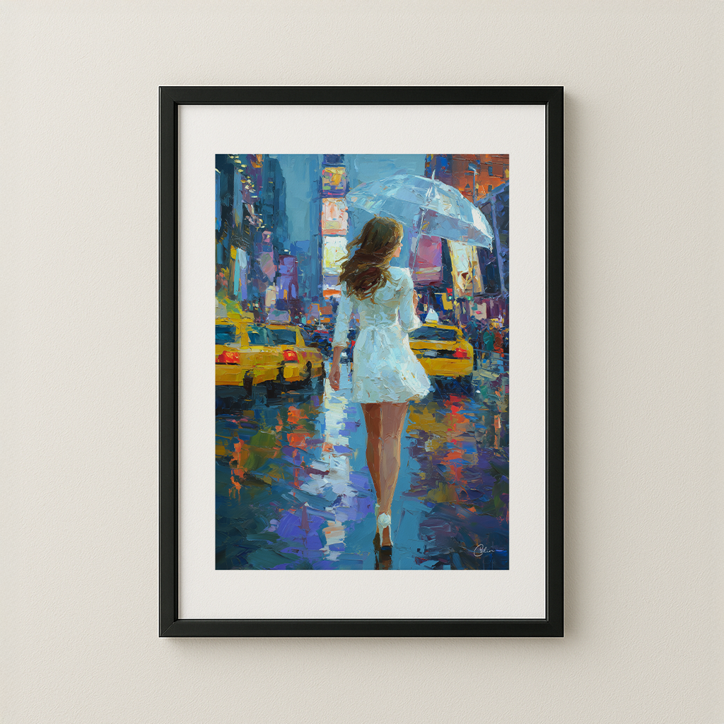 En kvinna i vitt går genom de glödande, regndränkta gatorna i en pulserande stad, med ett paraply i handen. Målat med uttrycksfulla penseldrag fångar detta verk energi, rörelse och elegans. Perfekt för sovrum, hallar eller ateljéer – smälter vackert in med djupa toner, varm belysning och konstnärliga interiörer.