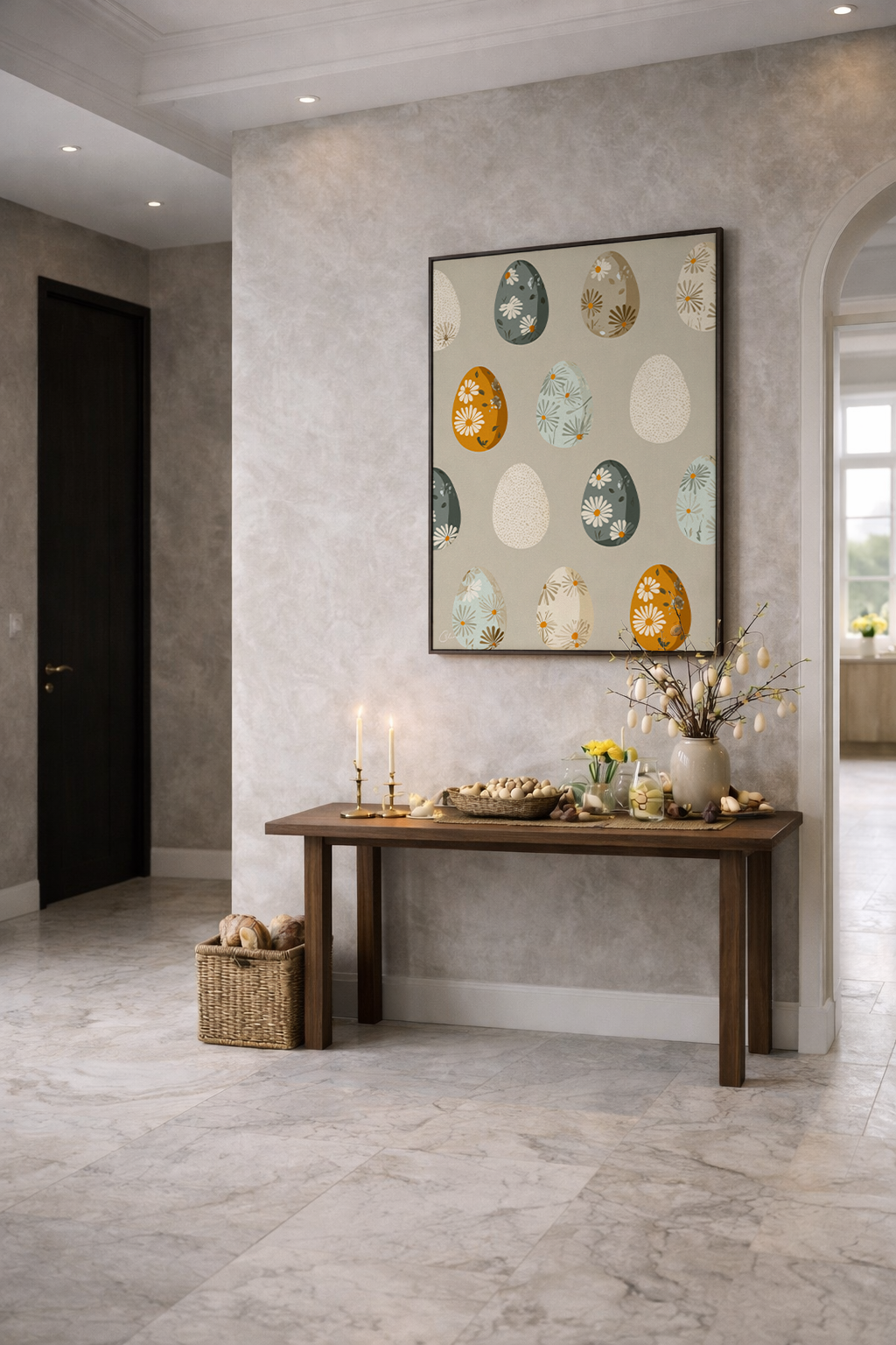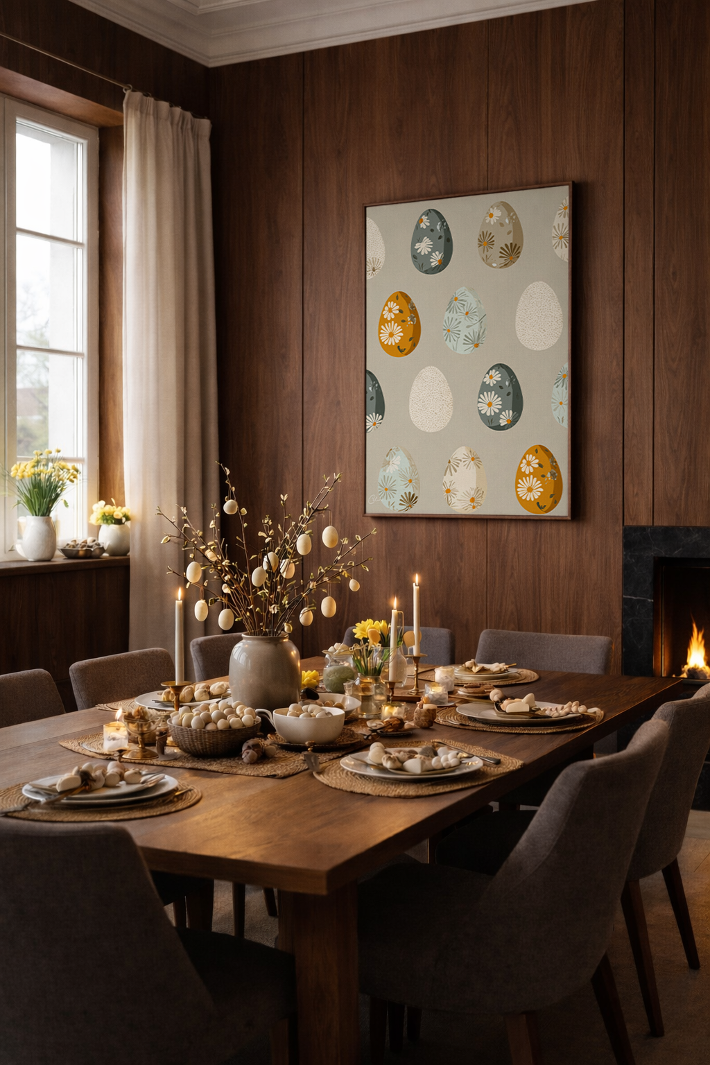 Daisy Eggs är ett mjukt vårmönster med handmålade ägg och delikata blommiga detaljer i varma neutrala toner. Den lugna pastellpaletten gör det idealiskt för kök, hall eller matsal, särskilt i skandinaviska utrymmen som lutar åt beige, dämpat gult och mjukt grönt.