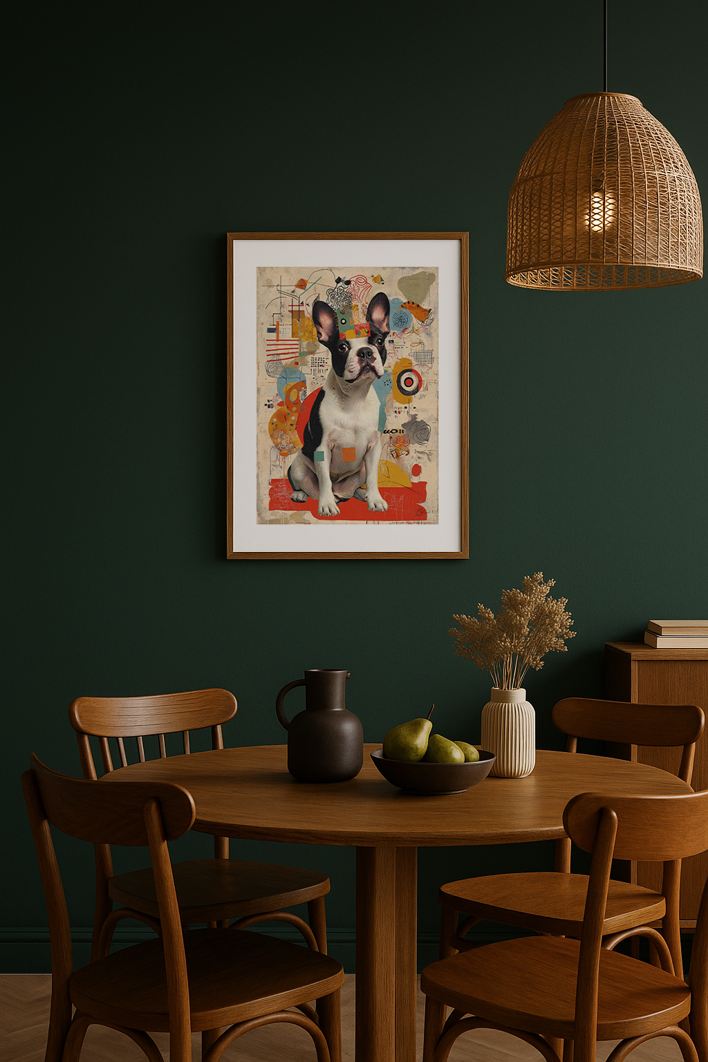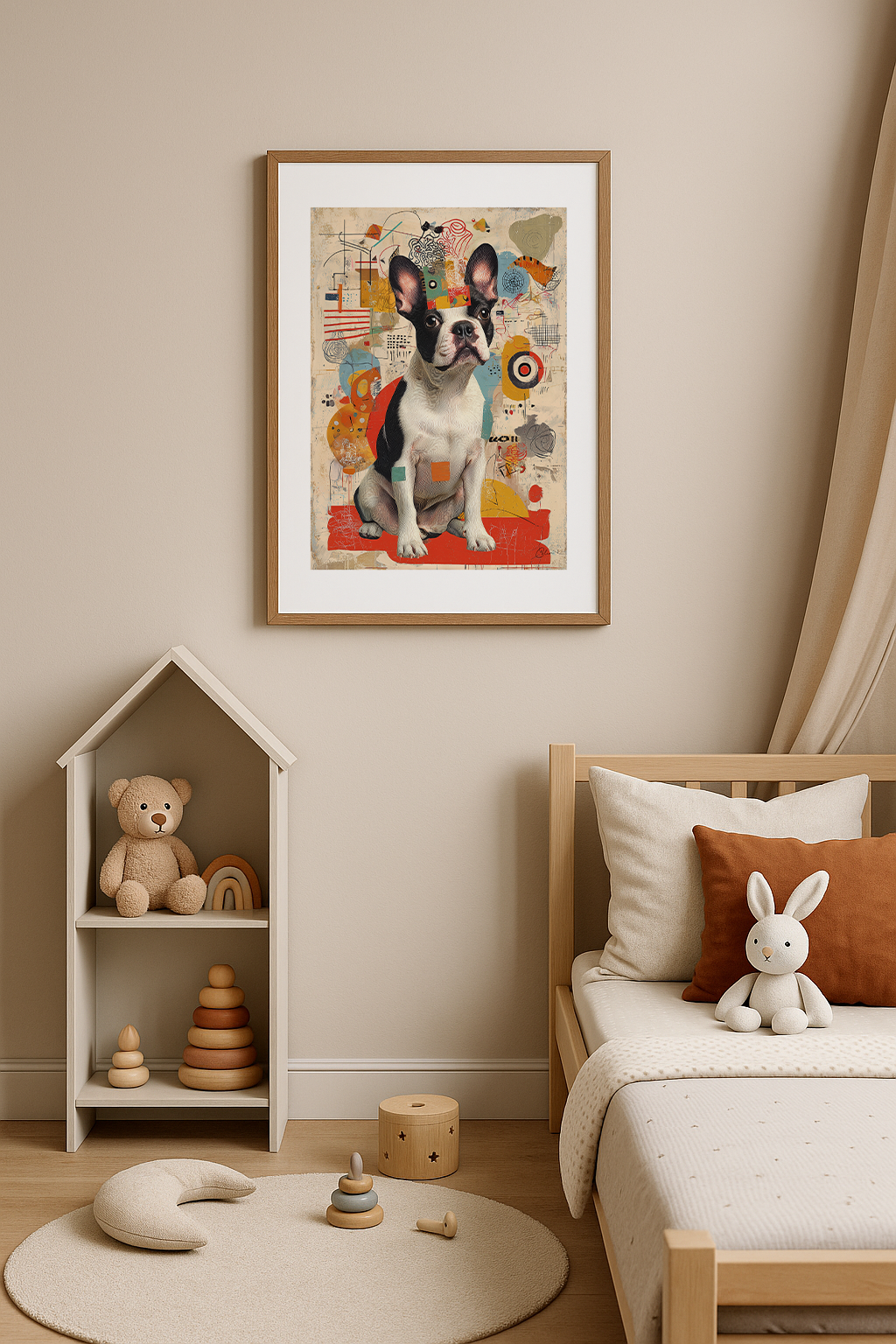 En nyfiken liten själ möter kaos och färg i denna surrealistiska hyllning till hund och sinne. Livfullt och fullt av uttrycksfull energi, ger konstverket karaktär till kreativa hem, ateljéer eller barnrum – och passar vackert med neutrala väggar eller vintagetoner.