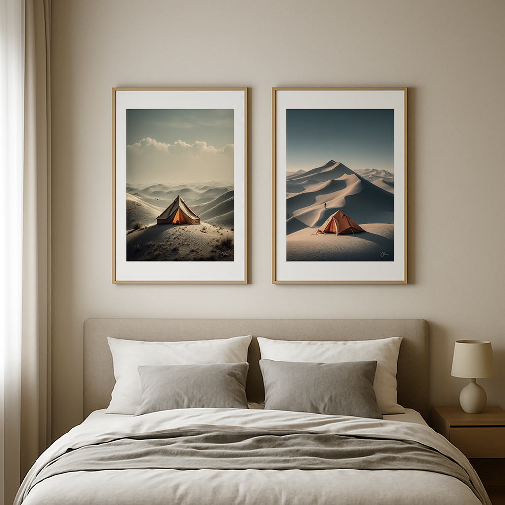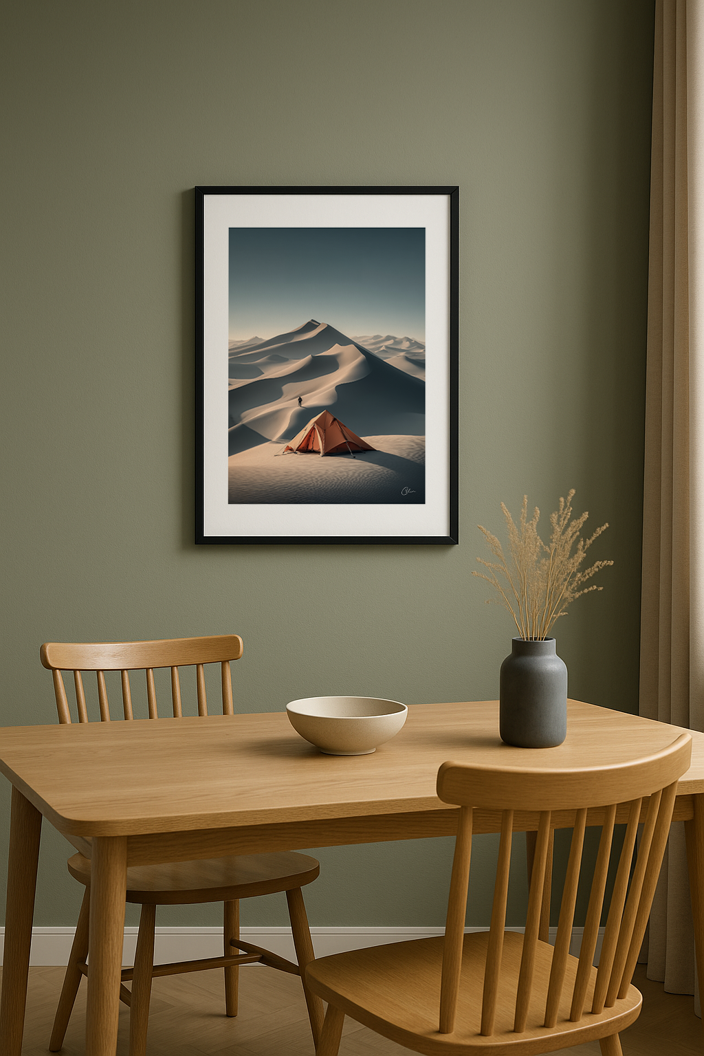 Ett ensamt orange tält vilar tyst bland skulpterade ökendyner, medan en ensam figur rör sig mot det stigande ljuset. Stillhet och skala smälter samman i en scen som känns både surrealistisk och jordnära.