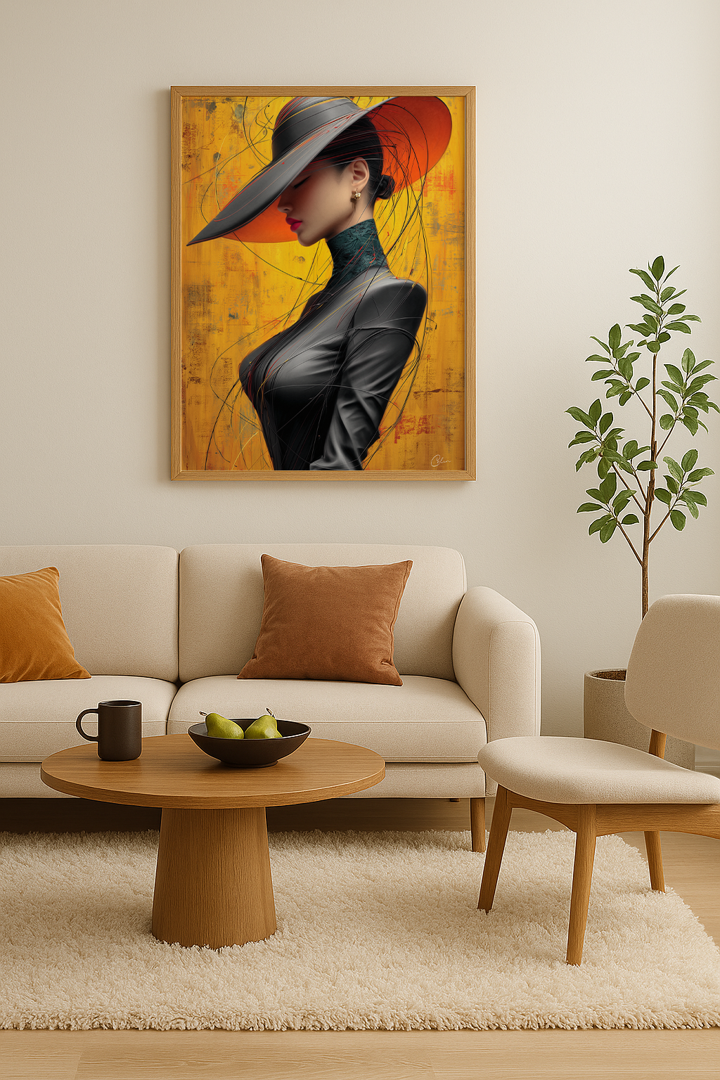 Ember Muse fångar en slående blandning av mode, attityd och modernt konstnärskap. Den djärva kontrasten mellan den djupt svarta silhuetten, den livfullt orangea undersidan av den skulpturala hatten och den texturerade gula bakgrunden skapar en bild med obestridlig närvaro. Perfekt för vardagsrum, sovrum eller walk-in-closet-miljöer, särskilt i interiörer med varma toner, mörka accenter eller modern lyxig styling.