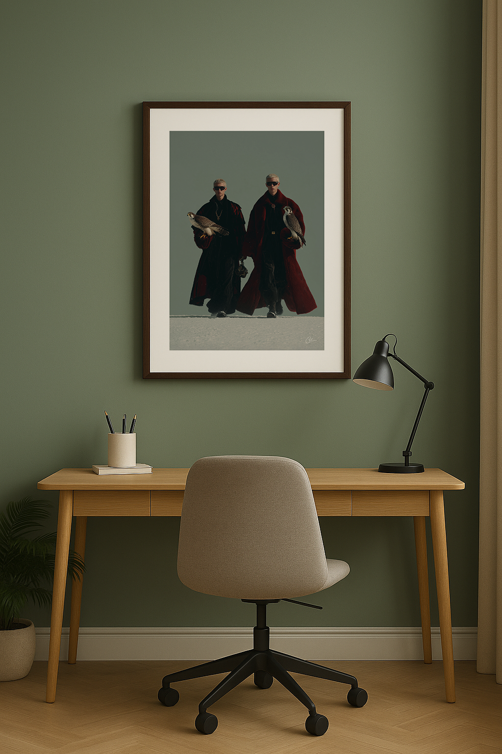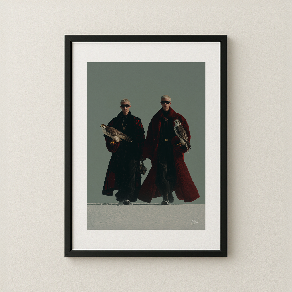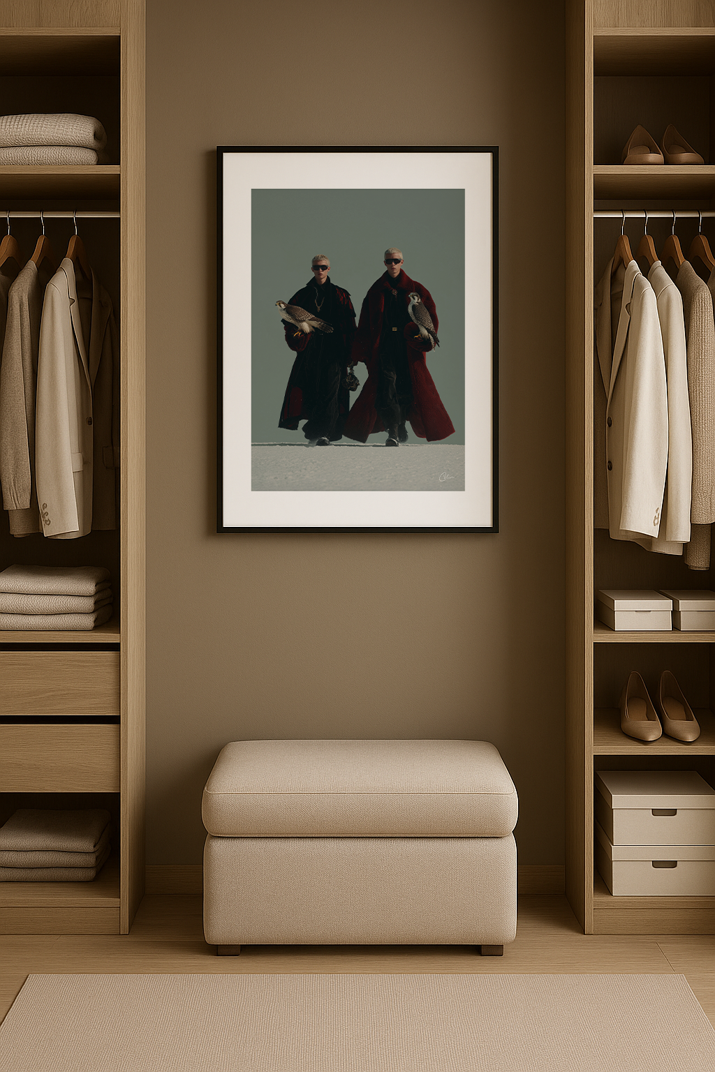 Falcon March fångar en slående high fashion-tablå där två figurer rör sig över ett snöigt landskap med självsäker närvaro. De djupröda tonerna, falkarna i händerna och de skulpturala silhuetterna skapar ett djärvt och filmiskt uttalande. Detta konstverk passar sömlöst in i vardagsrum, hall eller hemmakontor, särskilt i utrymmen inredda med grå, svart, djupröd eller dämpade neutrala paletter.