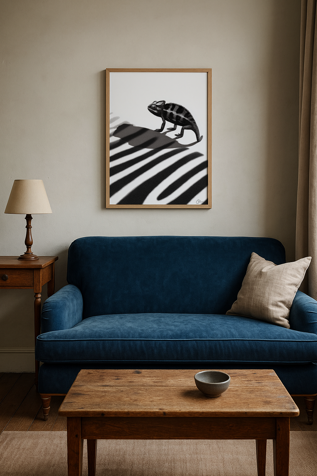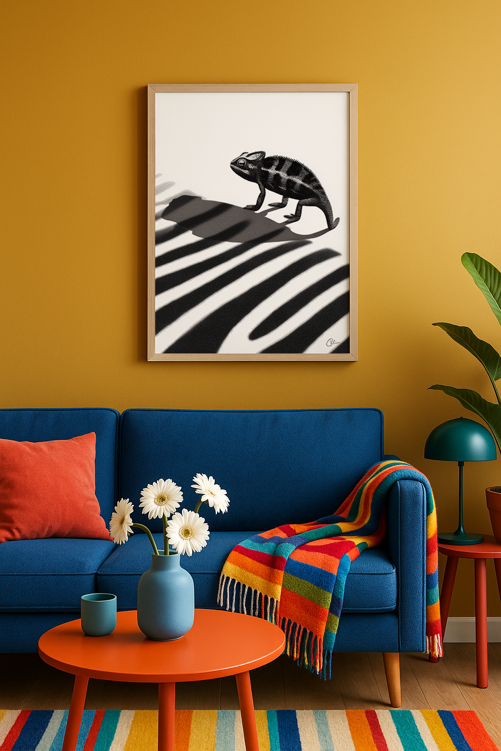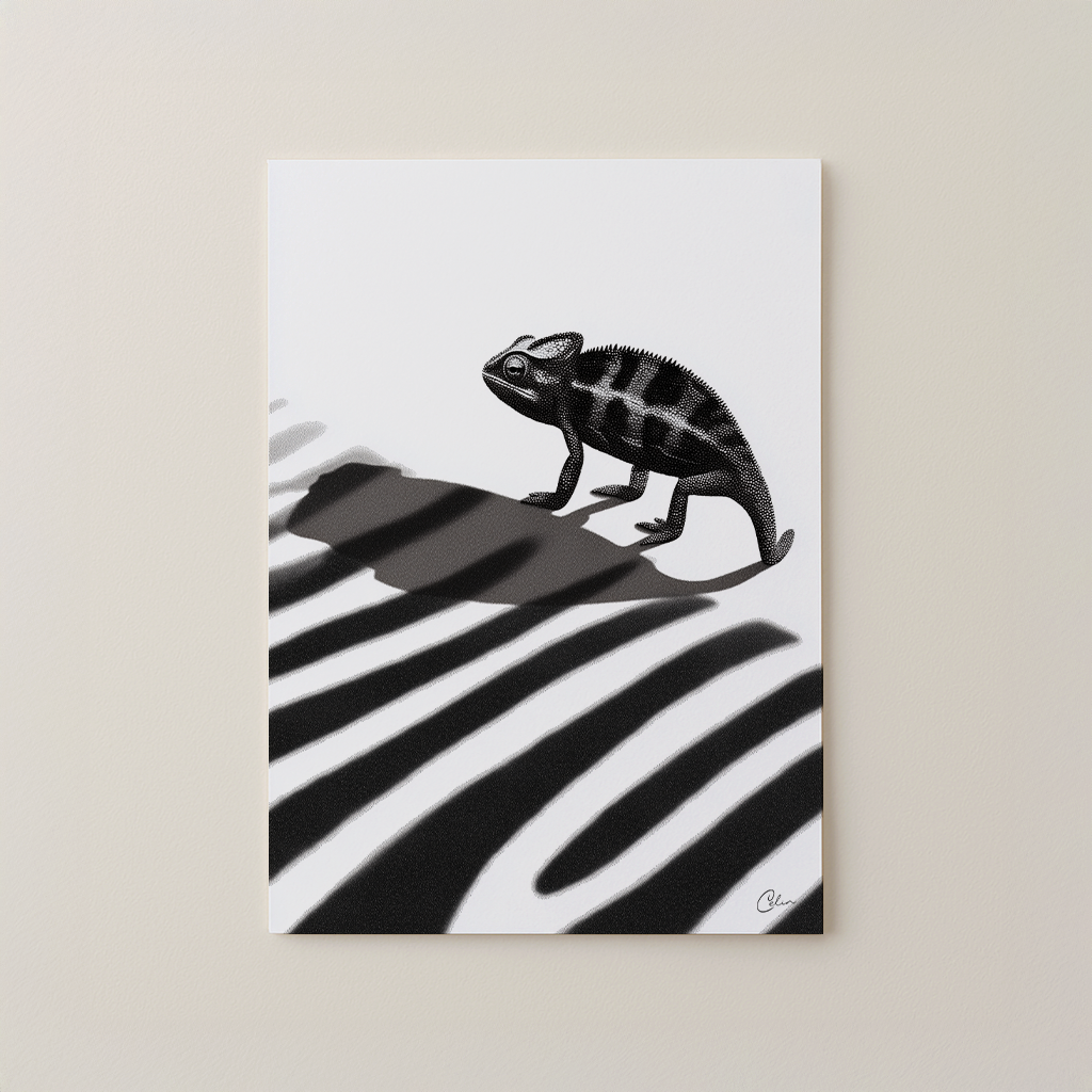 En smart minimalistisk illustration av en liten kameleont vars skugga härmar en zebras djärva ränder. Bilden, återgiven i en ren prickig stil, utforskar teman identitet, kamouflage och perception med både humor och djup. Perfekt för ett hemmakontor , en hall eller ett vardagsrum , passar detta verk moderna, monokroma och konceptuella interiörer som uppskattar visuell kvickhet och enkelhet.