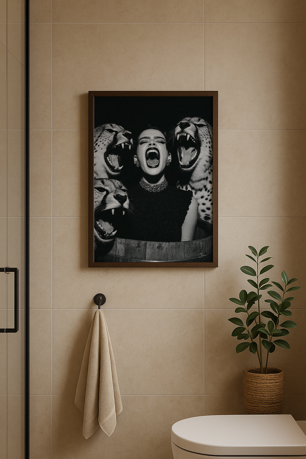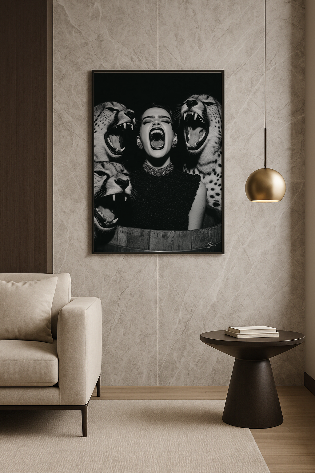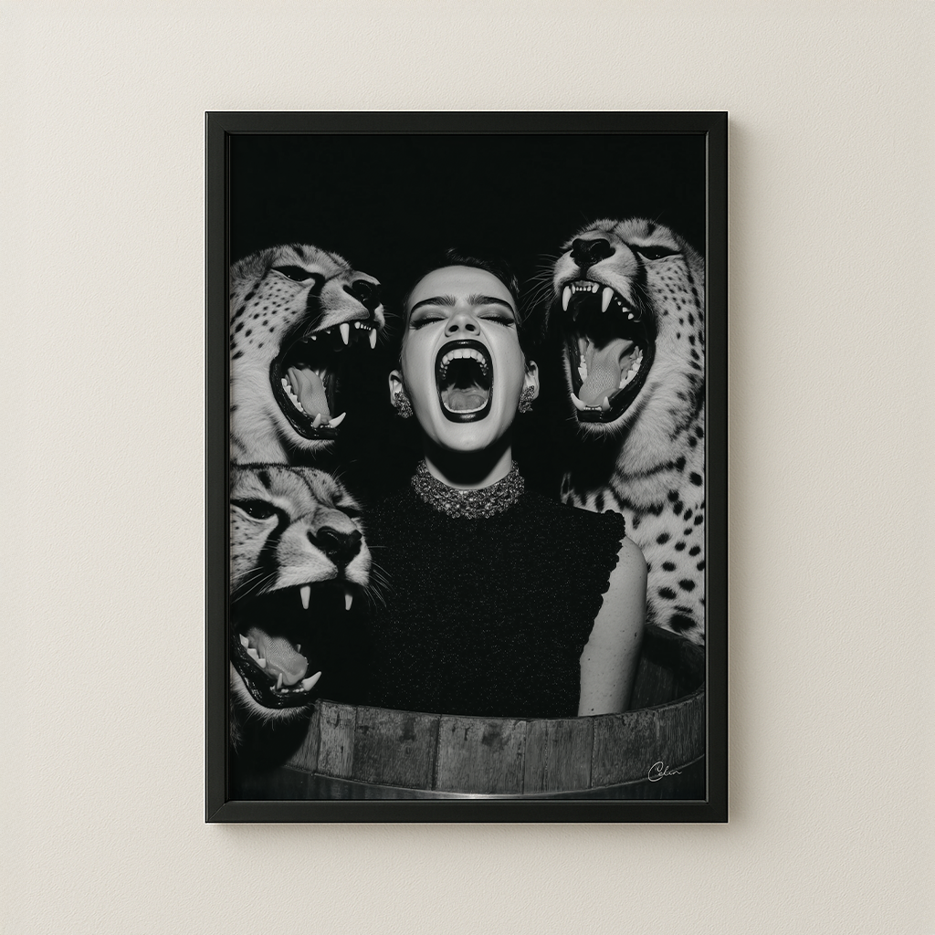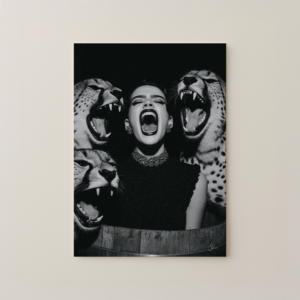 Feral Echo blandar högmodigt mode med rå djurintensitet i en slående svartvit komposition. Den centrala figuren speglar den vilda energin hos de omgivande gepardarna och skapar ett djärvt visuellt uttryck som är perfekt för vardagsrum, hall eller omklädningsrum. Dess monokroma palett ger edge och sofistikering och passar väl ihop med eleganta, moderna och dramatiska interiörer.
