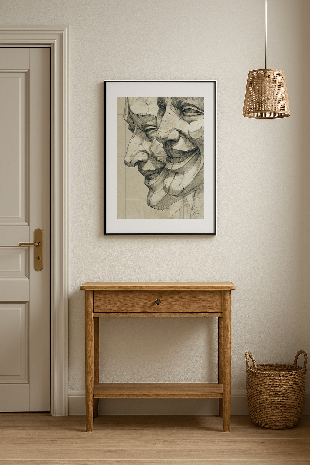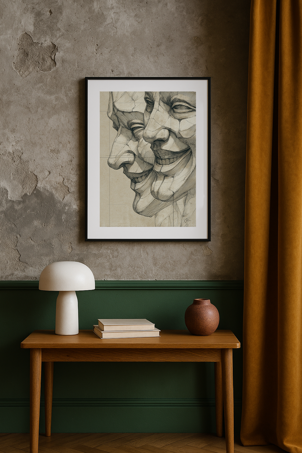 En kraftfull linjeteckning som utforskar dualitet och uttryck. De spruckna, skulpturala ansiktena förenar precision och känsla i en mästerlig balans mellan geometri och mänsklighet. Perfekt för hemmakontoret, hallen eller vardagsrummet.