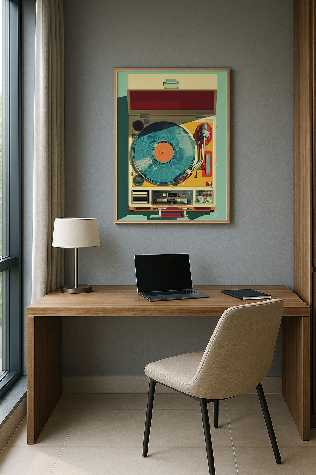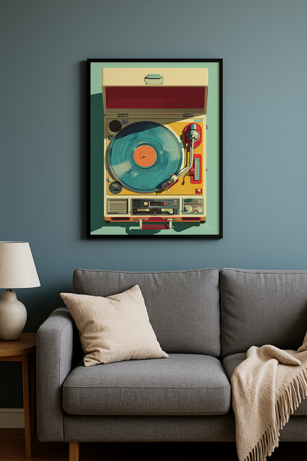 En djärv, färgglad skivspelare spelar en blågrön skiva i solskenet – retro, rolig och full av personlighet. Den här pjäsen ger liv åt alla rum där musik, nostalgi eller lekfull stil spelar roll. Perfekt för vardagsrum, spelrum eller hemmakontor med vintagekänsla eller djärva färgaccenter.