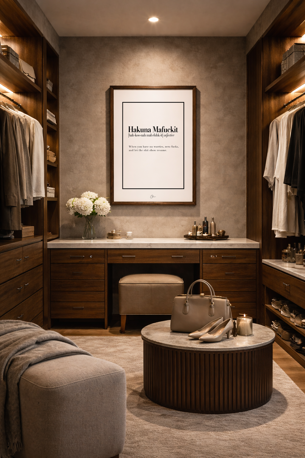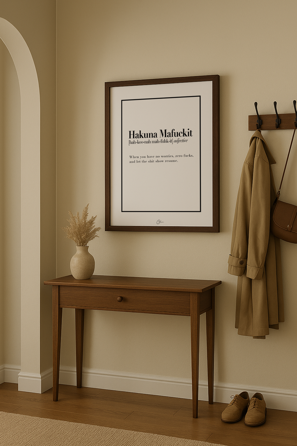 Hakuna Mafuckit definierar den bekymmerslösa andan av noll bekymmer och noll knull, presenterad i en ren typografisk layout med en djärv, humoristisk touch. Perfekt för moderna utrymmen som uppskattar attityddriven väggkonst och en touch av komisk lättnad. Fungerar bra i vardagsrum, hemmakontor eller hall tack vare sin minimalistiska komposition och slående uttryckssätt.