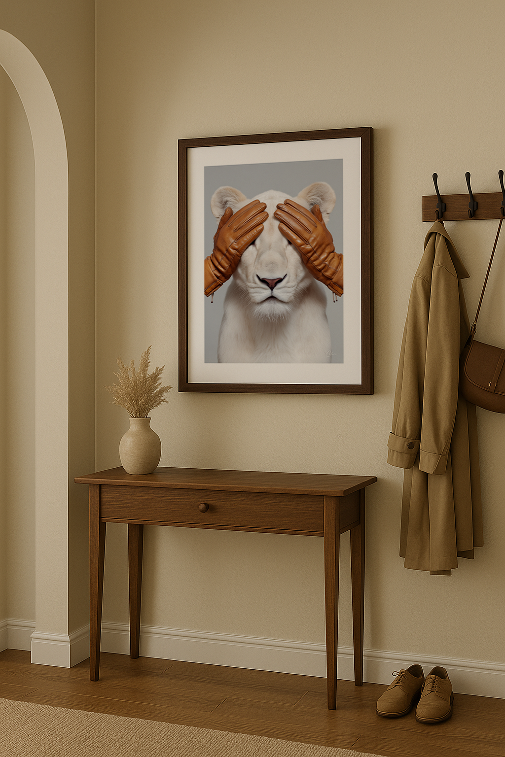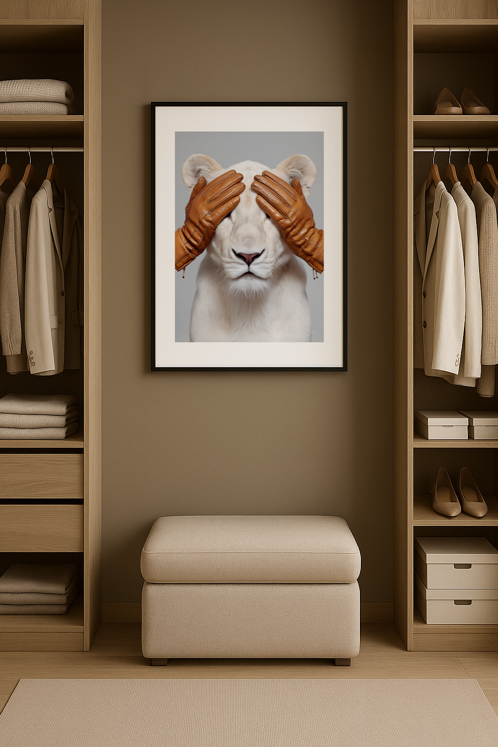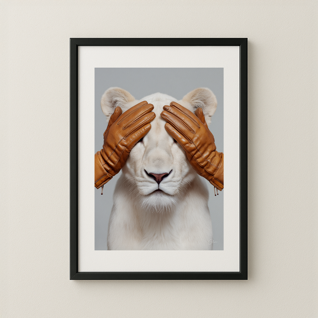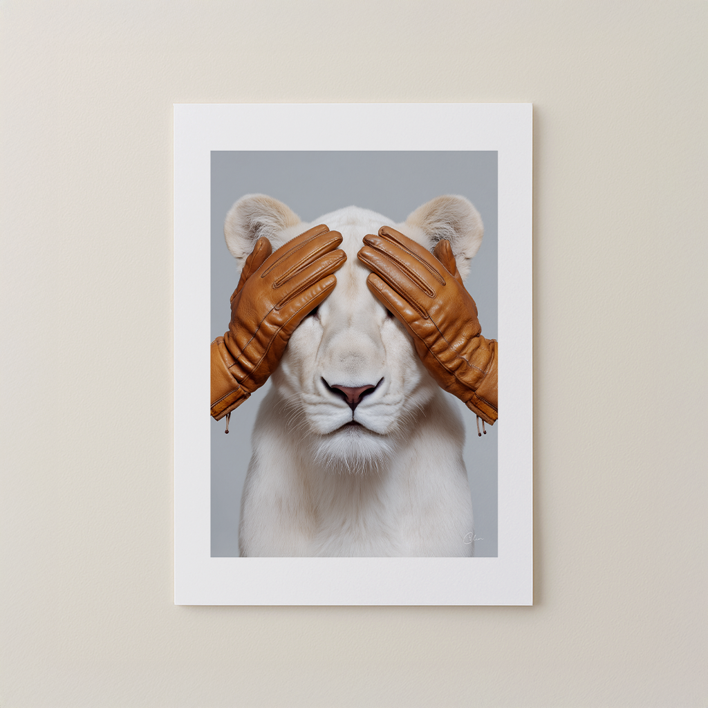 Hidden Majesty presenterar ett slående porträtt av ett vitt lejon, varsamt täckt av varma läderhandskar. Den rena studiobakgrunden och de skulpturala texturerna skapar ett djärvt men elegant visuellt uttryck. Detta konstverk passar utmärkt i vardagsrum, hemmakontor eller hall, särskilt i interiörer med beige, vitt, brunt läder, grått eller andra mjuka moderna neutrala färger.