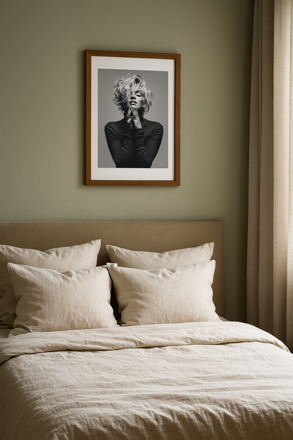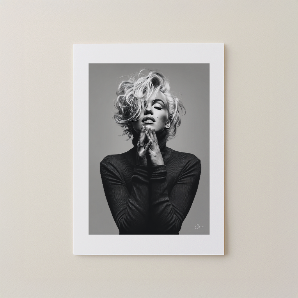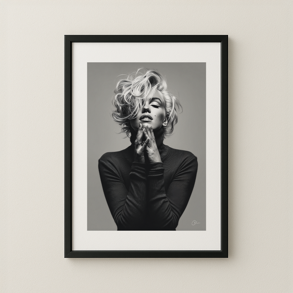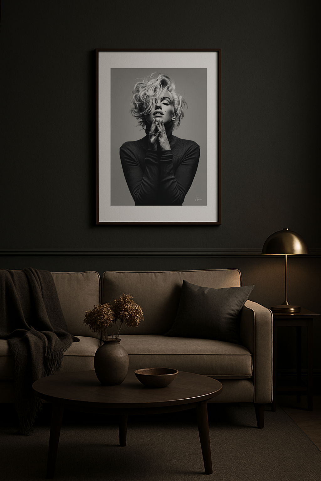 Ett stiliserat porträtt av Marilyn Monroe i monokroma toner – tidlöst, djärvt och obehindrat magnetiskt. Hennes uttryck rymmer både mjukhet och styrka, inramat av vindpinad elegans. Perfekt för sovrum, klädkammare eller vardagsrum – passar vackert ihop med minimalistiska inredningar, djärva ramar och mjukt ljus.