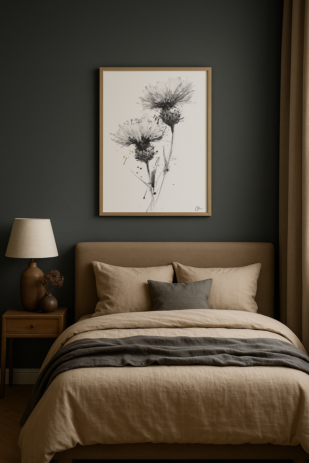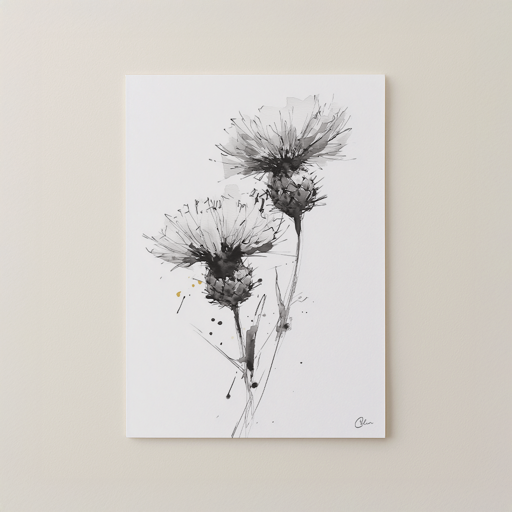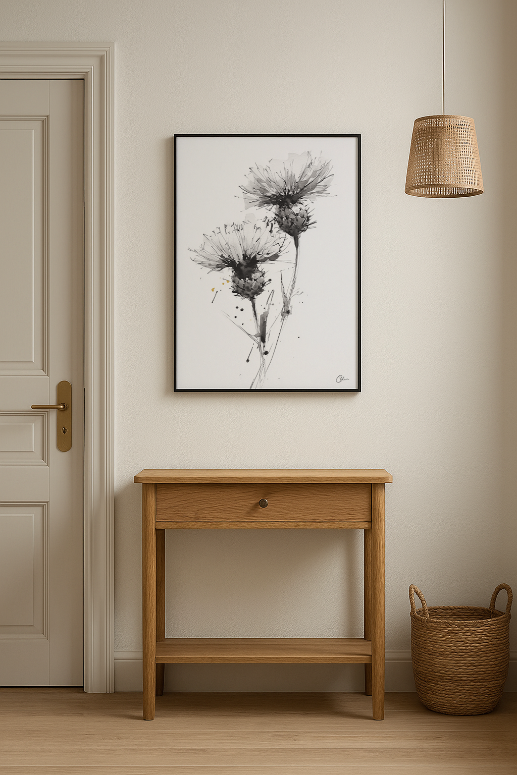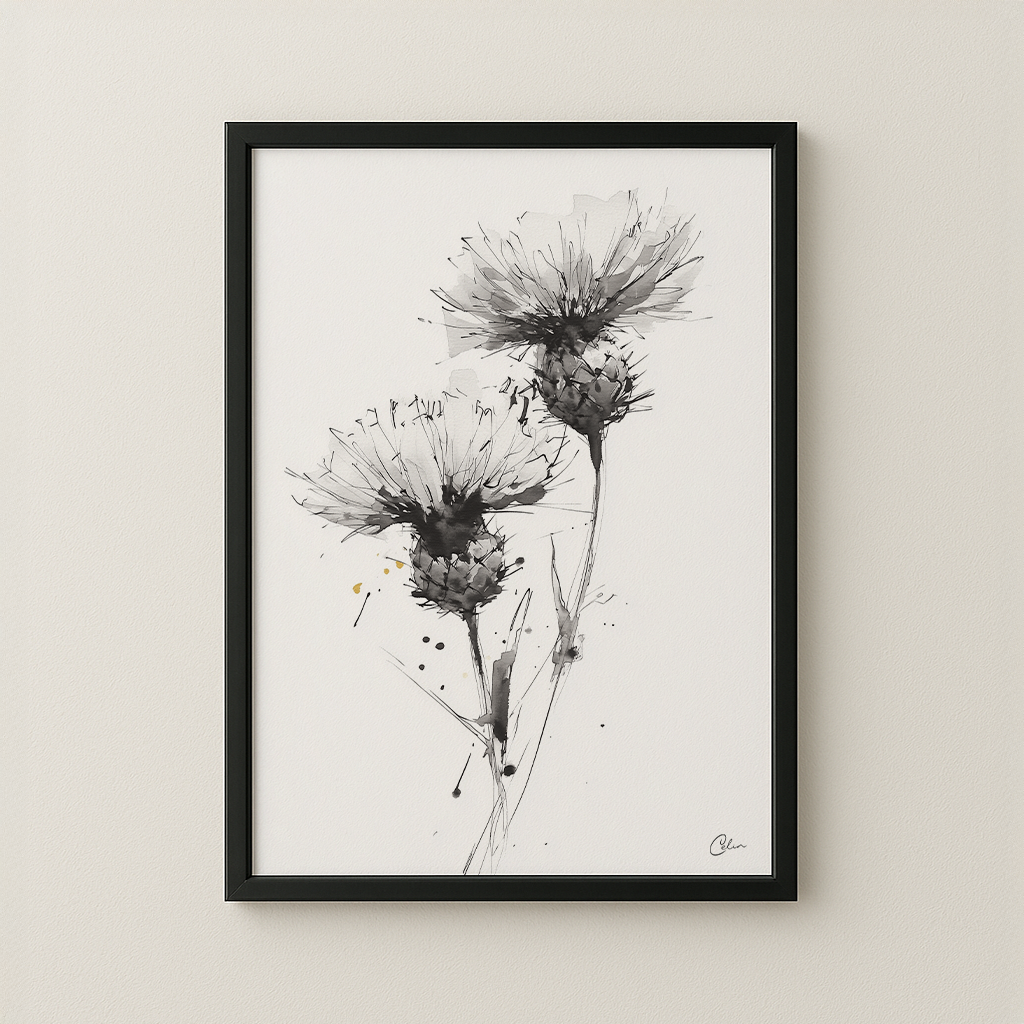 En uttrycksfull bläckillustration av två tistlar, som blandar skarpa detaljer med mjuka akvarellfärger och flytande linjer. Den monokroma paletten, accentuerad av subtila bläckstänk, ger verket en rå elegans som fångar både delikatess och vildhet. Perfekt för en hall , ett sovrum eller ett hemmakontor , framhäver detta konstverk interiörer som föredrar minimalism, nordiska toner och organiska element.