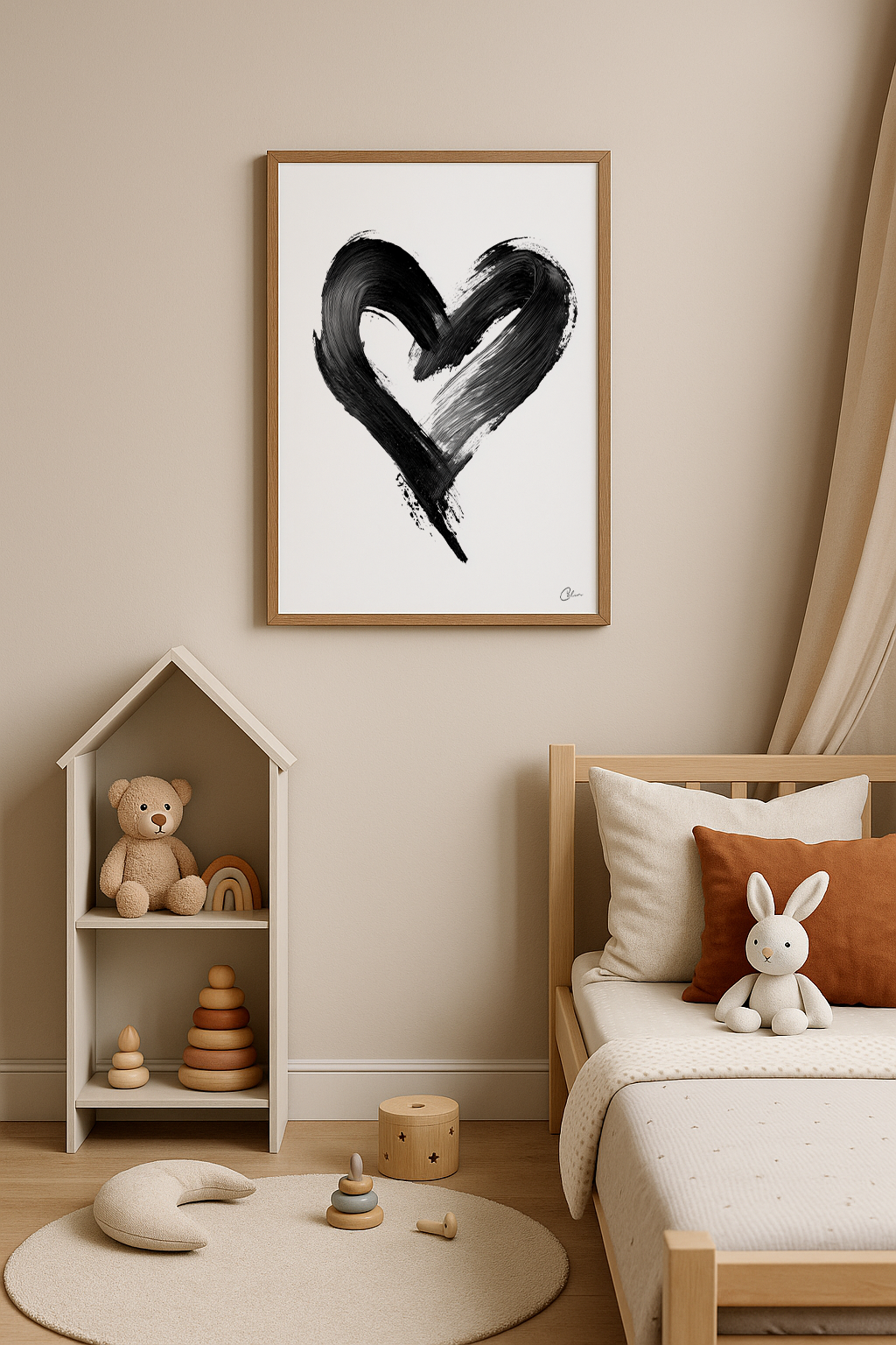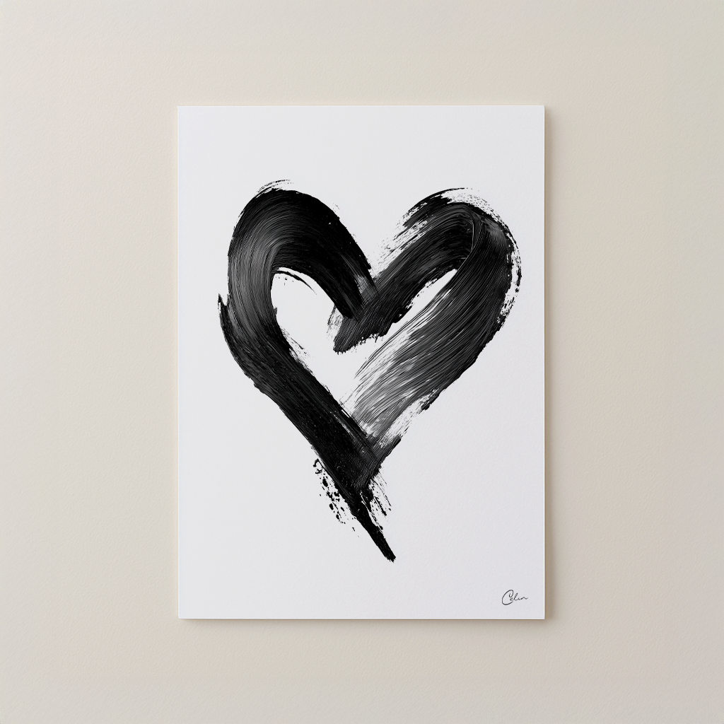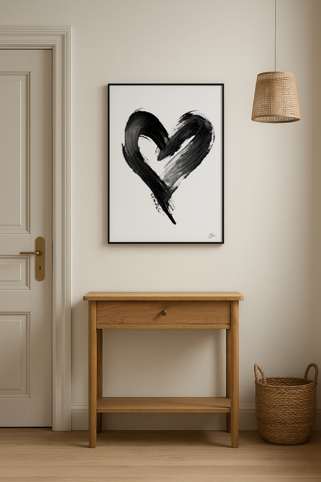 Ett djärvt svartvitt hjärta målat med råa penseldrag, som fångar både styrka och sårbarhet i sin ofullkomliga form. Den minimalistiska kompositionen utstrålar ärlighet och känsla, vilket gör den till ett slående statement-piece. Perfekt för sovrum , vardagsrum eller hall , passar den enkelt in i moderna, skandinaviska eller monokroma interiörer.