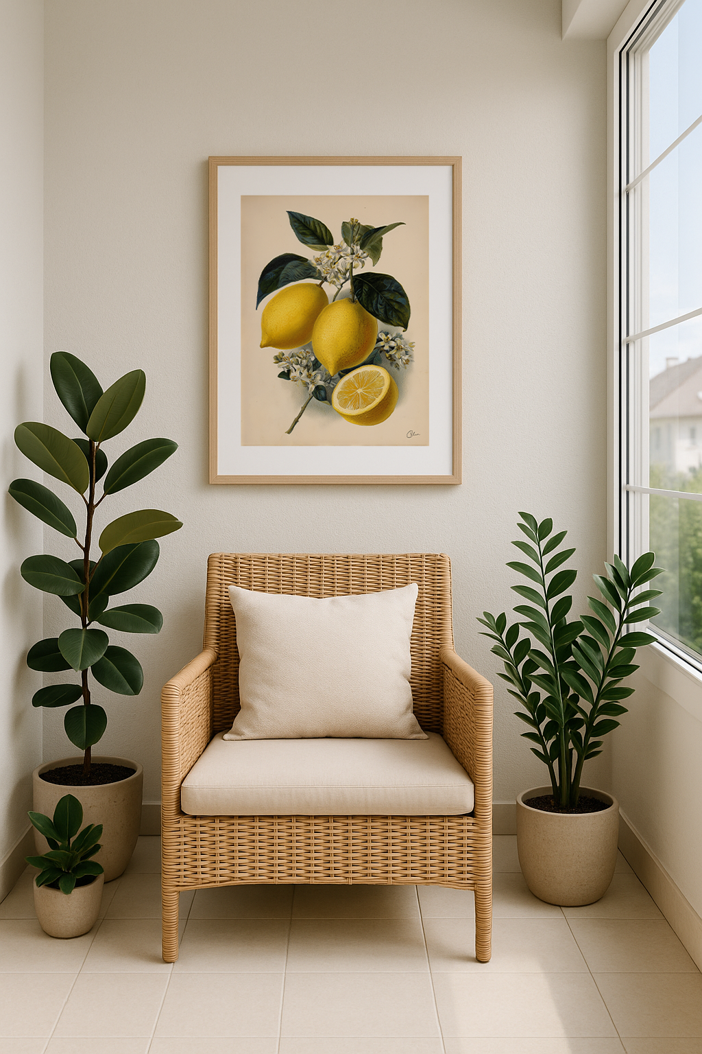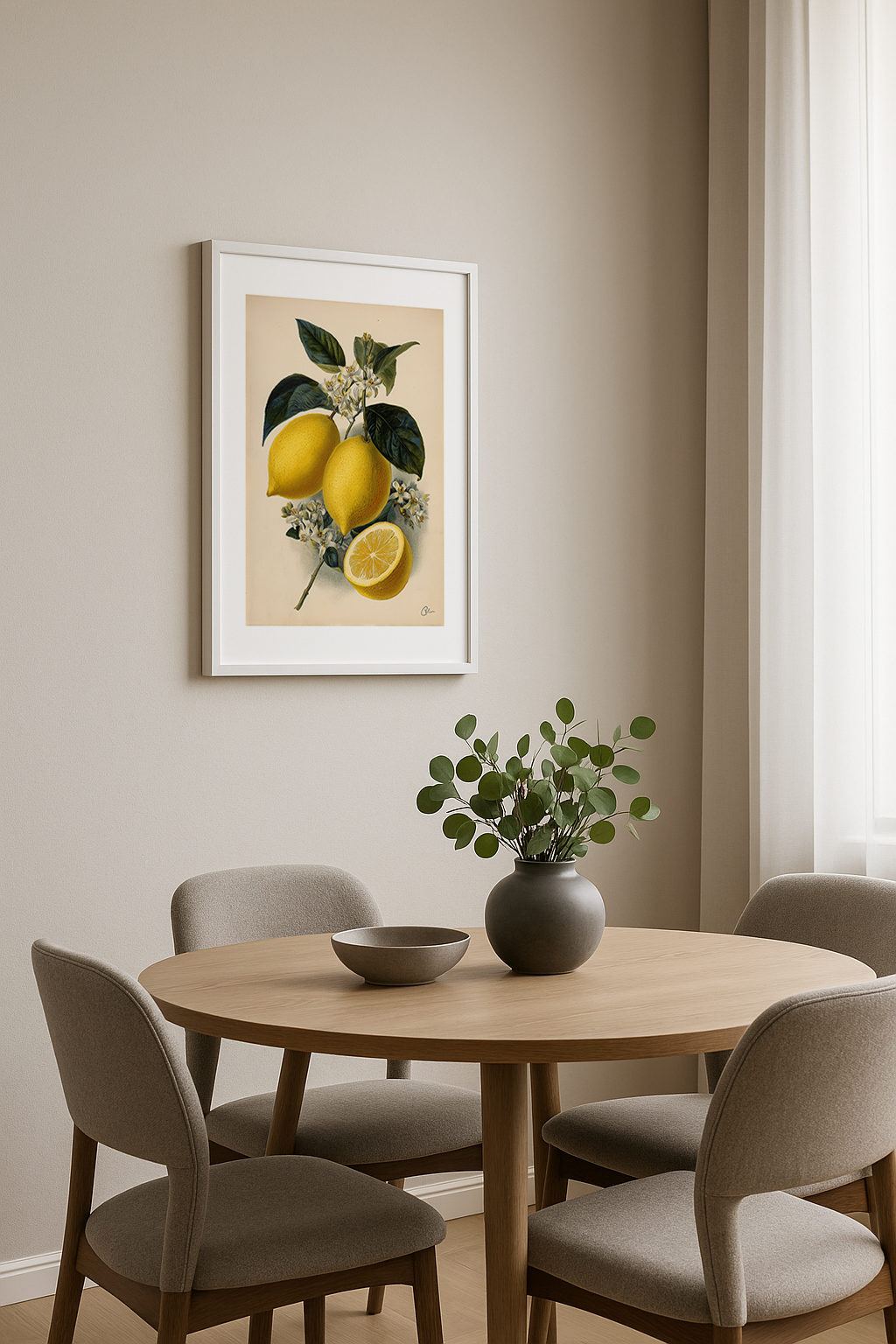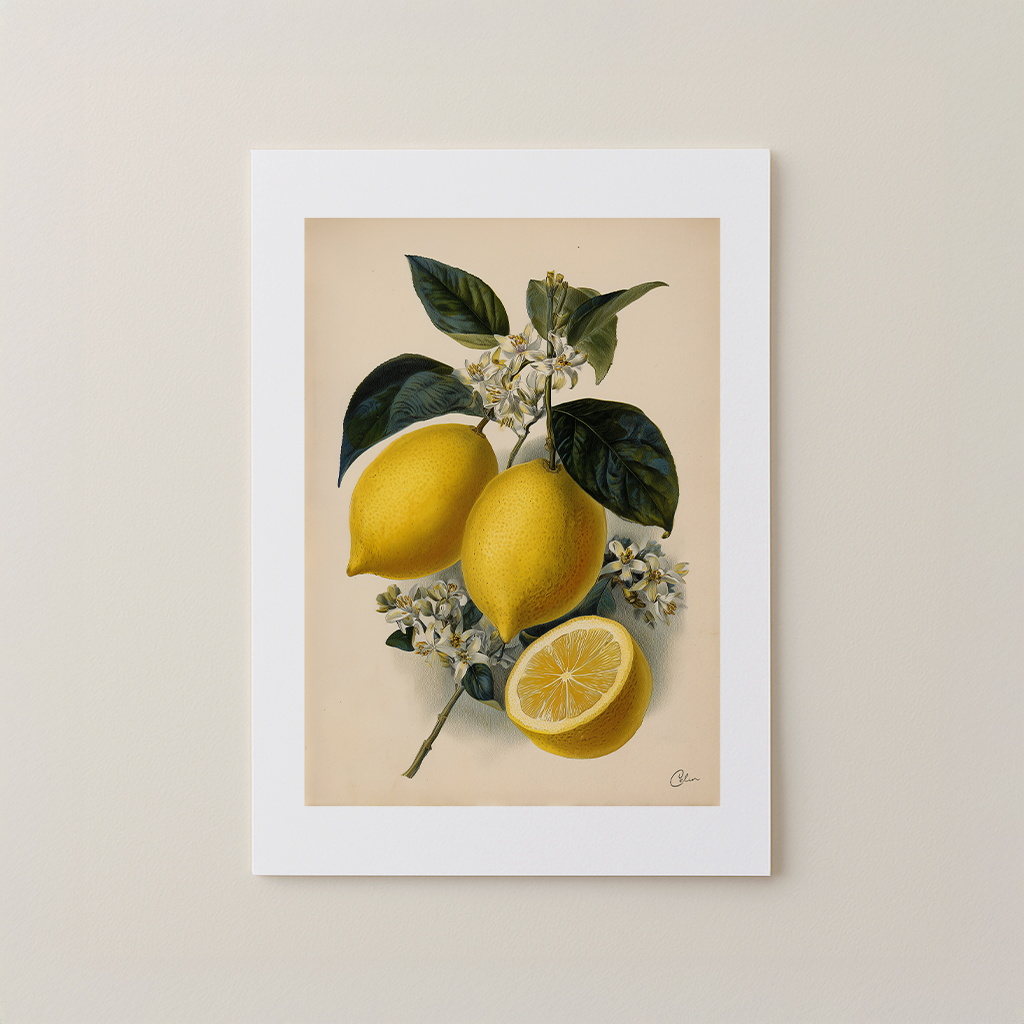 Botaniskt tryck med mogna citroner och blommor – som en solstråle i ett stilleben.
