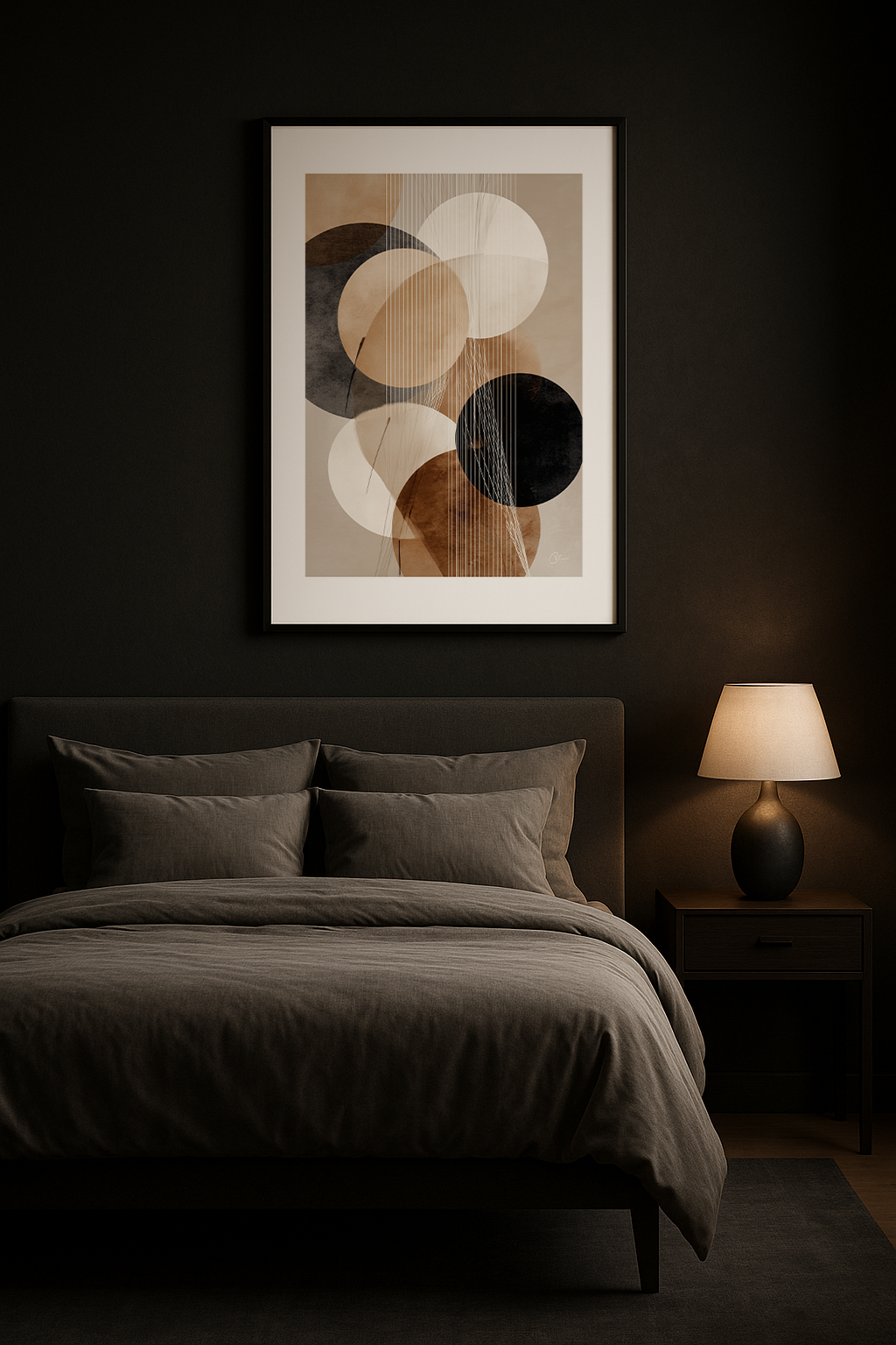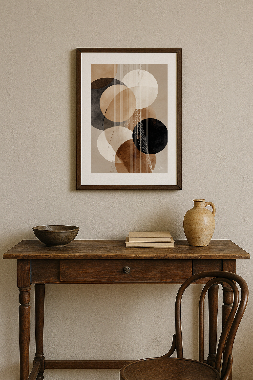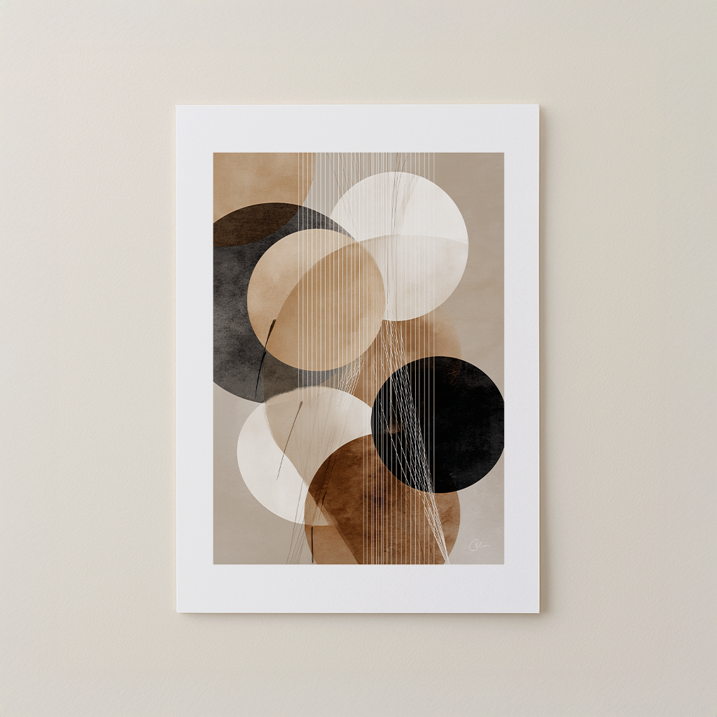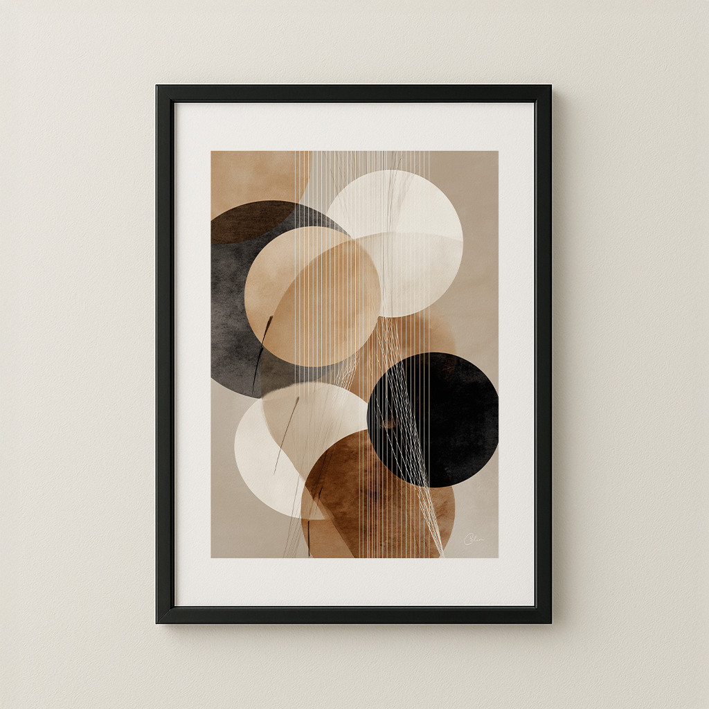 Linear Balance blandar mjuka geometriska former med fina vertikala linjer, vilket skapar ett lugnt men ändå strukturerat abstrakt uttryck. Den varma paletten av beige, brunt och svart gör att den passar perfekt in i vardagsrum, matsal eller hemmakontor. Dess moderna minimalistiska estetik passar naturligt ihop med moderna, skandinaviska och neutrala inredningsmiljöer.