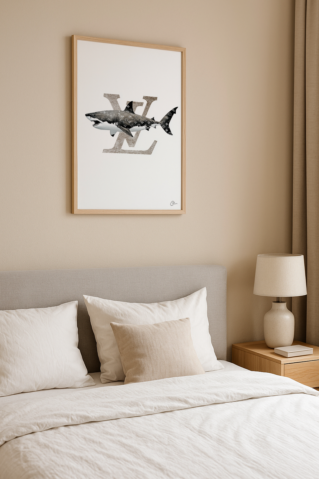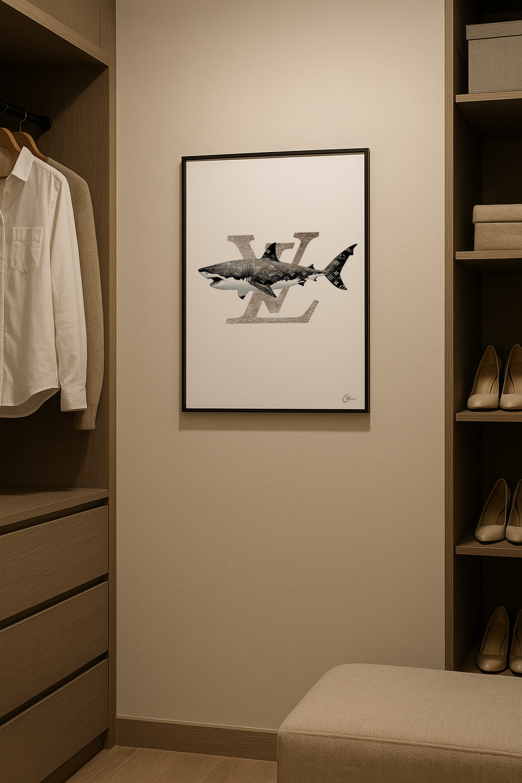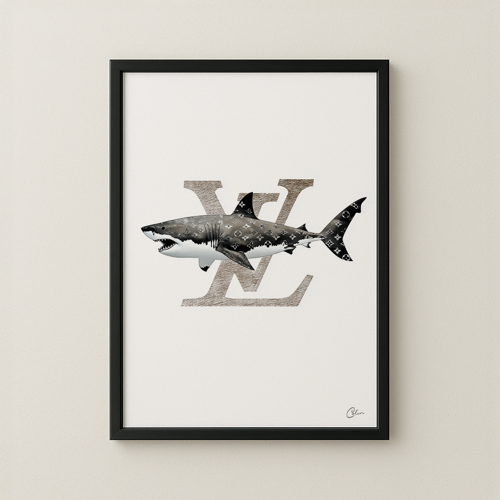 En vithaj simmar över en skarp vit bakgrund, dess kropp höljd i ett ikoniskt monogramtryck. Djärv, ironisk och modeinriktad. Passar perfekt i klädkammare, sovrum eller kreativa utrymmen med rena linjer och lyxiga accenter.