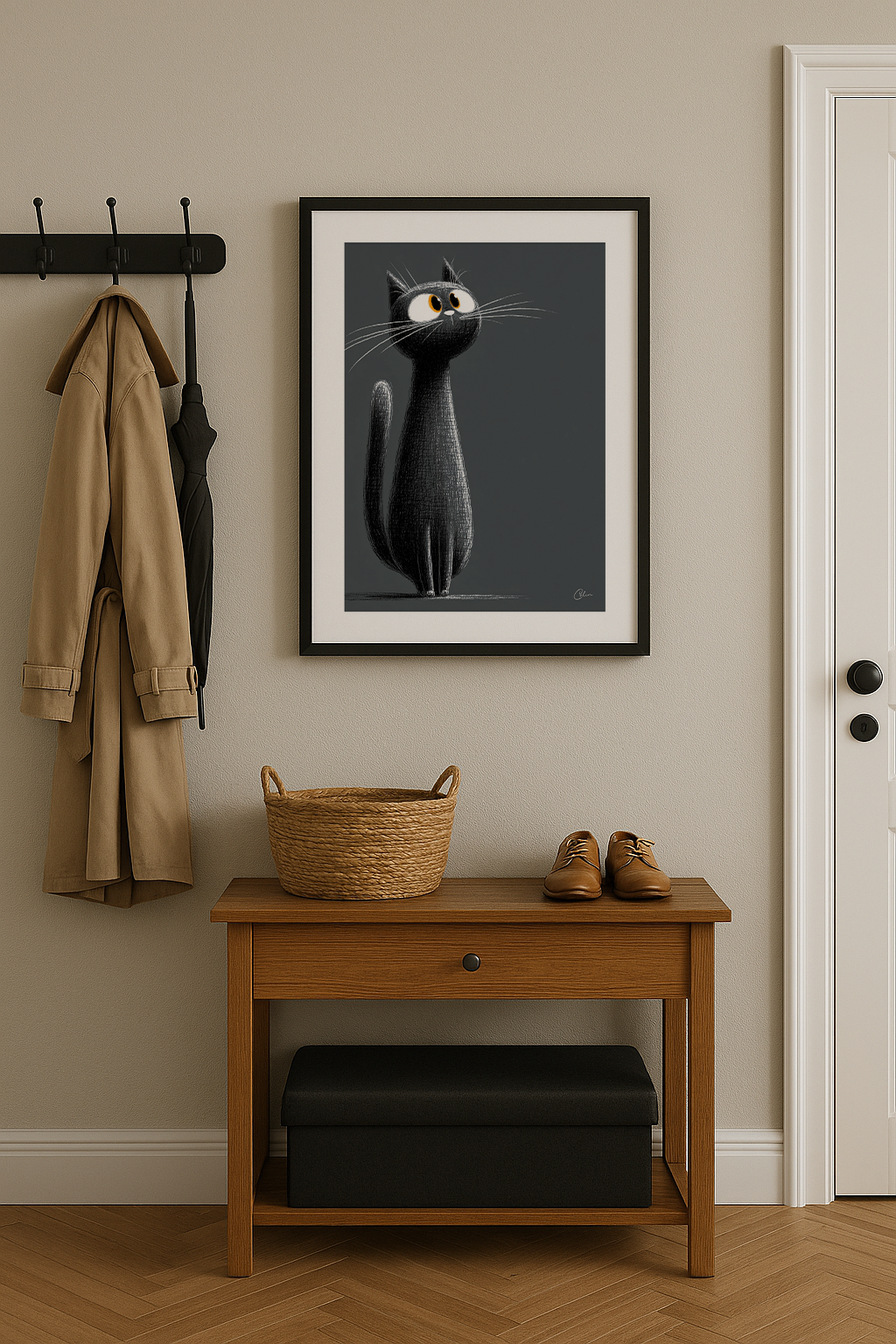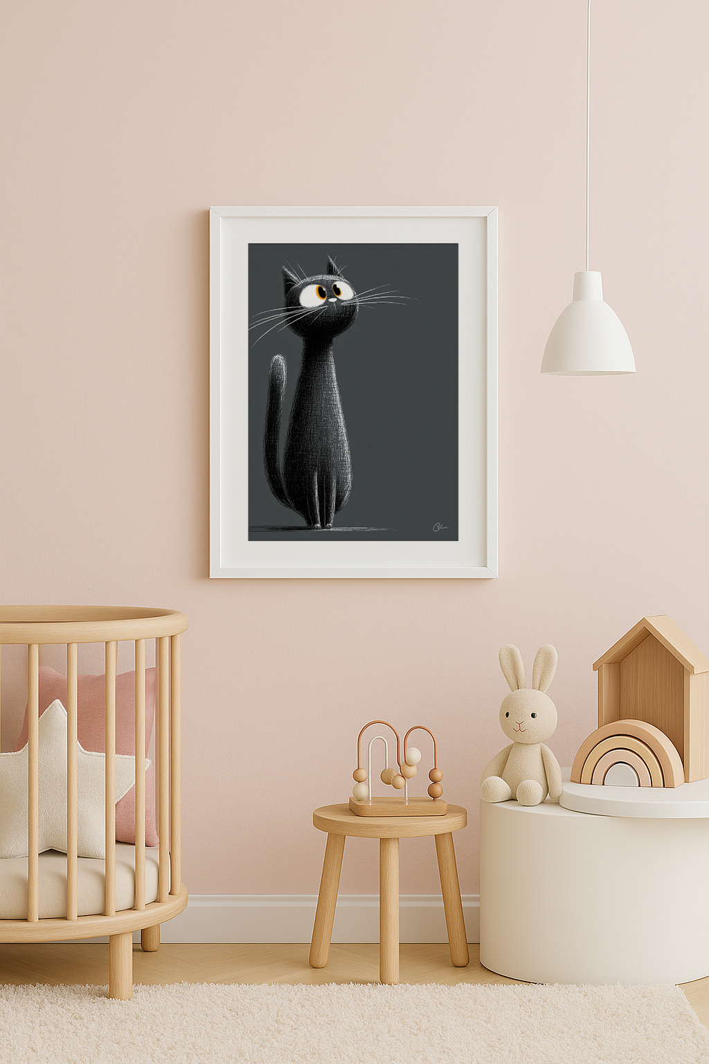 Midnight Whiskers fångar den tysta charmen hos en nyfiken svart katt mot en mjuk, antracitgrå bakgrund. Den lekfulla kontrasten mellan orange ögon och uttrycksfulla linjer gör den perfekt för barnrummet, hallen eller vardagsrummet.