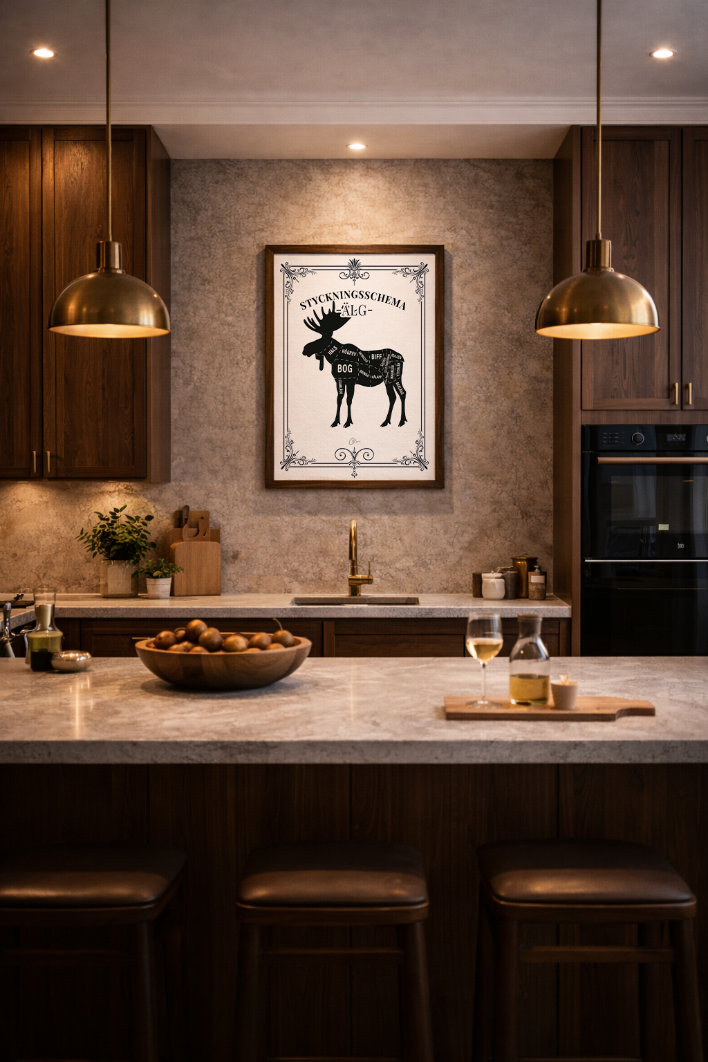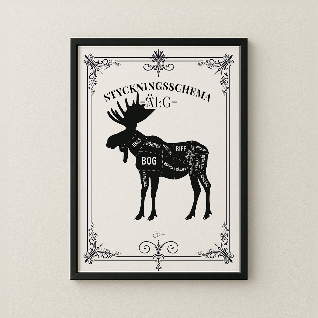 Ett traditionellt svenskt älgsnittsdiagram presenterat i en dekorativ vintageram. Varje huvudsnitt är tydligt märkt, vilket gör det till en praktisk och snygg referens för kök, restauranger eller alla som är intresserade av klassisk nordisk viltslakt.