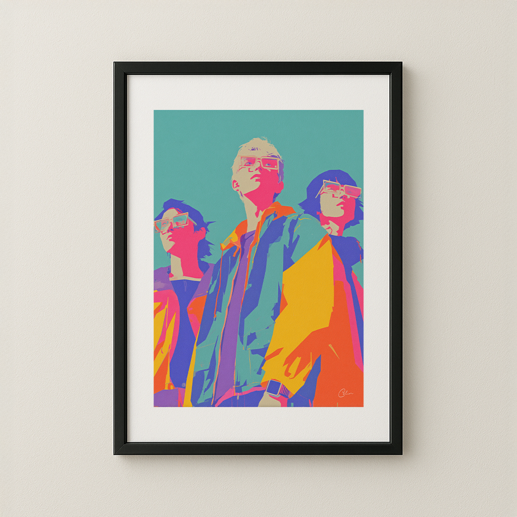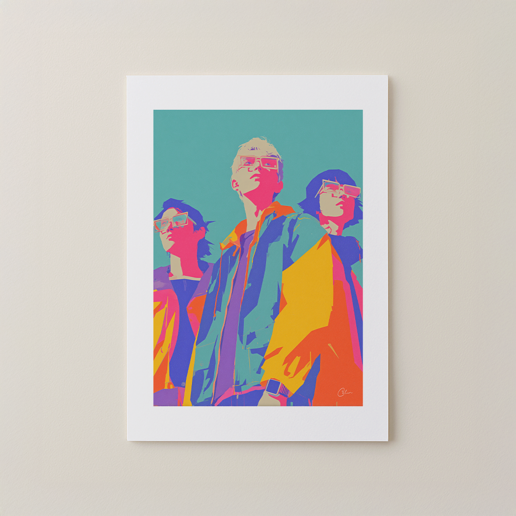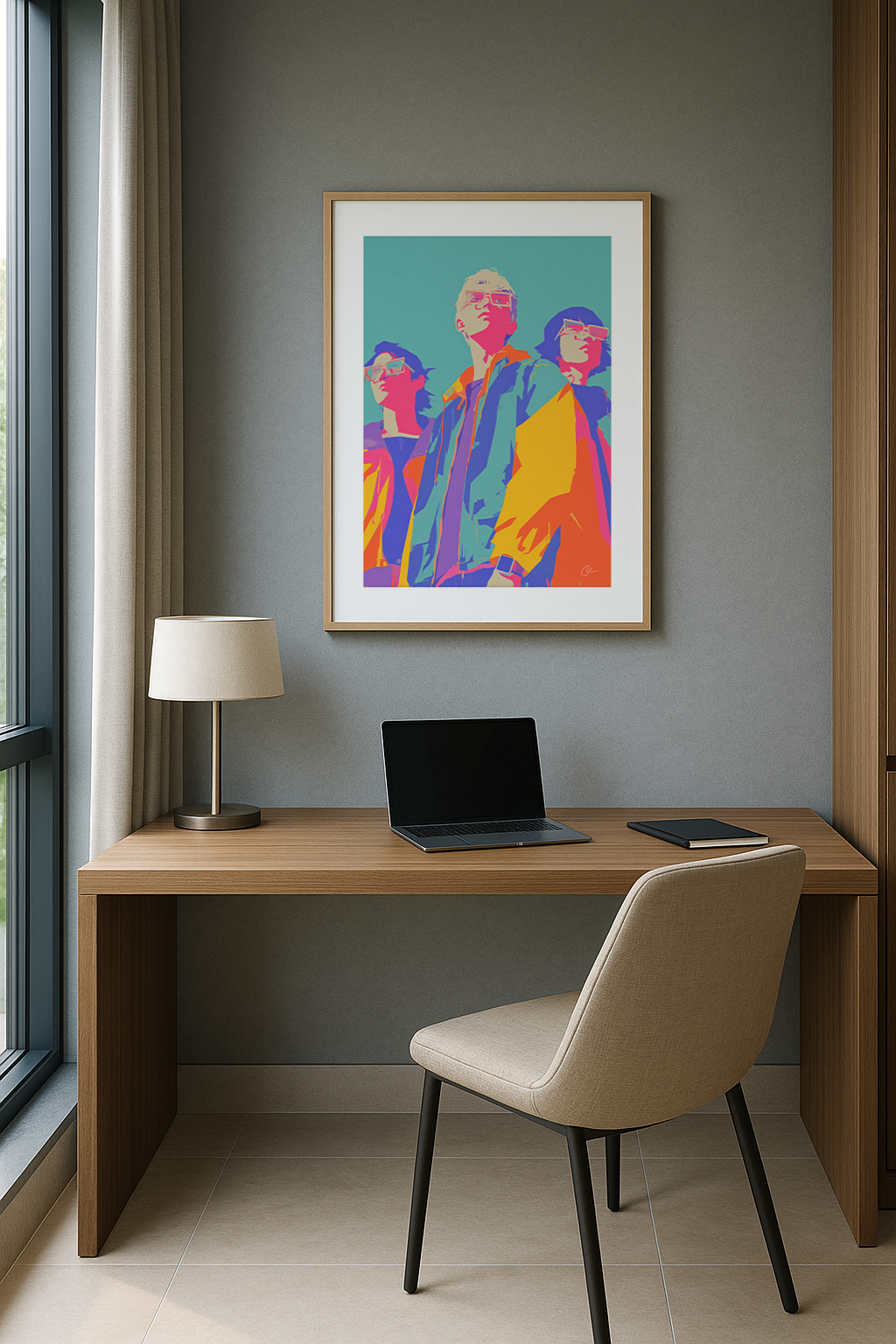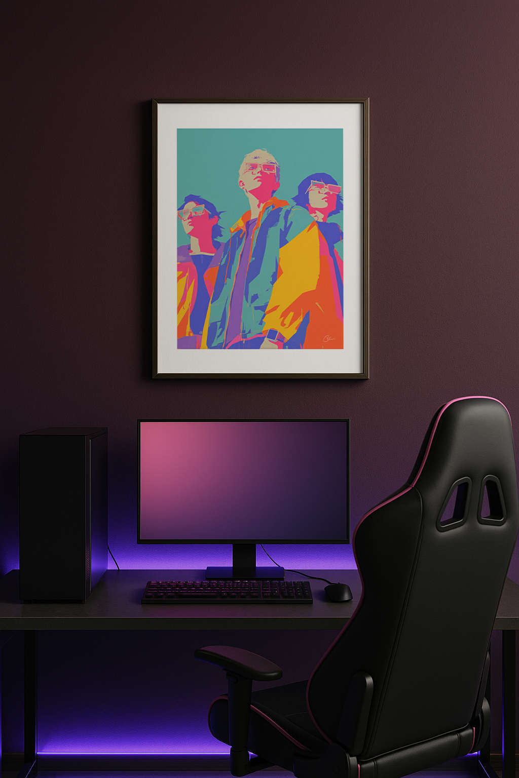Tre figurer i djärva jackor och tonade glasögon blickar framåt, upplysta av livfulla nyanser av rosa, blågrönt och orange. Det är streetwear som möter digitalt uppror – självsäkert, coolt och oberörbart. Bäst lämpat för spelrum eller kreativa utrymmen med pop-accenter och retro-tech-vibbar.