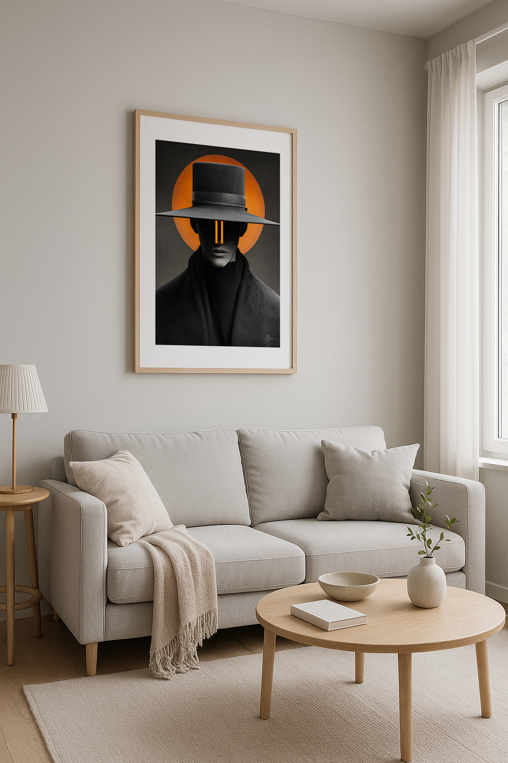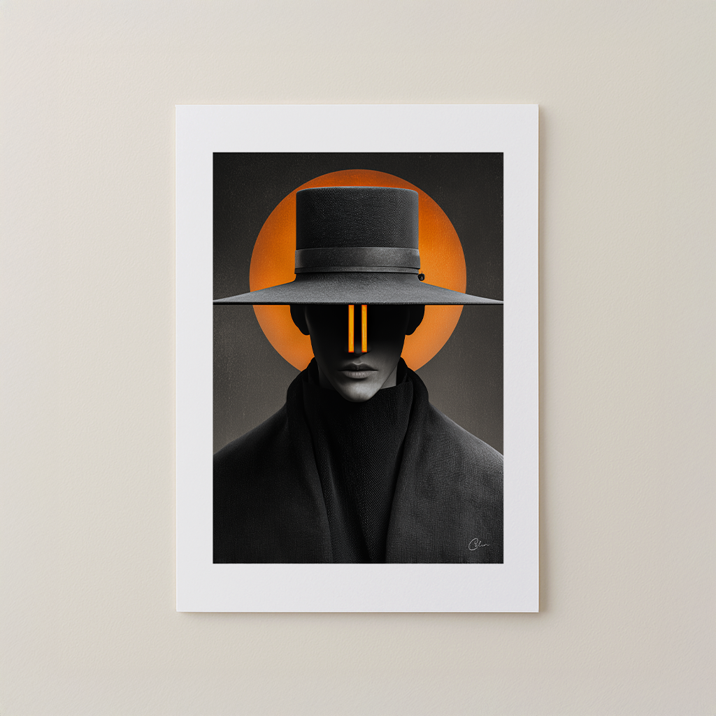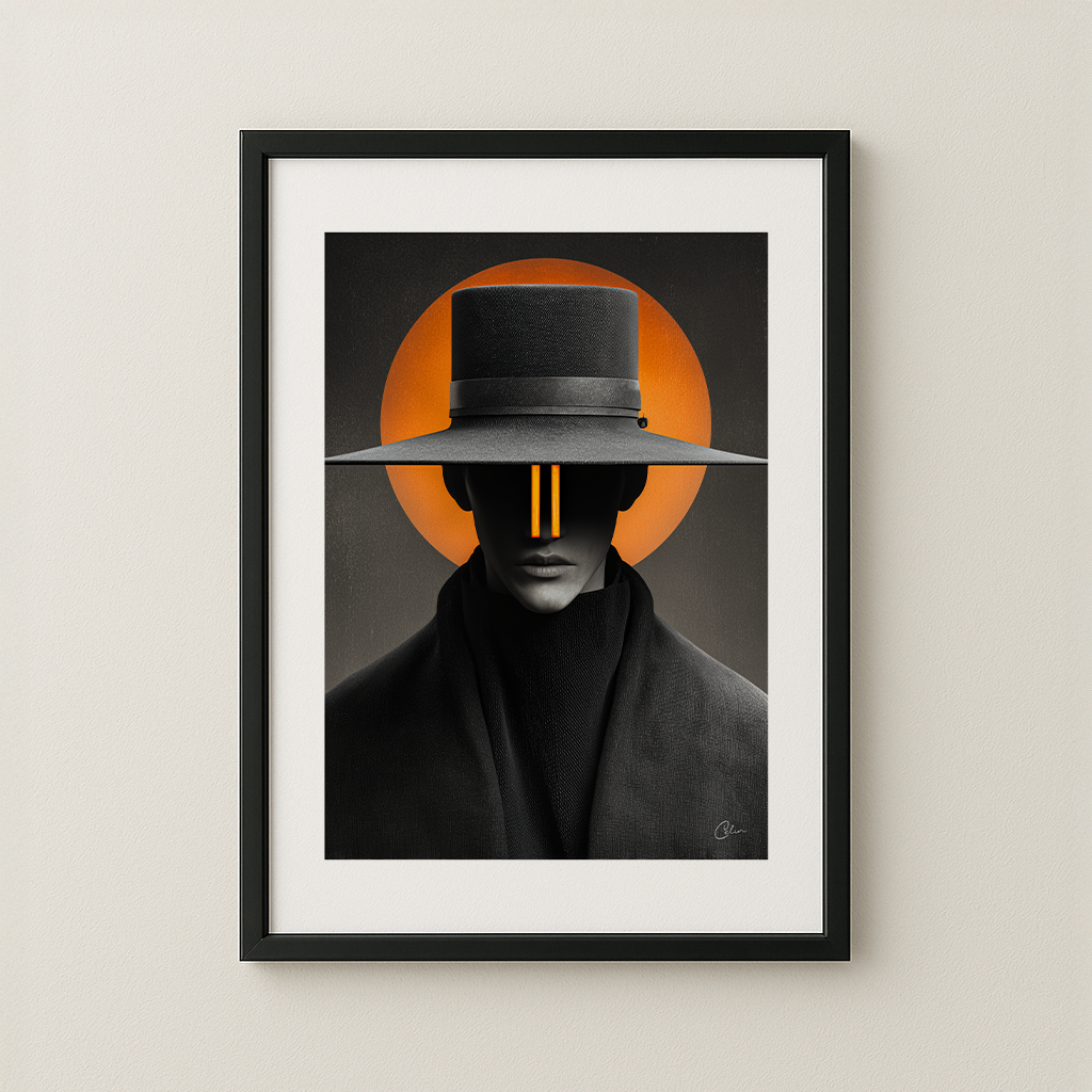 Ett surrealistiskt porträtt av en figur i en bred svart hatt, draperad i djupa skuggor med endast två vertikala neonljus som korsar deras ansikte. Det orangea skenet bakom ger en känsla av mystik och symbolik.