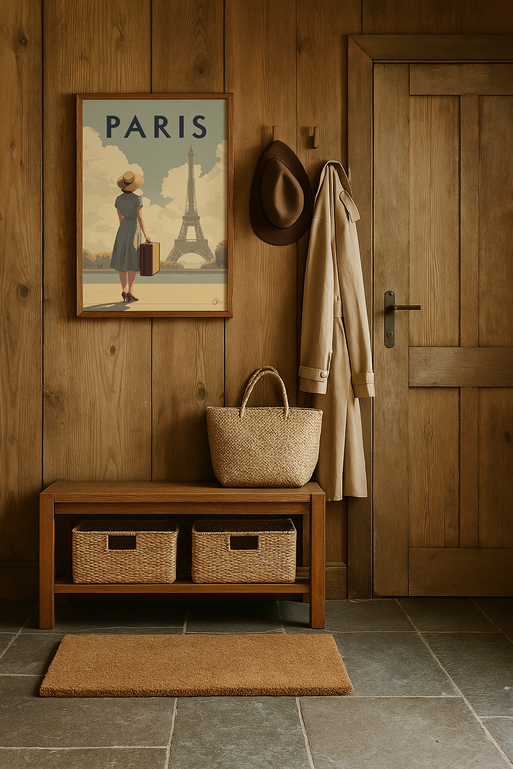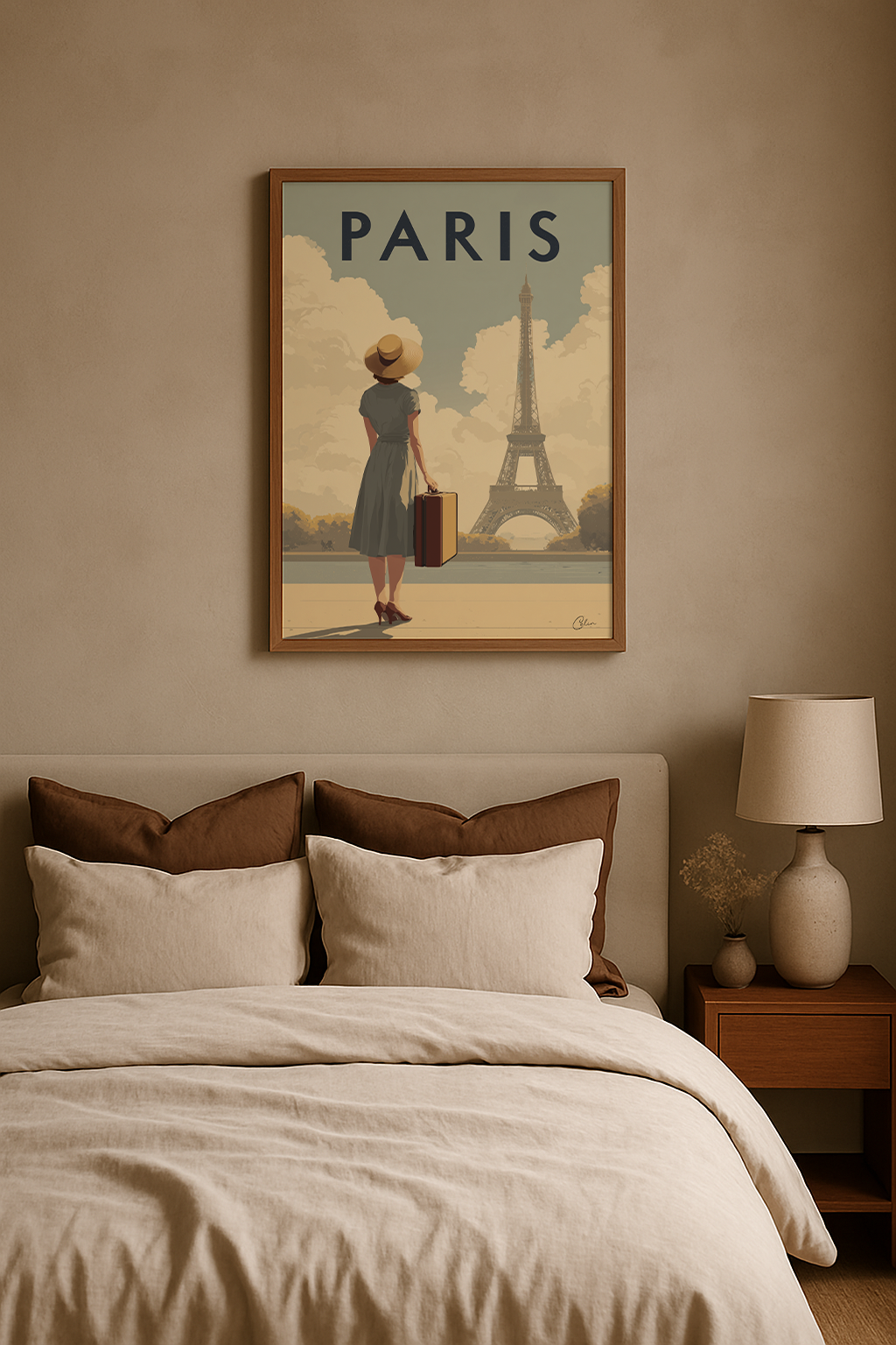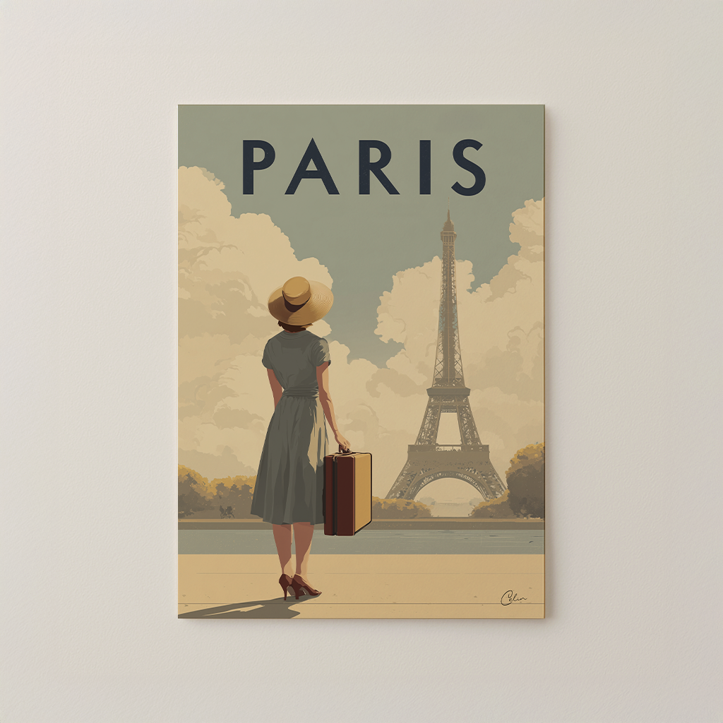 En reseposter i vintagestil som fångar Paris tidlösa lockelse. En kvinna i elegant klänning och solhatt blickar mot Eiffeltornet med resväskan i handen, mot en bakgrund av mjuka gyllene moln. De varma tonerna och den nostalgiska atmosfären gör detta konstverk perfekt för ett vardagsrum , en hall eller ett sovrum , och harmoniserar vackert med interiörer med klassiska detaljer, dämpade färger eller retroaccenter.
