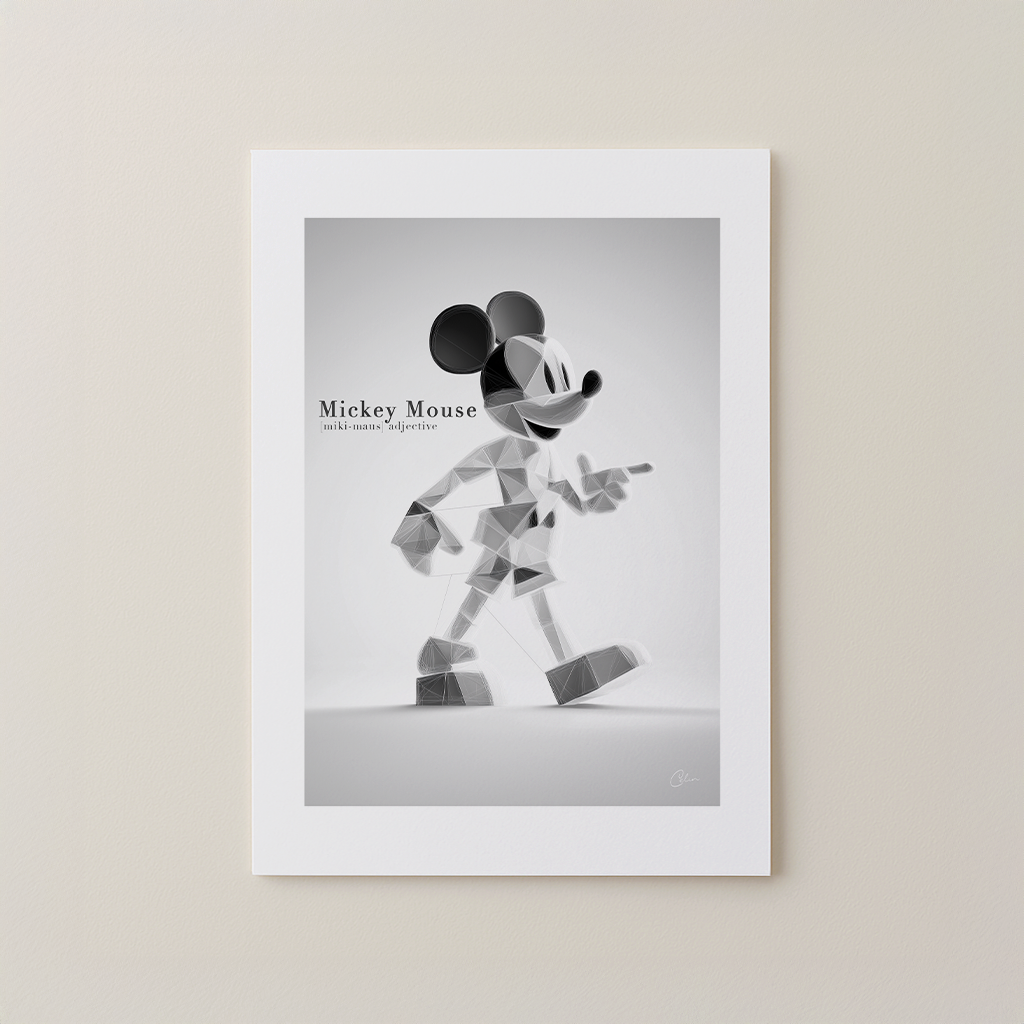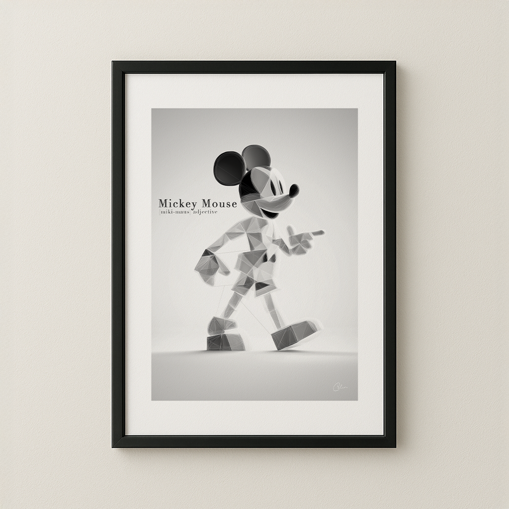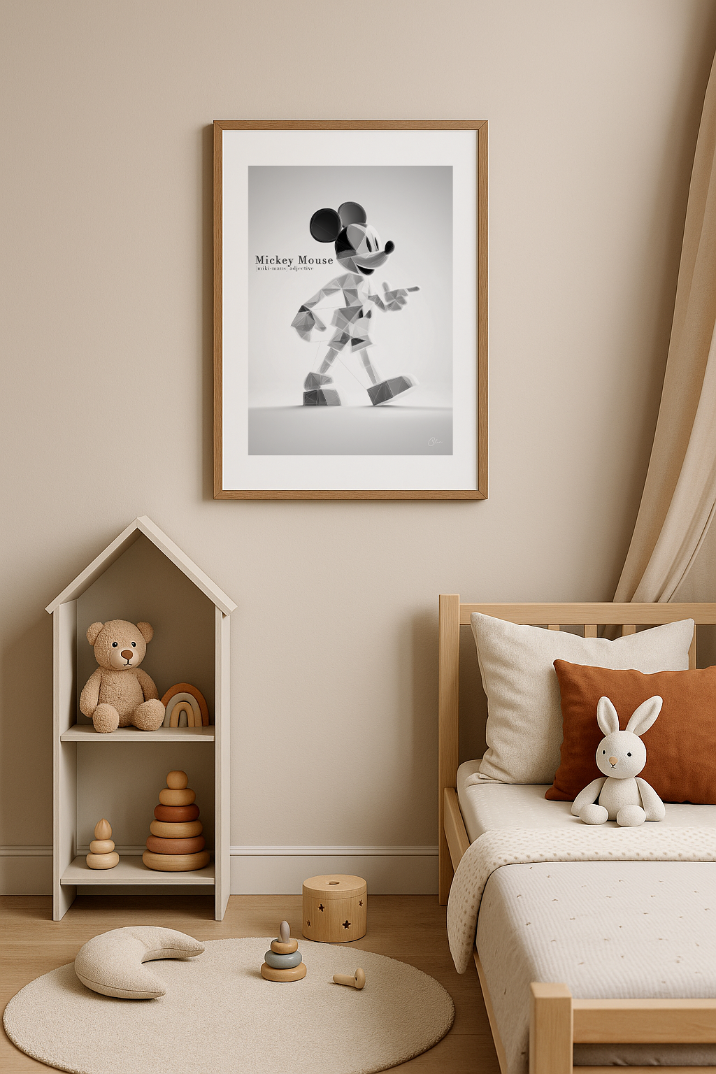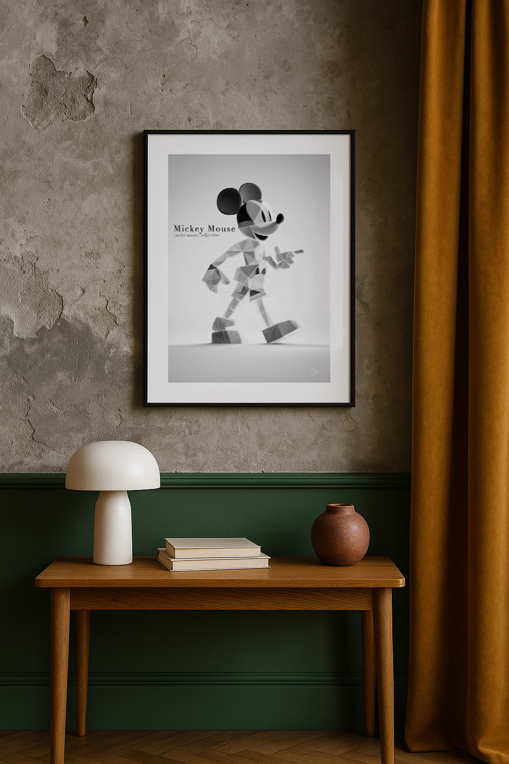 En polygonal återgivning av den ikoniska Musse Pigg i rörelse, med en skarp monokrom finish och subtila textelement som ger den en konceptuell twist. Perfekt för kreativa vrår, barnrum eller hallar – särskilt i hem med minimalistisk inredning eller lekfulla kontraster i svart, vitt och grått.