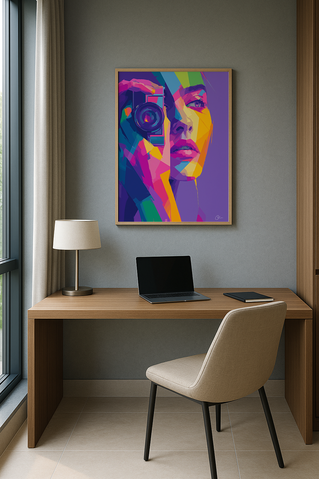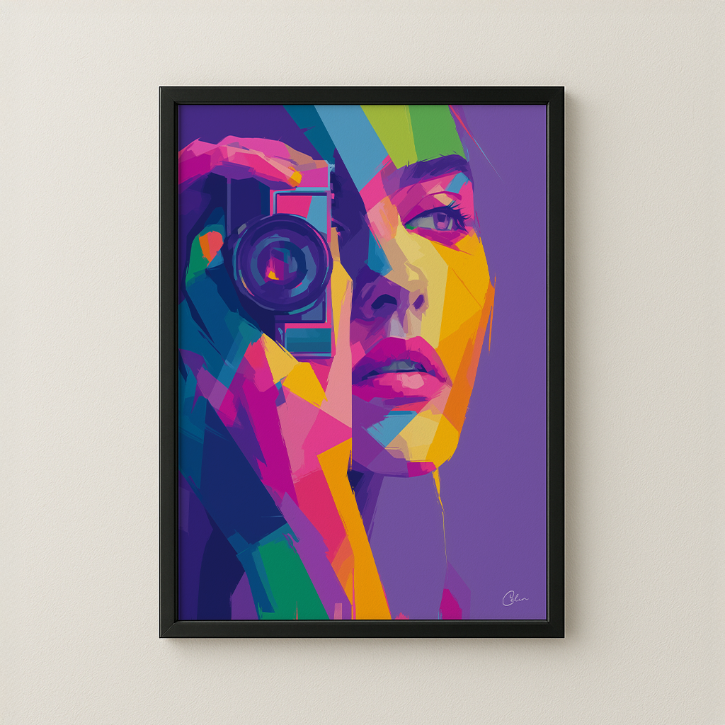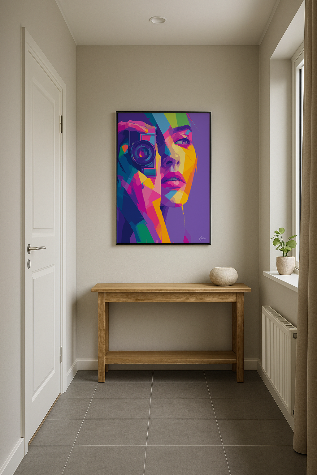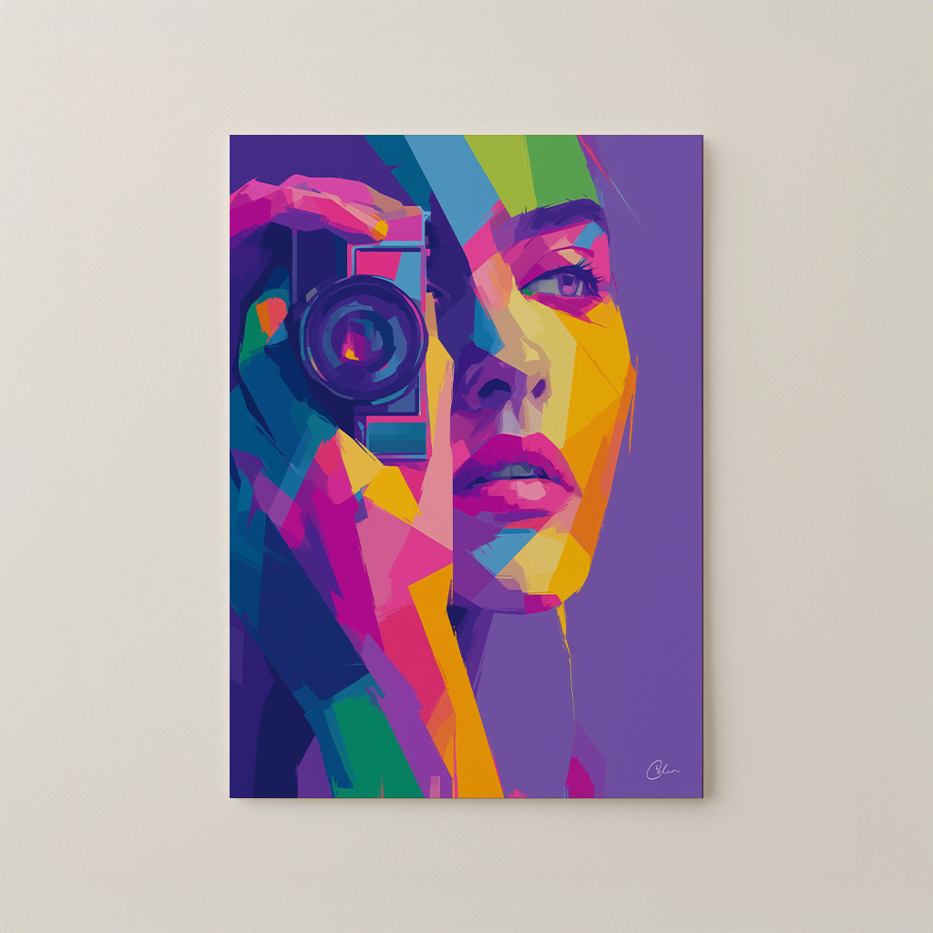 Ett djärvt, stiliserat ansikte inlåst bakom kameralinsen, fångat i elektriska penseldrag av neonrosa, cyan, gult och violett. Perfekt för ett hemmakontor, spelrum eller hall med livlig energi, urban touch eller kreativ känsla.