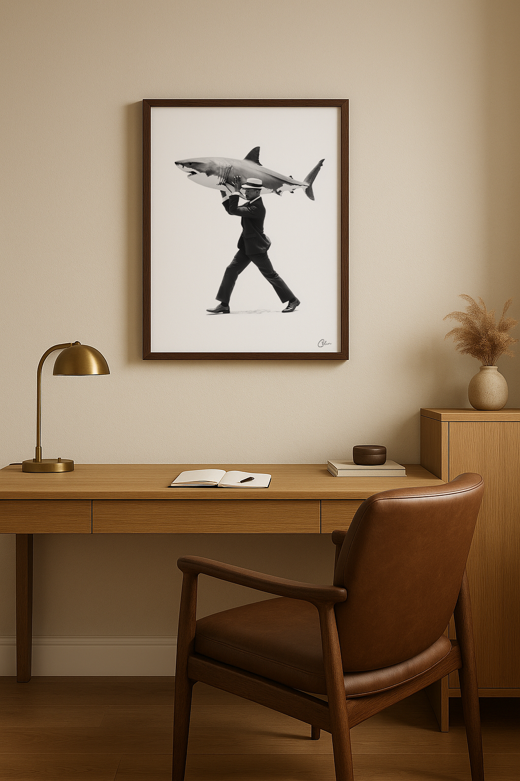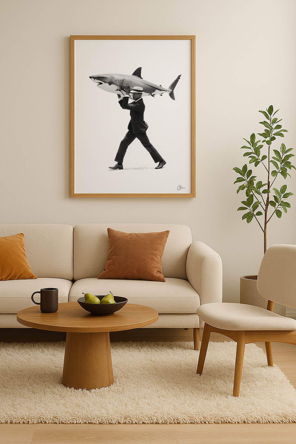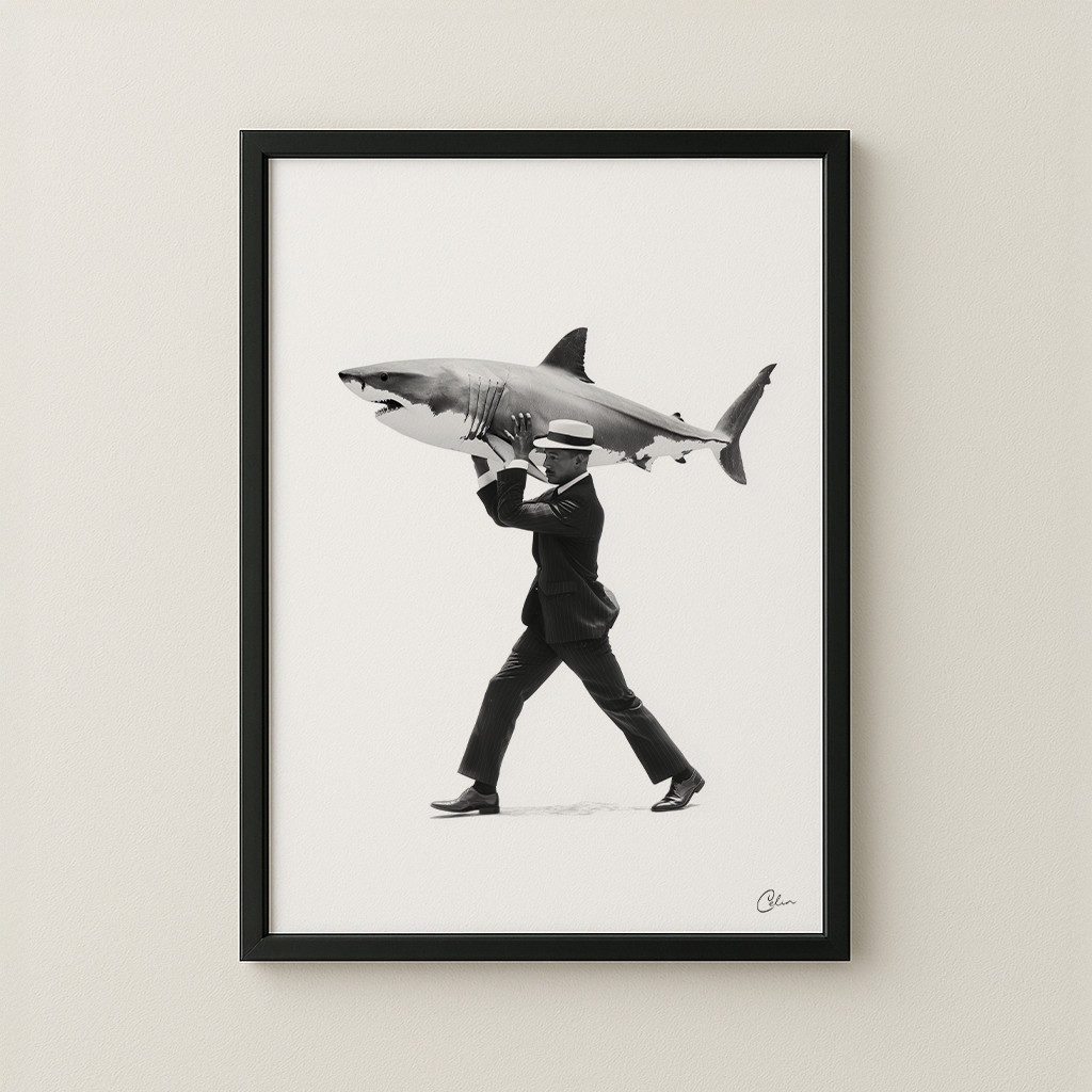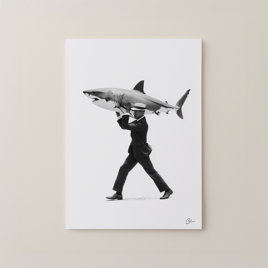 Ett slående svartvitt konstverk som blandar surrealism med modern stil. En snyggt klädd man kliver fram med självförtroende och bär en haj över axlarna, en symbol för makt, kontroll och djärv individualitet. Den minimalistiska miljön förstärker dess iögonfallande närvaro, vilket gör den perfekt för ett vardagsrum, kontor eller hall där personlighet möter design.