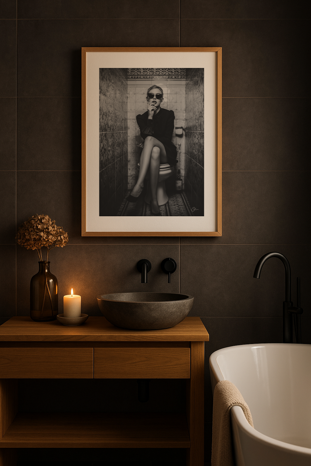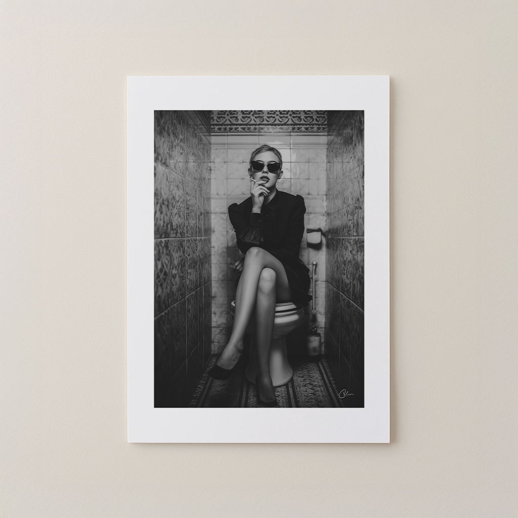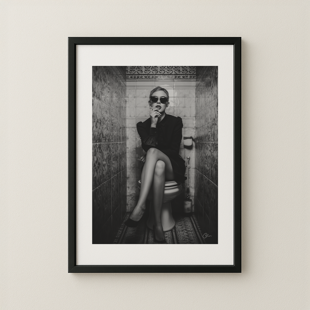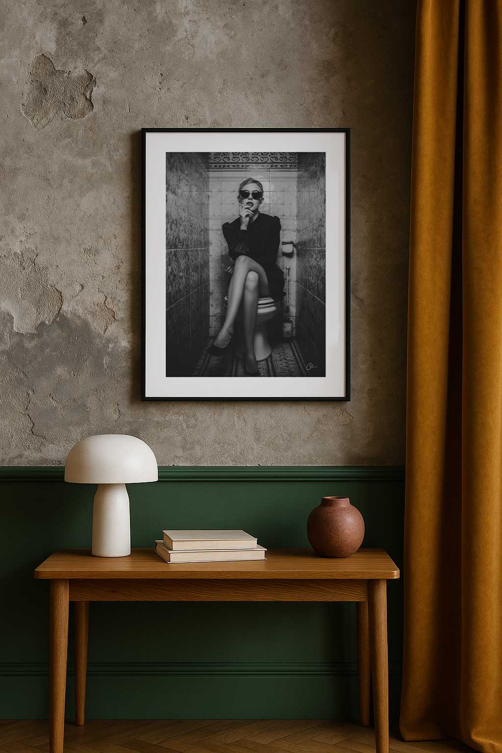 En moderiktig scen i svartvitt, där elegans möter ironi – klackar, solglasögon och en cigarett, allt iscensatt i ett kaklat badrum. Självsäker, lugn och cool utan ursäkter. Perfekt för walk-in-closets, hallar eller djärva interiörer – i kombination med monokrom, krom och skarpa kanter.
