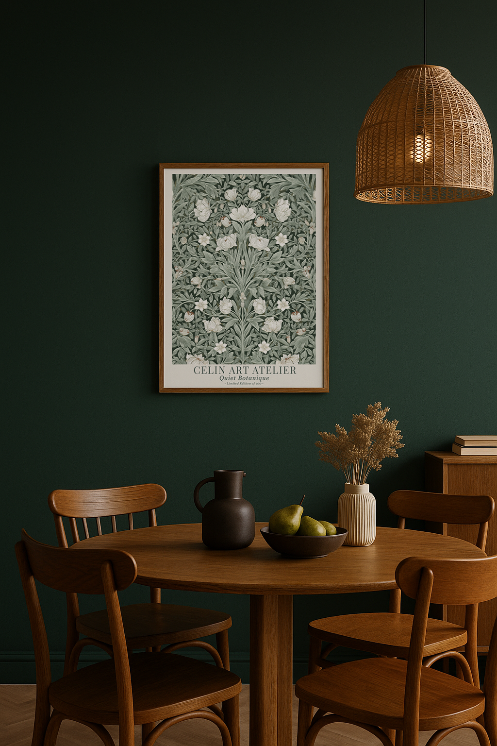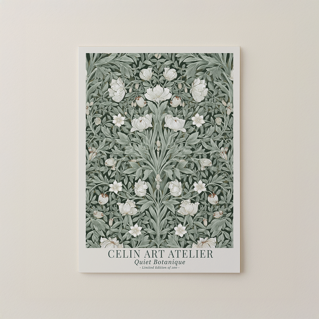 Quiet Botanique är en botanisk komposition inspirerad av William Morris, rik på invecklade blommiga detaljer och mjukt lager av bladverk. Konstverket blandar traditionellt ornamentalt hantverk med en lugn modern palett, vilket gör det idealiskt för vardagsrum, sovrum eller hall. Dess raffinerade symmetri och organiska flöde passar naturligt ihop med klassiska, skandinaviska och vintageinspirerade inredningsmiljöer.