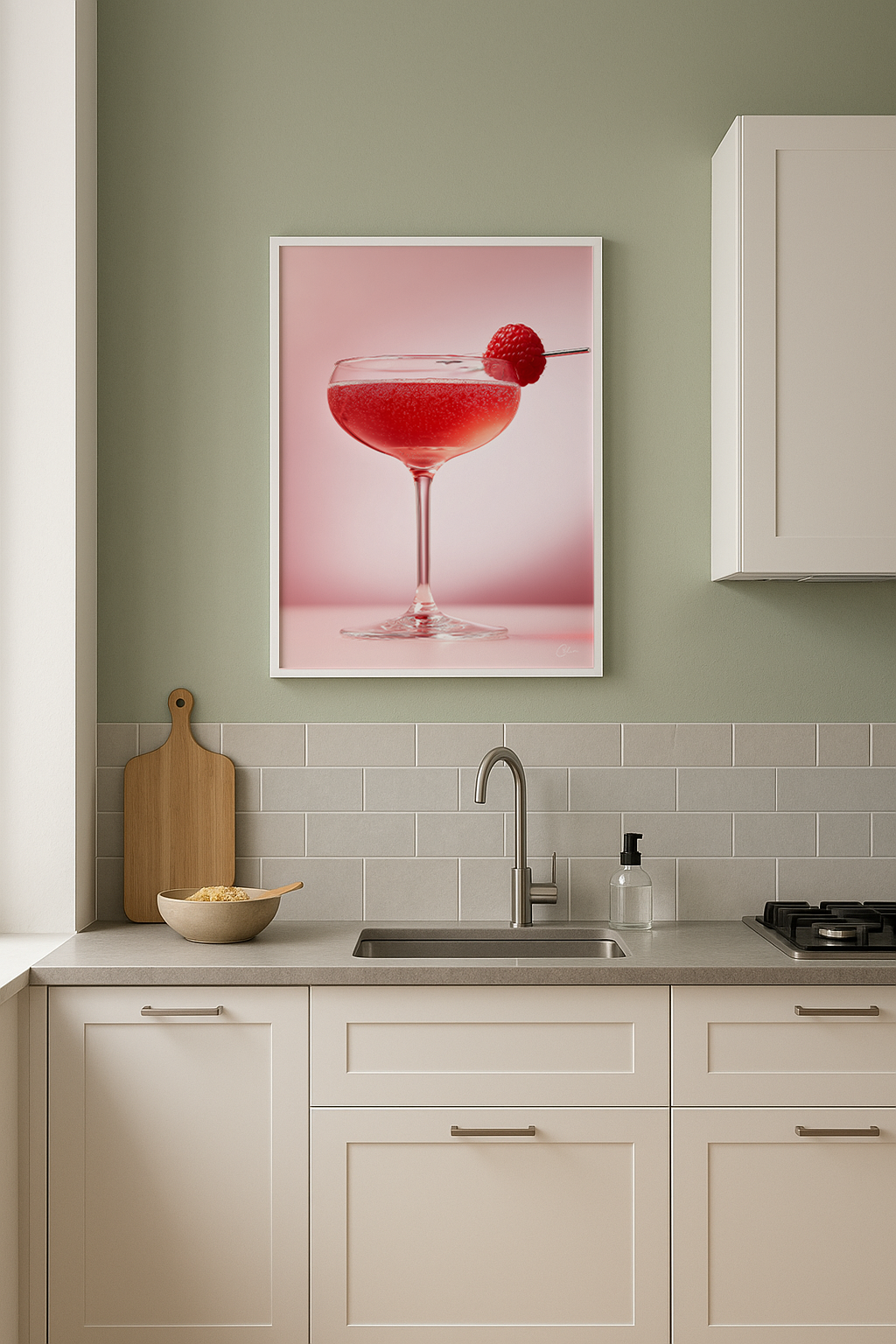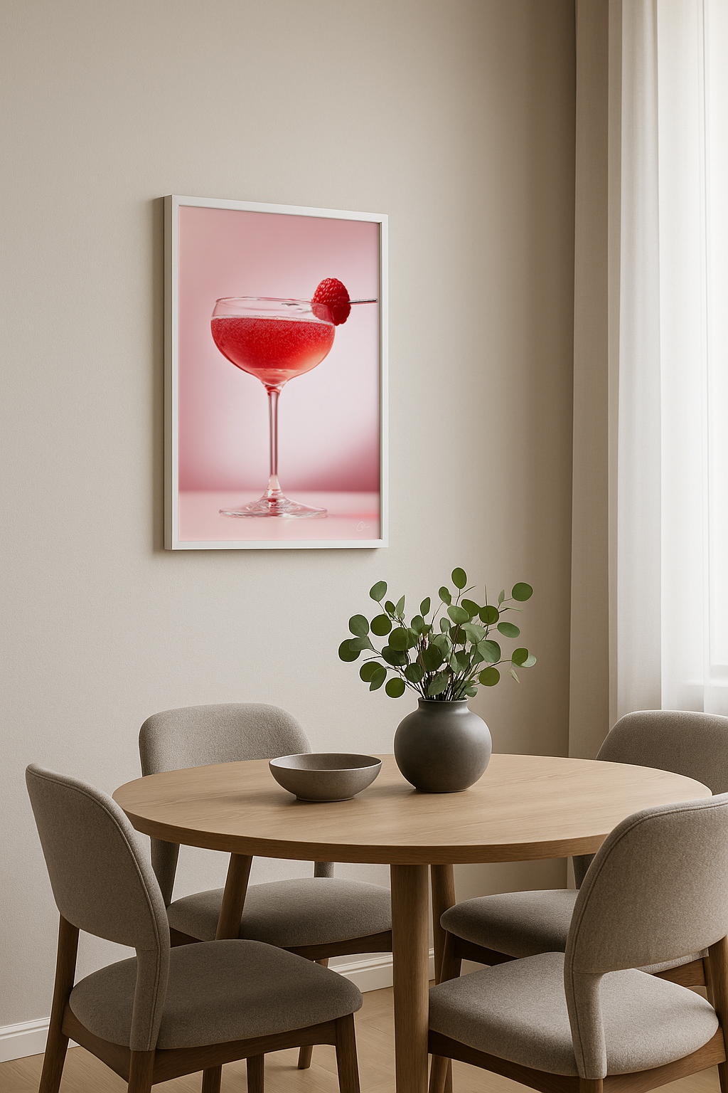 En livfull halloncocktail bubblar mjukt i en vintagekupé, toppad med ett färskt bär på en silverpinne. Lekfull men ändå raffinerad, den passar perfekt i moderna kök, matsalar eller hemmabarer med varma toner, rosa accenter eller retrocharm.