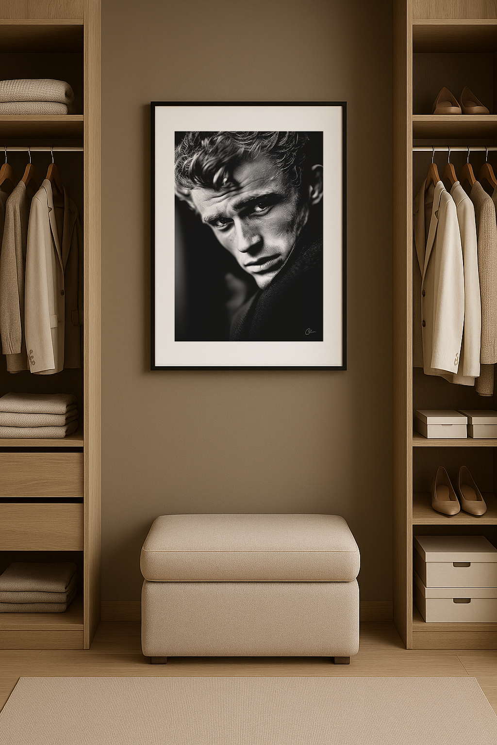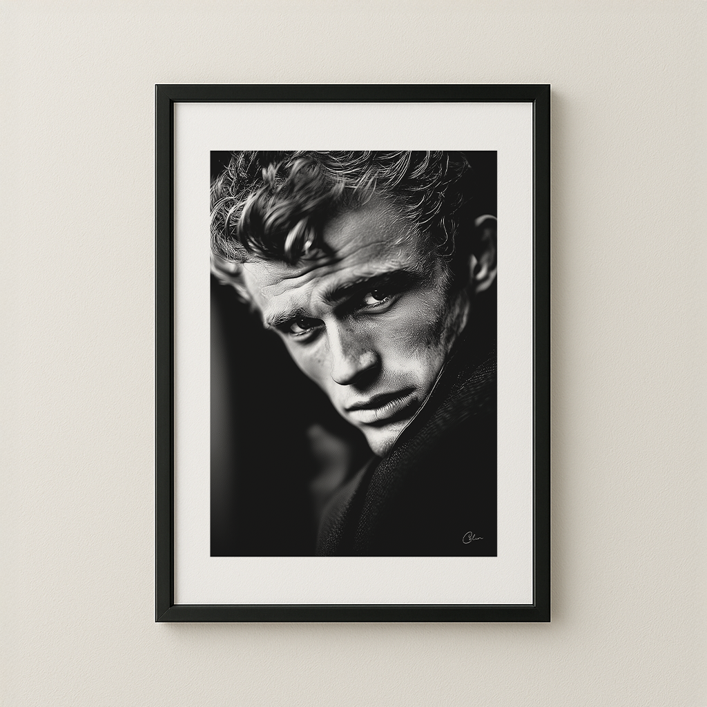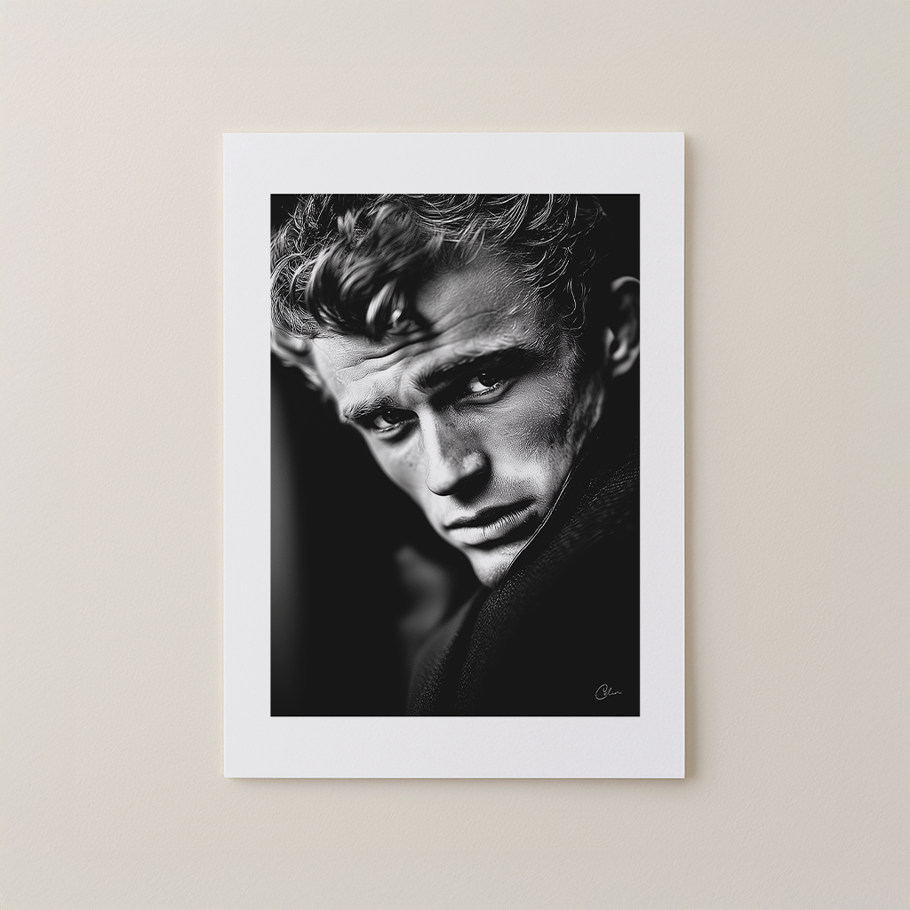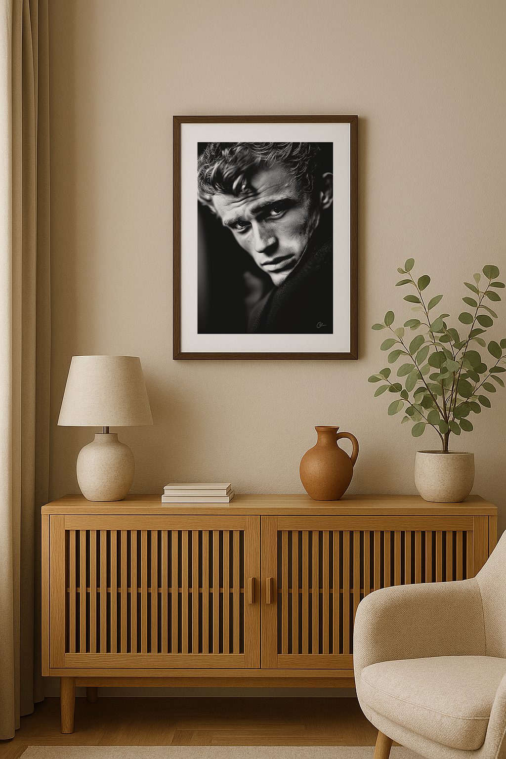 Ett djärvt svartvitt porträtt inspirerat av James Deans tidlösa attityd, som fångar intensiva uttryck, filmiska skuggor och rå textur. Den monokroma paletten ger konstverket en stark känslomässig närvaro som passar in i ett vardagsrum eller ett hemmakontor. Det integreras naturligt med interiörer som har neutrala toner, industriella element eller minimalistisk stil. Tryckt med digital passepartout.