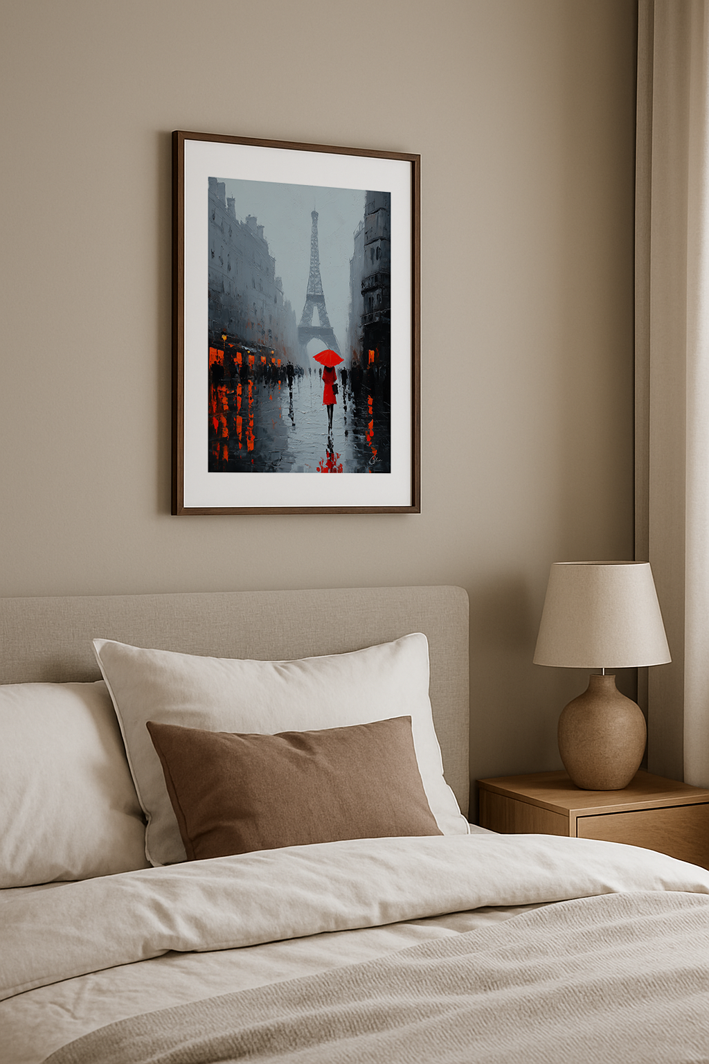 En ensam figur i röd kappa och paraply går genom en regndränkt parisisk gata, med Eiffeltornet tornande i dimmans fjärran. Glödande kafélampor reflekteras på den våta trottoaren och ger värme åt den grå omgivningen.