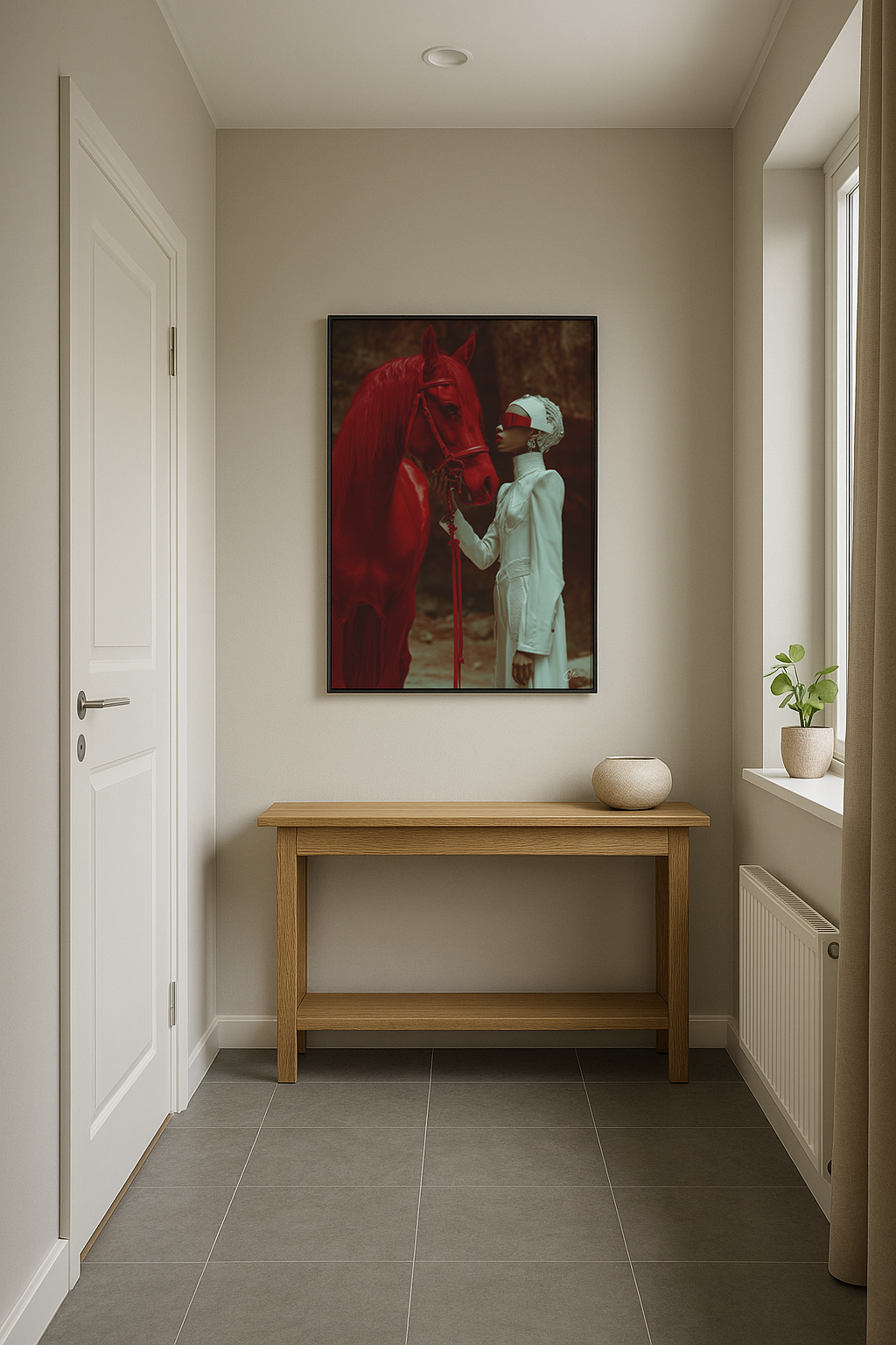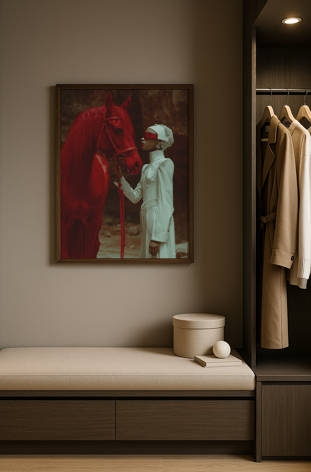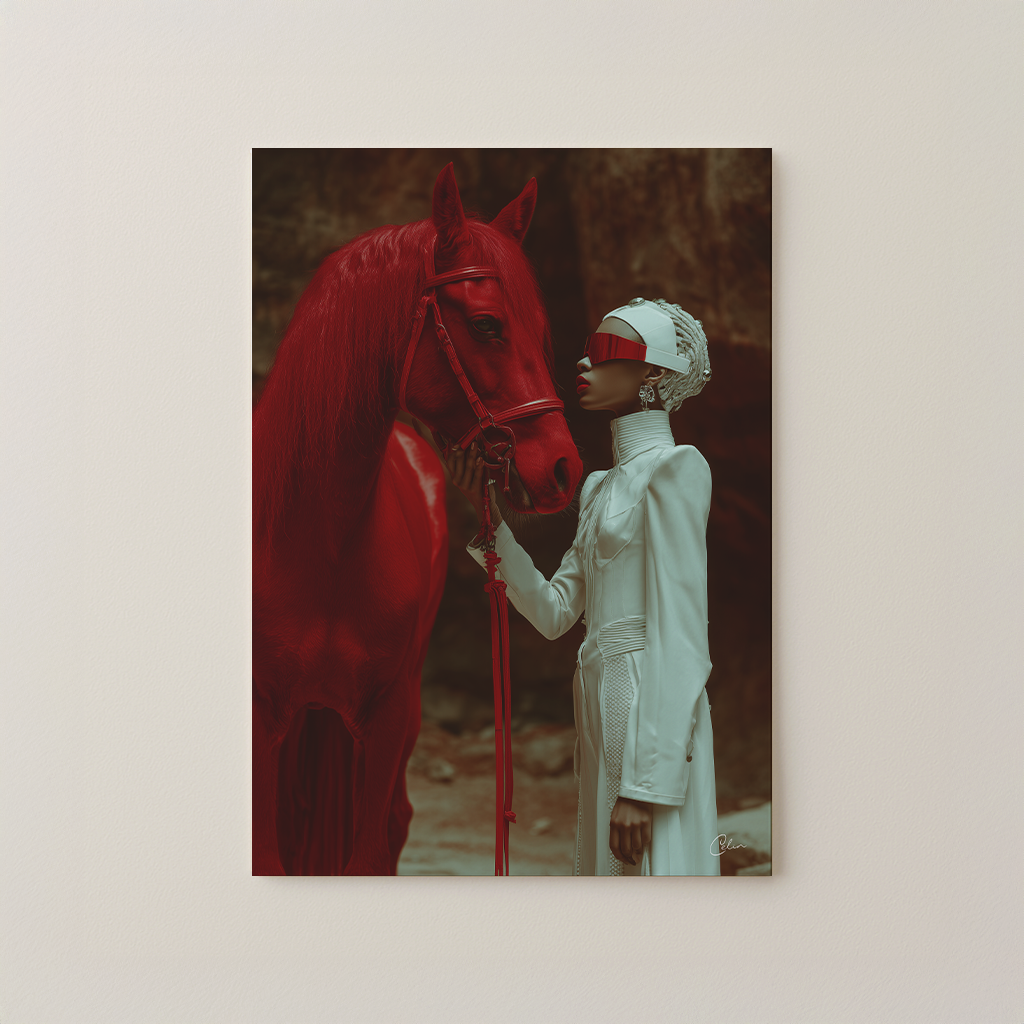 En futuristisk kvinna i vitt håller varsamt en karmosinröd häst – en vision av kontrast, styrka och tyst förståelse. Bilden pulserar av filmisk närvaro och haute couture-attityd.