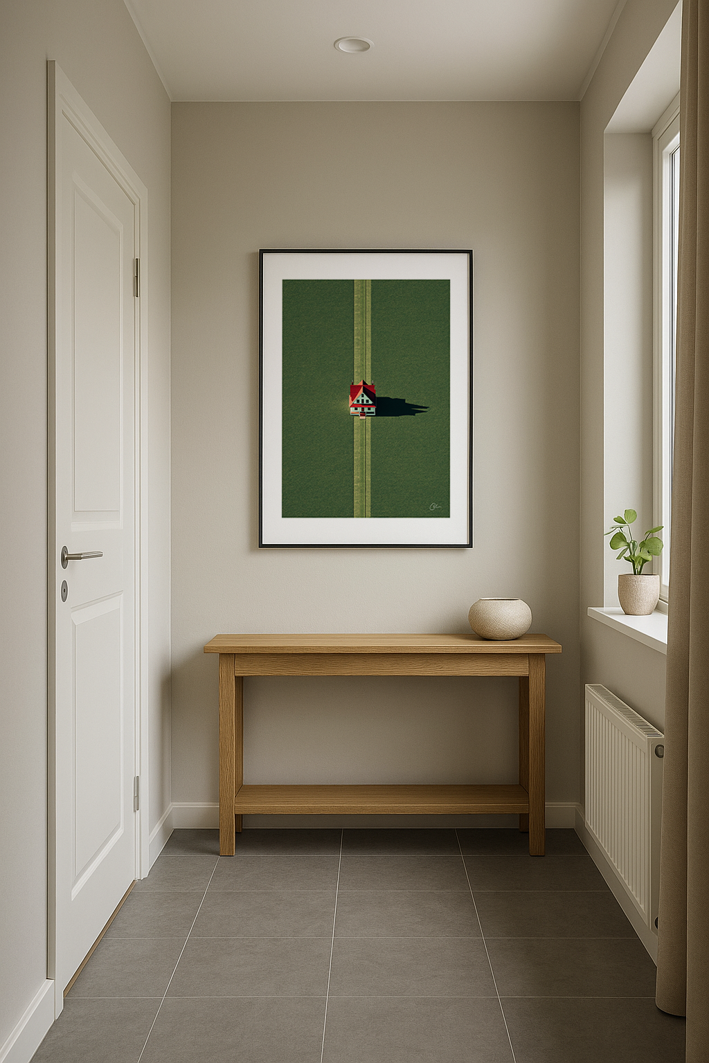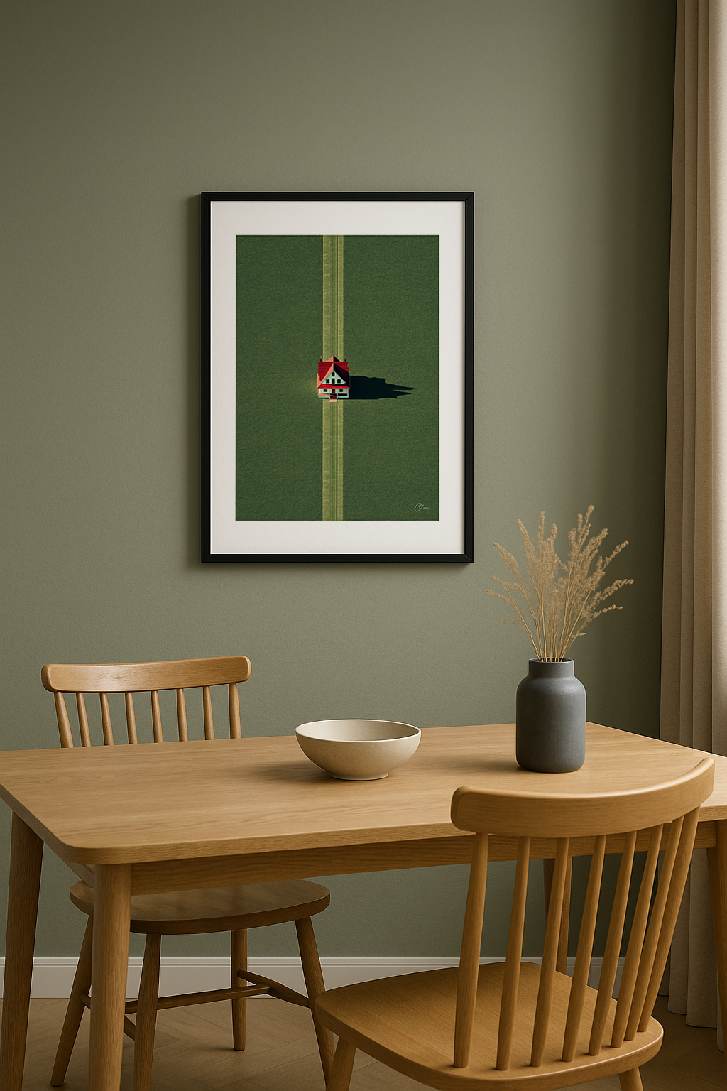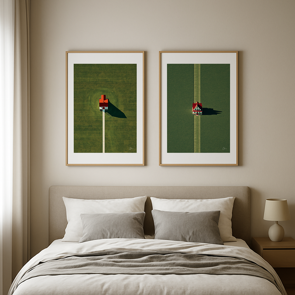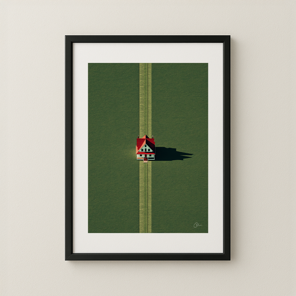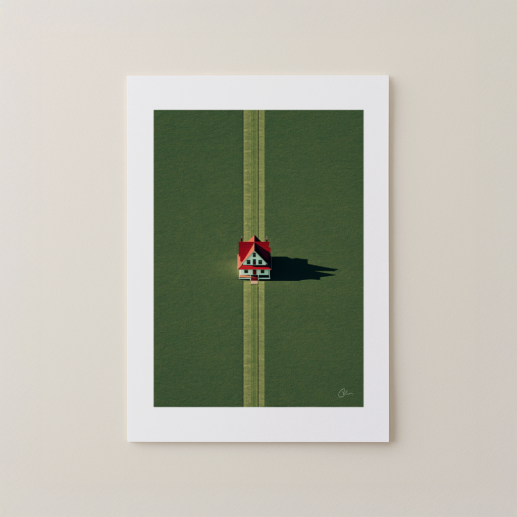 Ett ensamt hus med rött tak står ensamt på ett öppet grönt fält, perfekt centrerat och kastar en skarp skugga i skymningen. Symmetrin är rogivande, tystnaden fullständig.