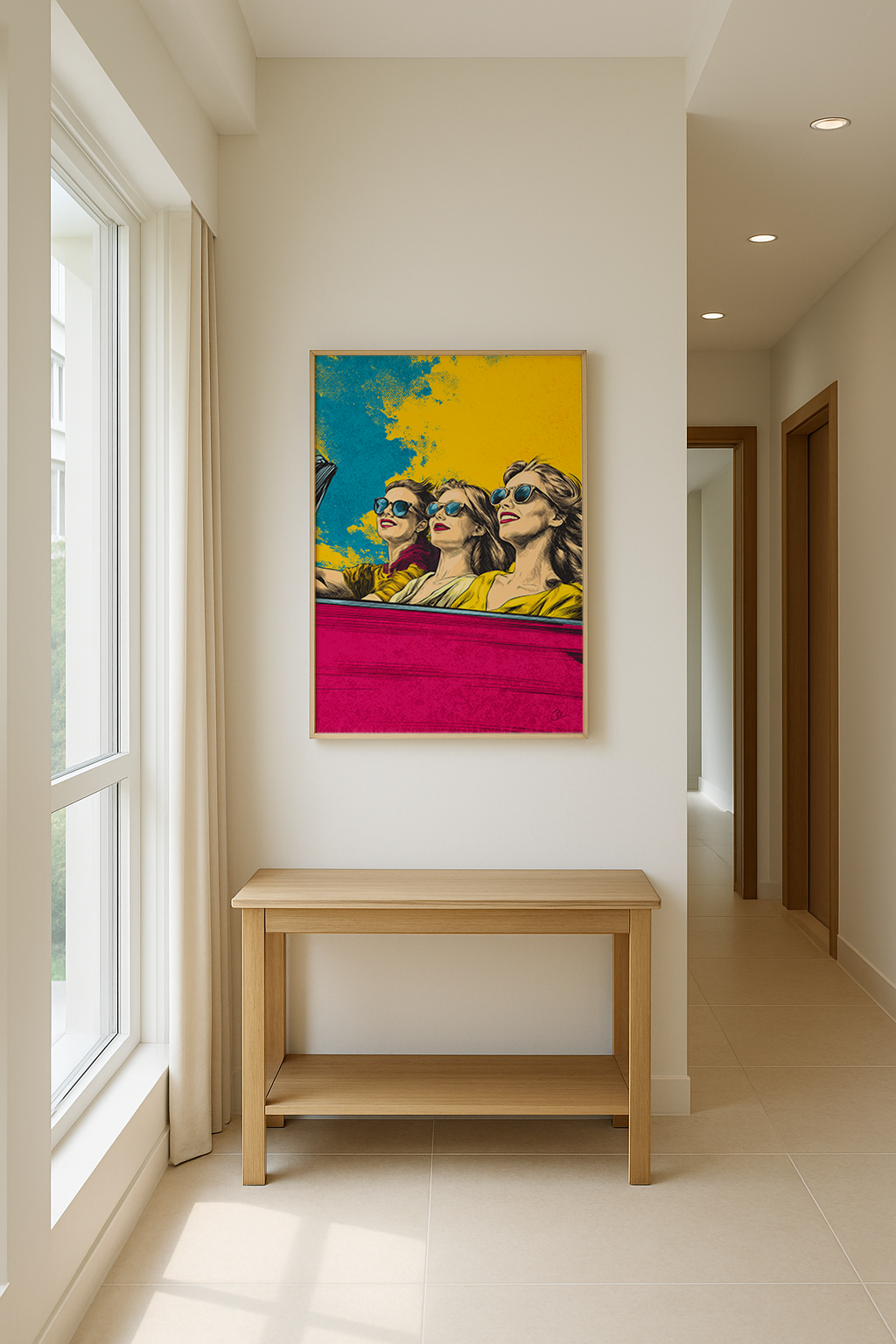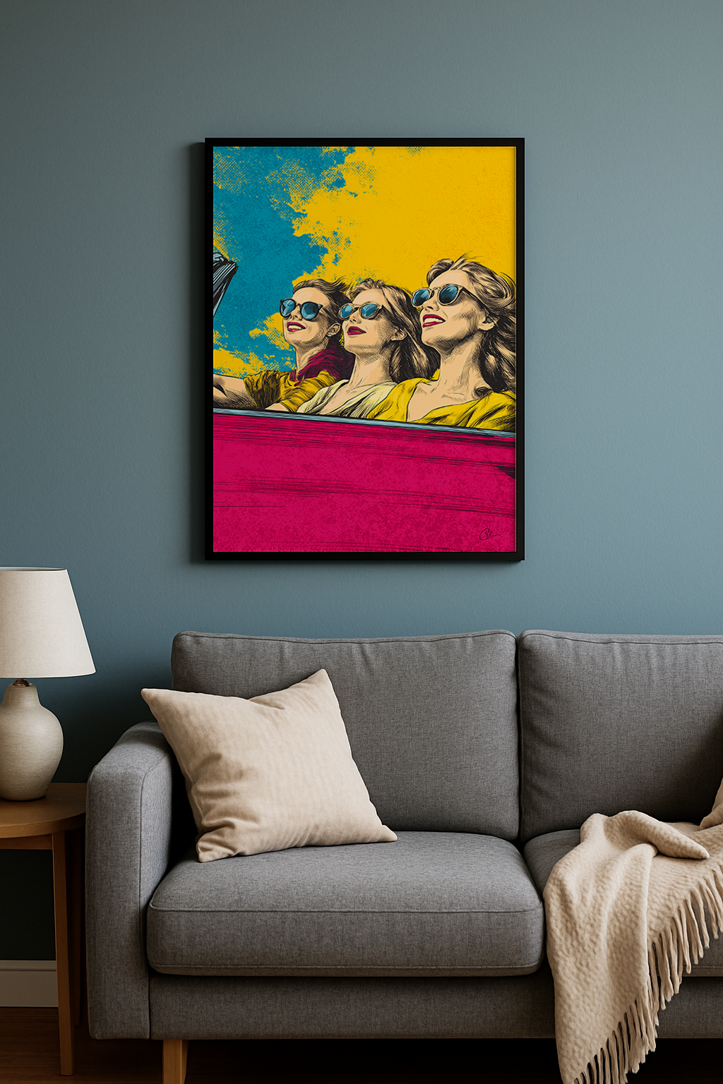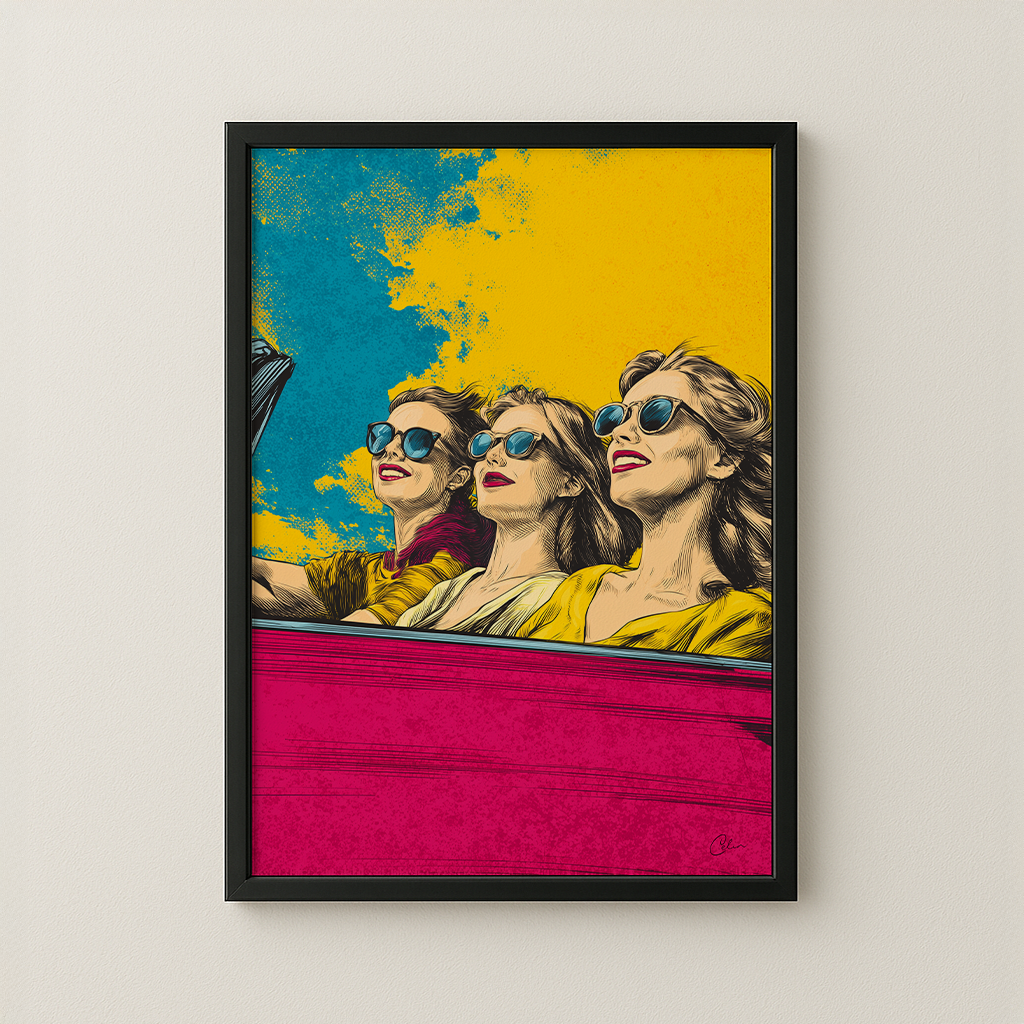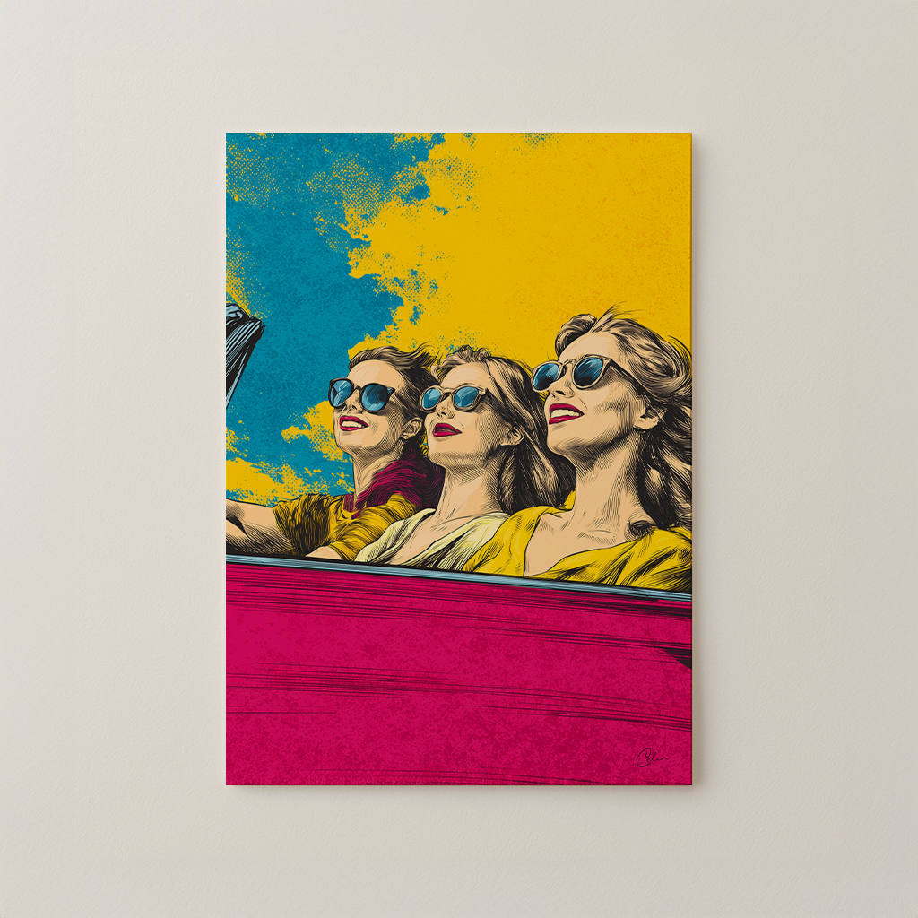 Tre vänner glidande framåt med vind i håret och djärva färger i alla riktningar. En hyllning till spontanitet, stil och gemensamma sommarminnen.