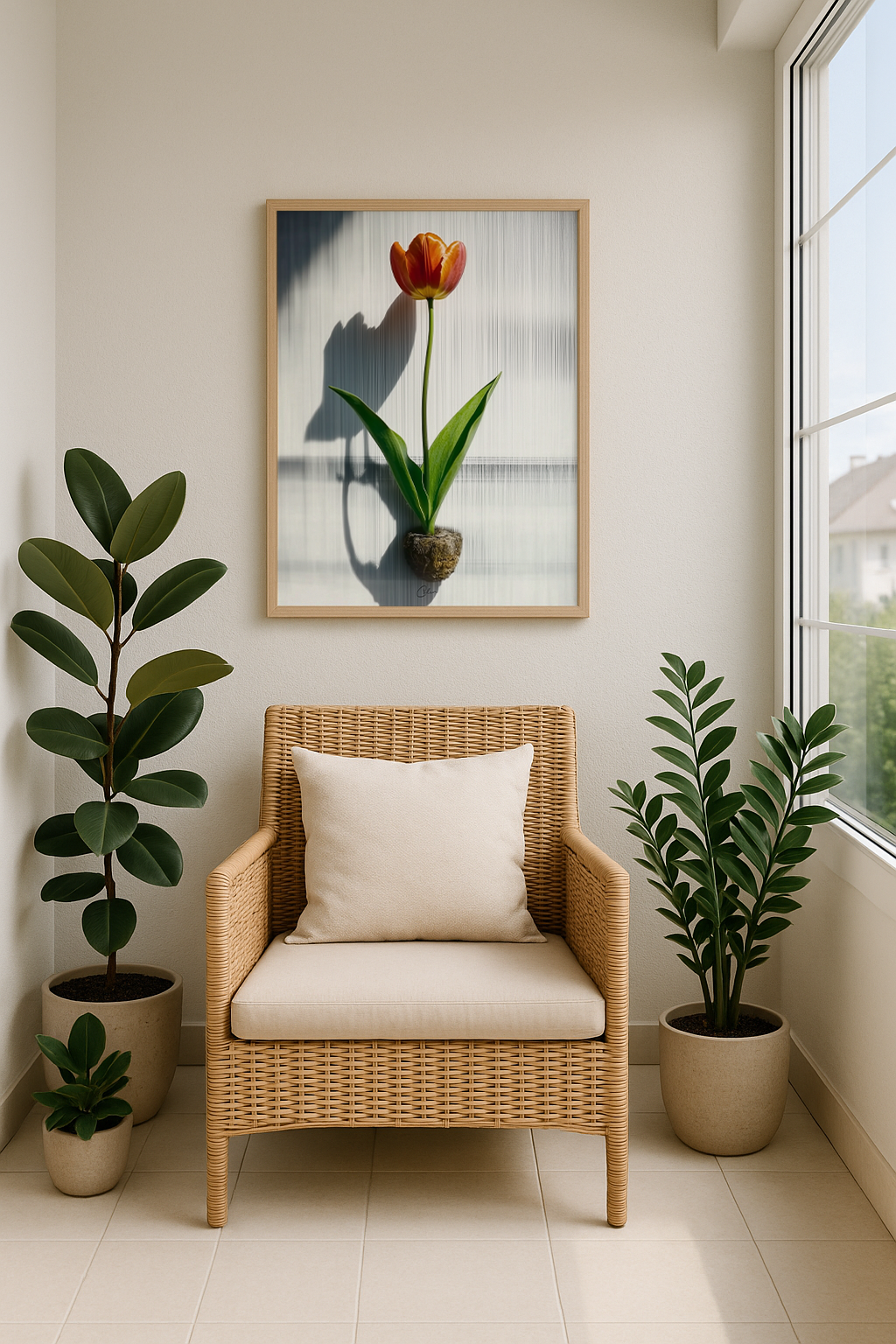 Passar vackert i hallen, sovrummet eller solrummet – platser där ljuset rör sig och stunder stannar upp. Fungerar med vitt, mjukt grått, naturligt trä eller jordfärger.