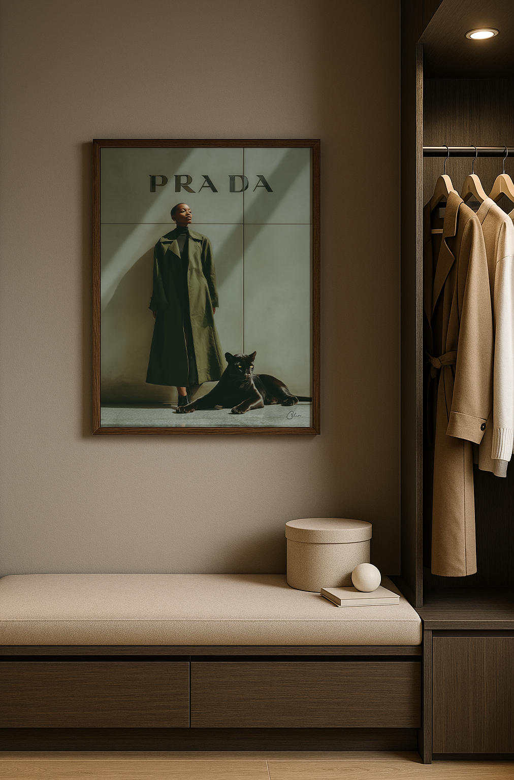 Behåll lugnet i tystnad. En djärv silhuett under skulpterat ljus, flankerad av instinkt i sammetssvart.