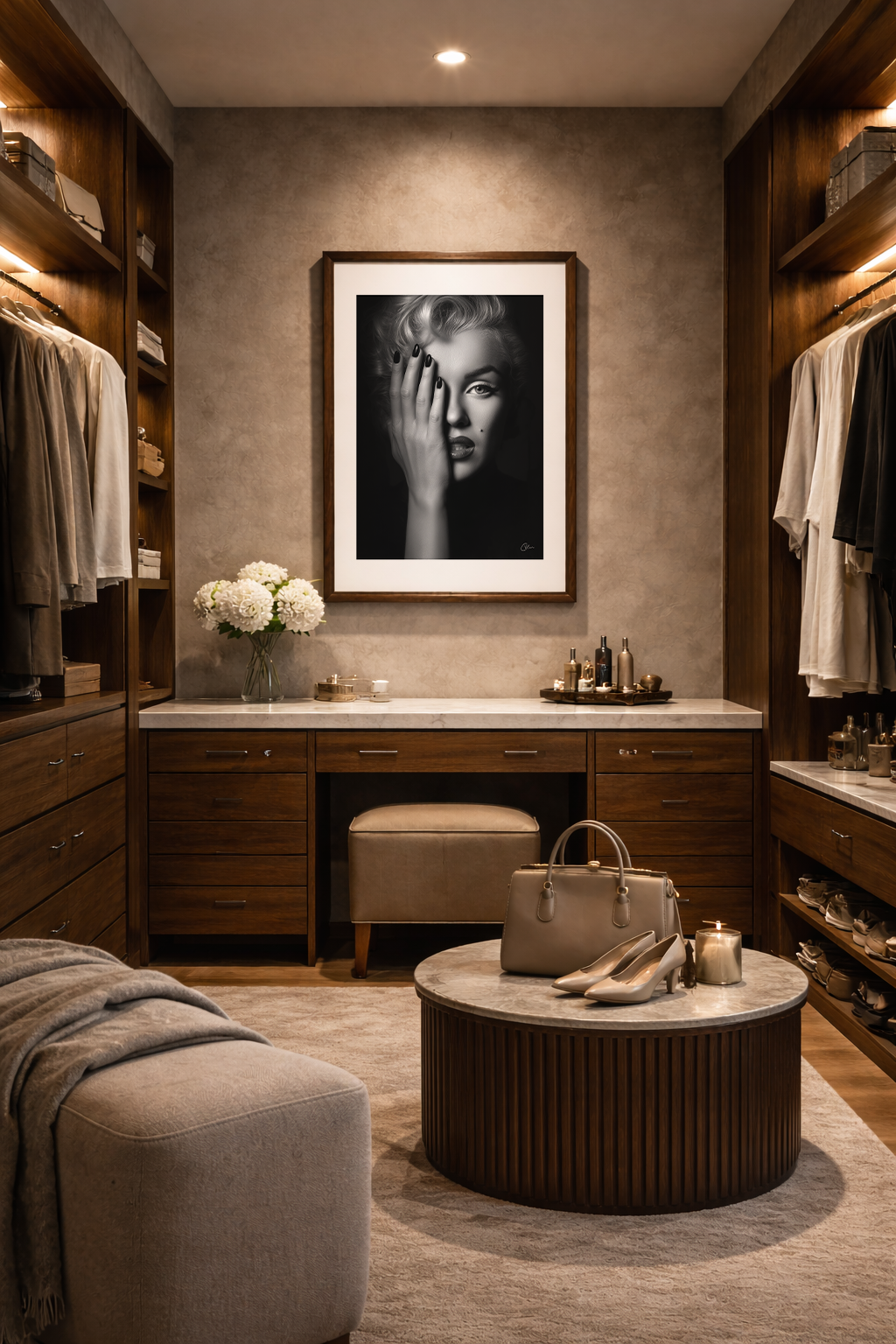 Ett dramatiskt svartvitt porträtt inspirerat av den tidlösa lockelsen och ikoniska stilen som förknippas med Marilyn Monroe. Den djärva närbildskompositionen, djupa skuggorna och de kontrastrika texturerna skapar en fängslande mittpunkt som passar i ett vardagsrum eller en walk-in closet. Konstverket integreras naturligt med monokroma interiörer, modern minimalism eller modedrivna utrymmen. Tryckt med digital passepartout.