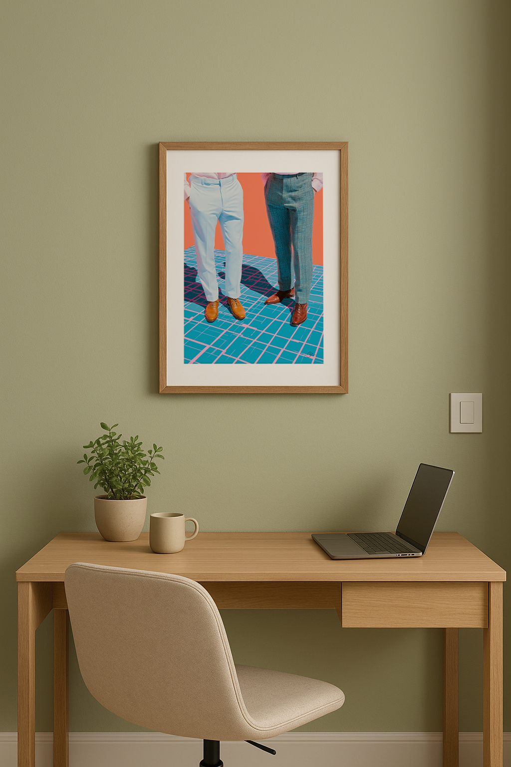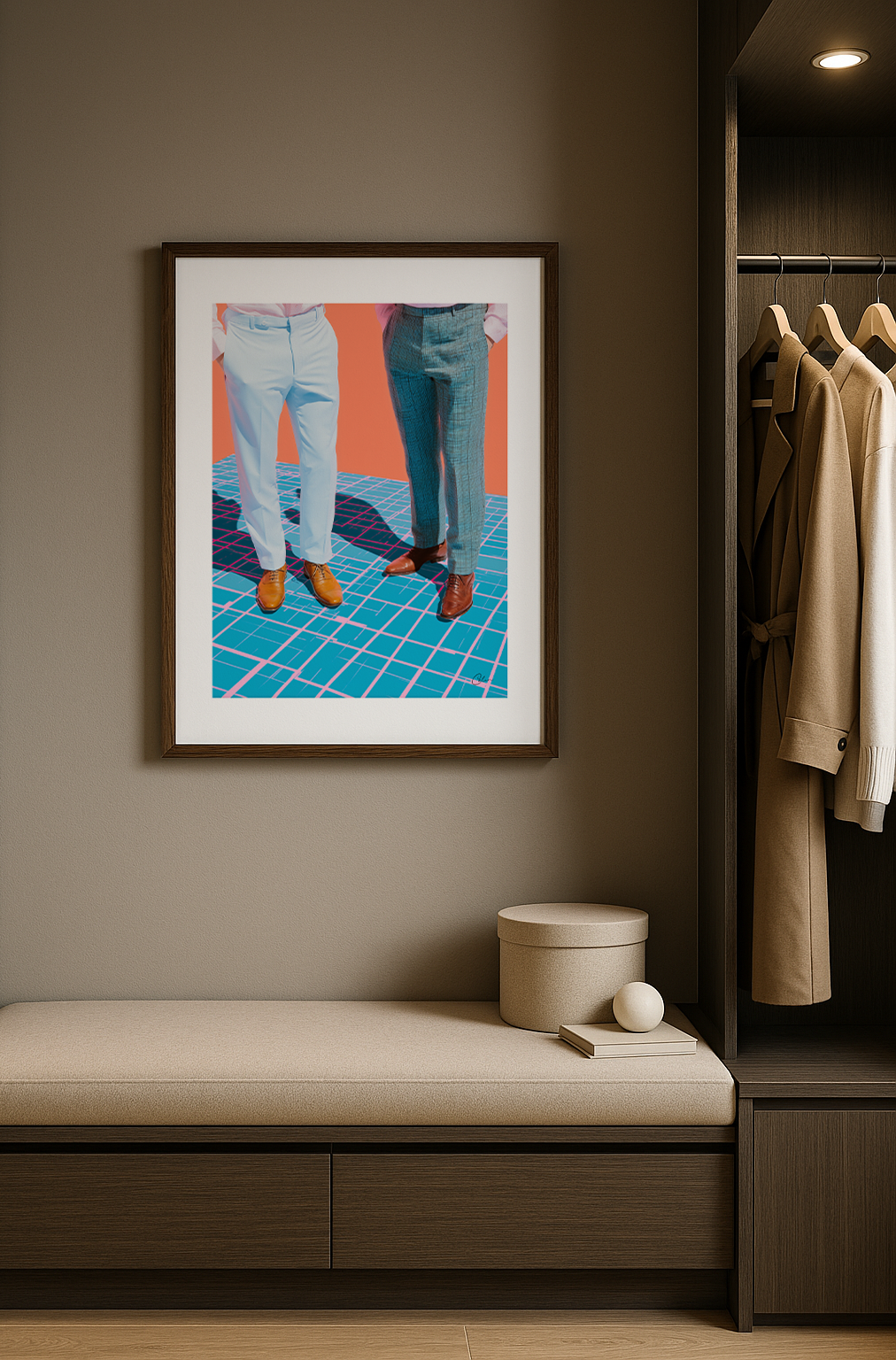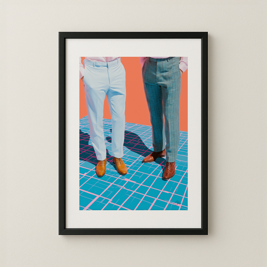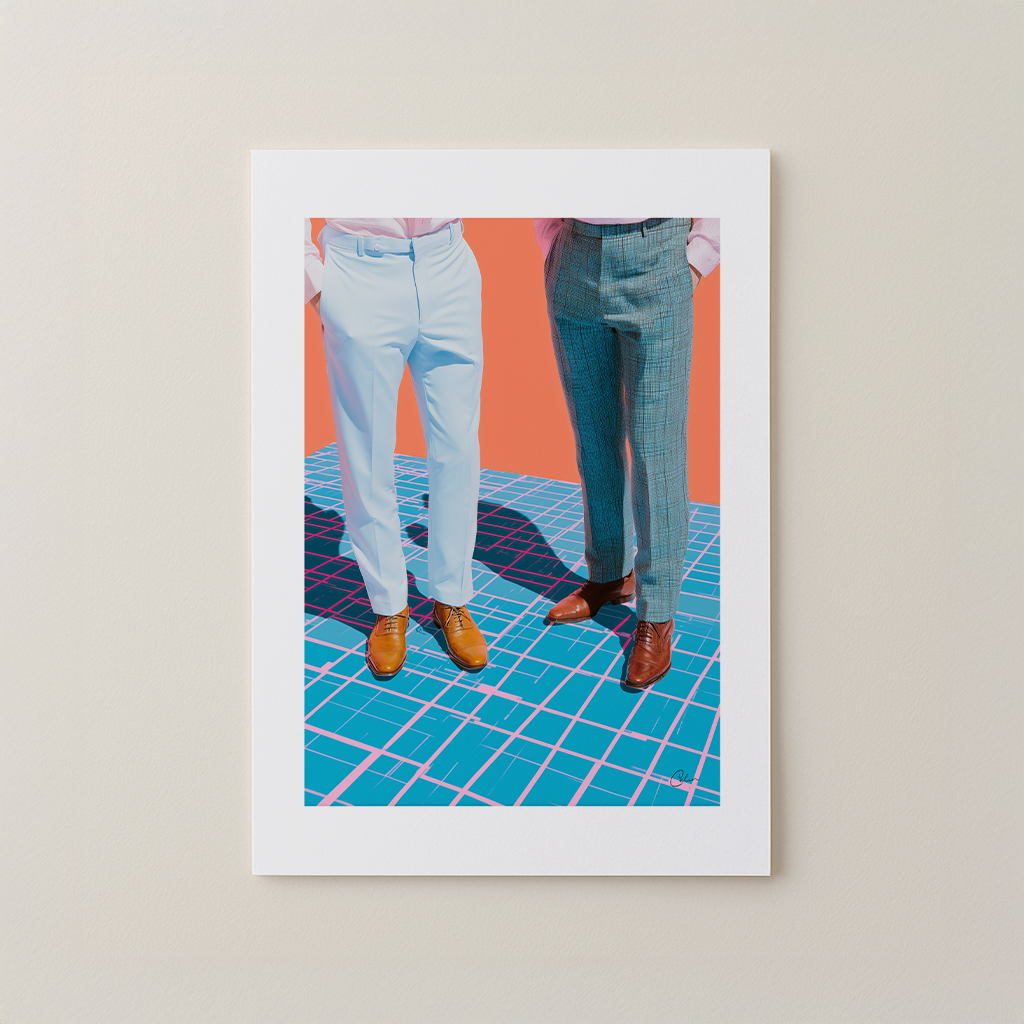 Två män i skräddarsydda byxor och polerade skor står på ett surrealistiskt, rutmönstergolv i djärva färger. Klassiska herrkläder möter digitala drag. Perfekt för hemmakontor eller walk-in-closets – passar till grafiska inredningar och moderna modeuppsättningar.