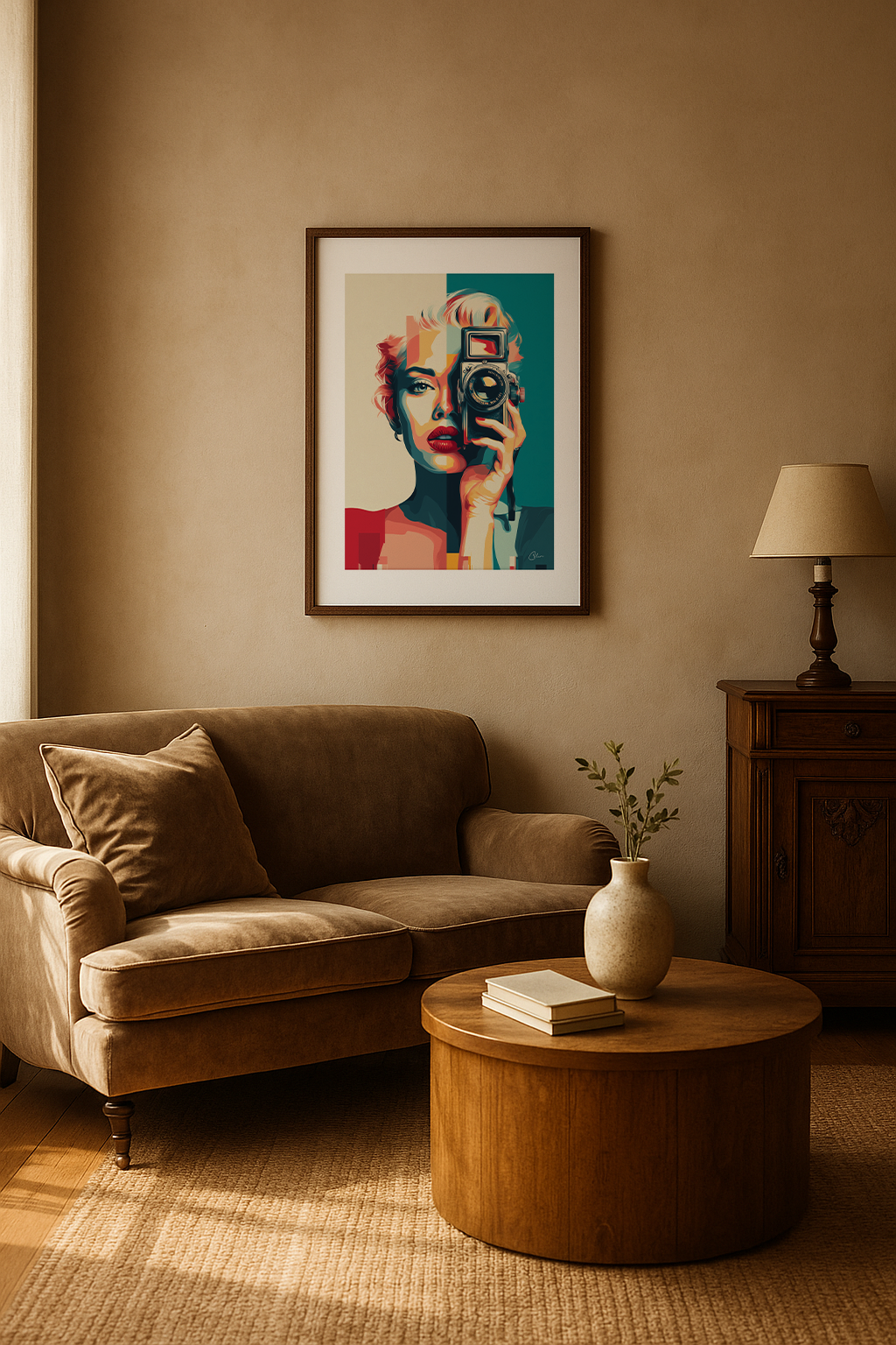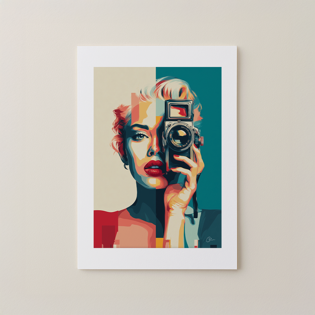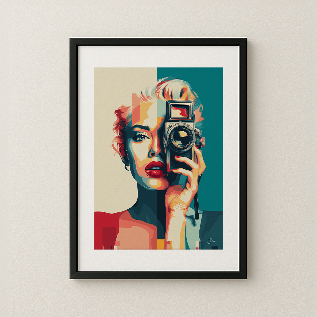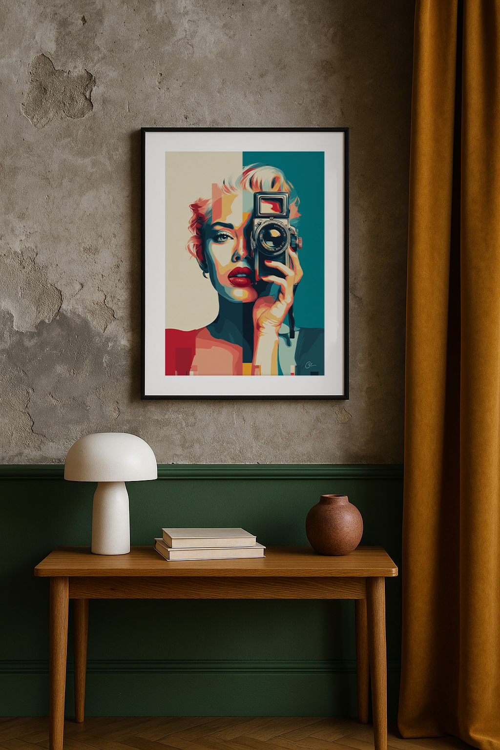 Ett djärvt popkonstporträtt av en kvinna inramat genom hennes vintagekamera – delad av färg, förenad av närvaro. Filmiskt, snyggt och fullt av energi. Perfekt för kreativa ateljéer, klädkammare eller vardagsrum – fungerar bäst med färgaccenter, element från mitten av århundradet och självsäkra interiörer.