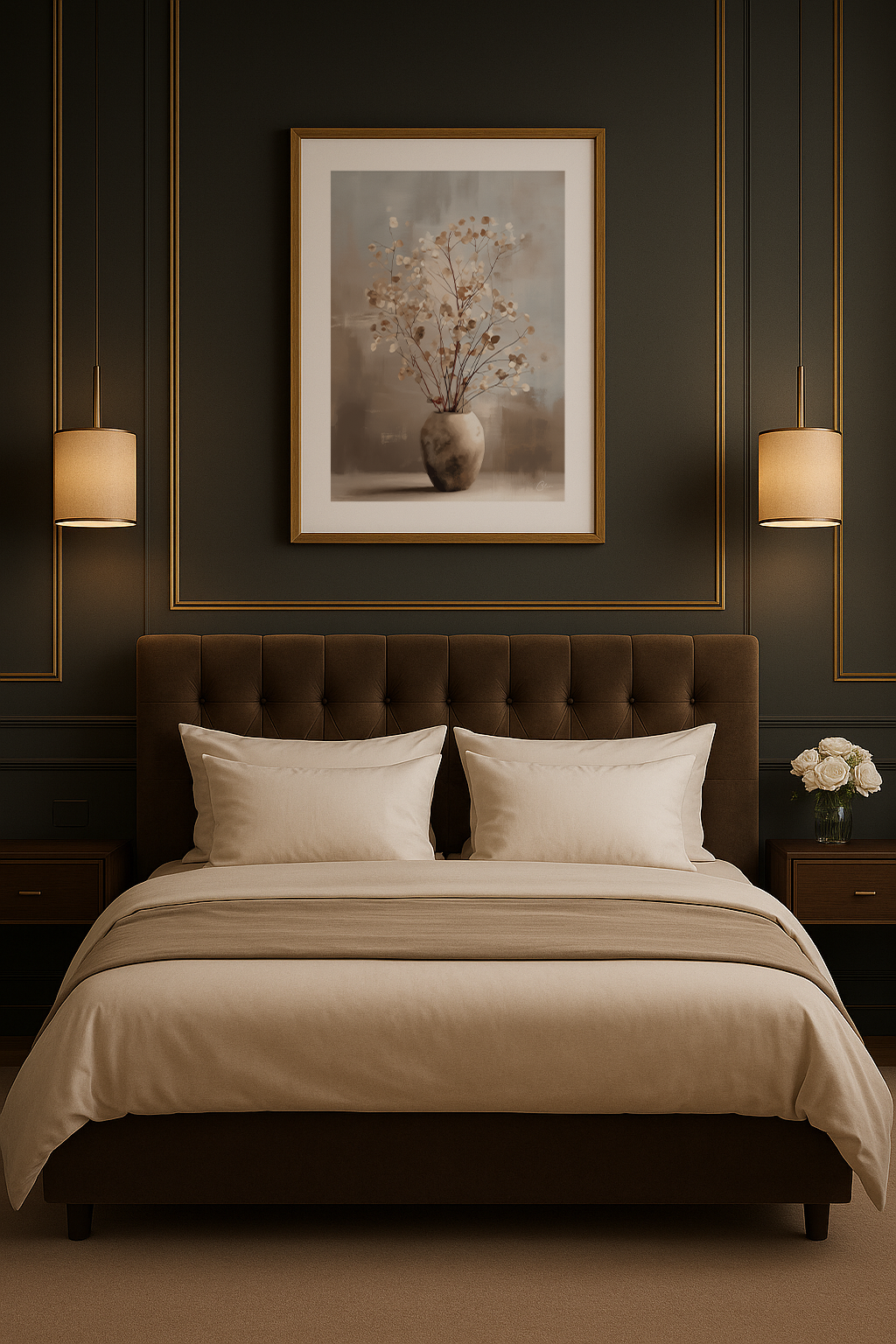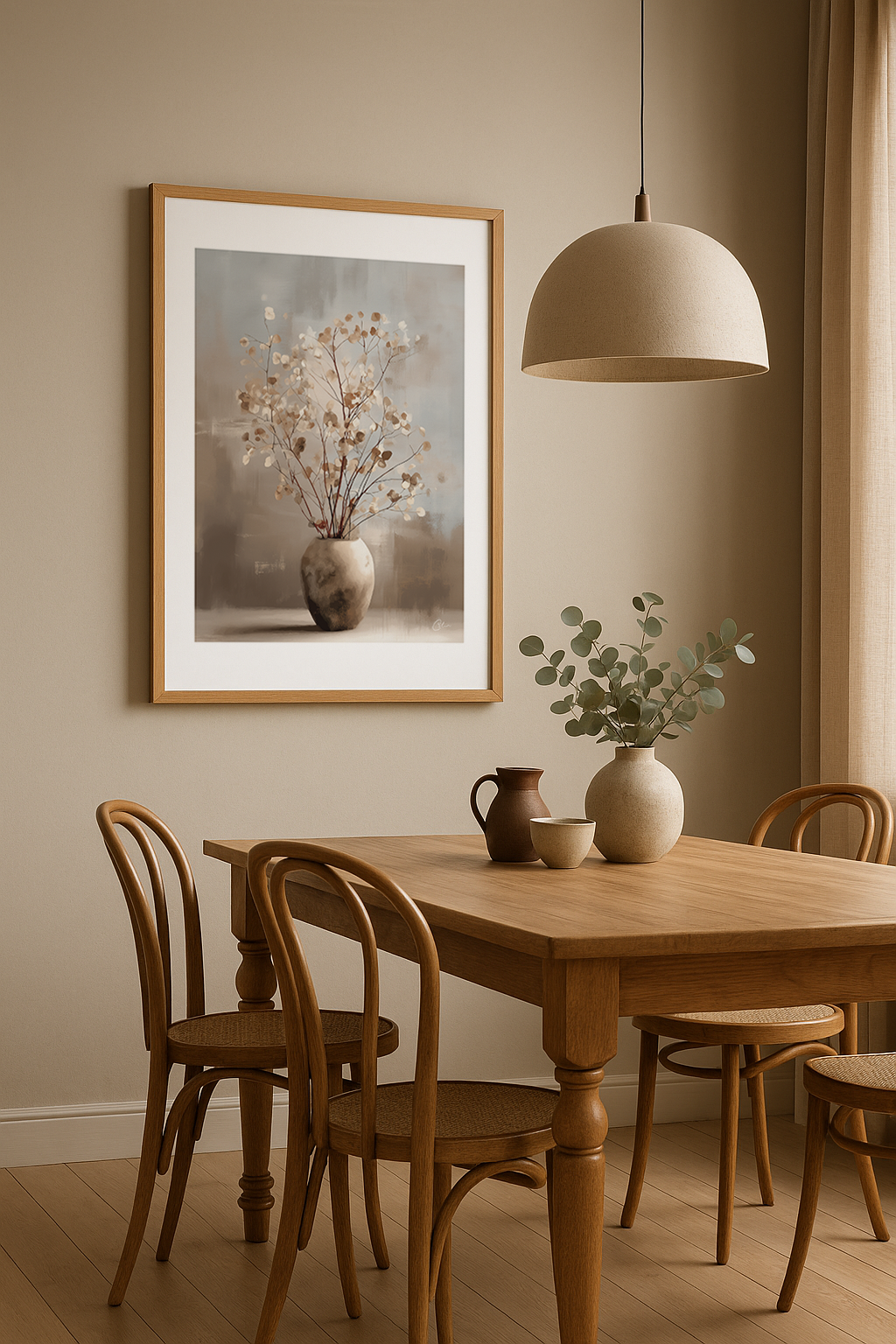 Mjuka toner och fina grenar möts i ett fridfullt stilleben som fångar lugn, balans och naturlig elegans. Den neutrala paletten gör den till ett tidlöst mittpunkt i moderna inredningar. Perfekt för vardagsrum, sovrum eller matsal.