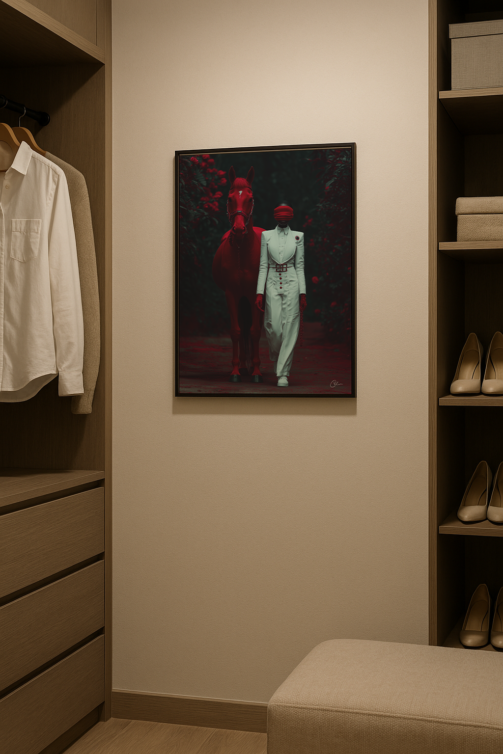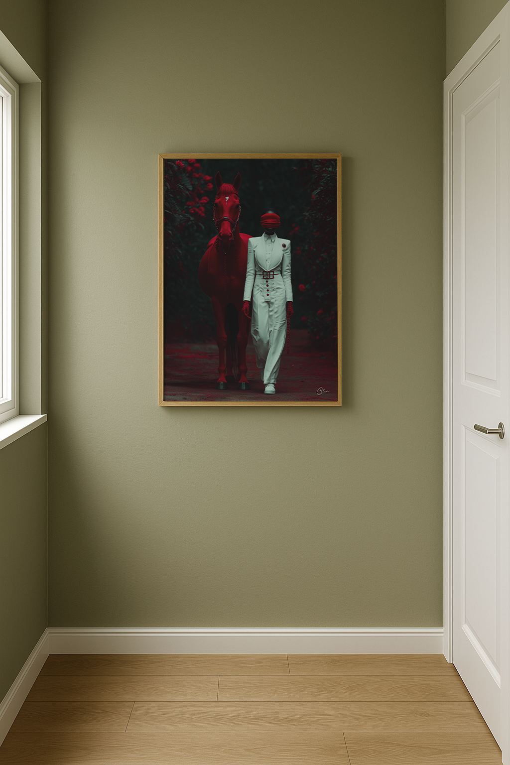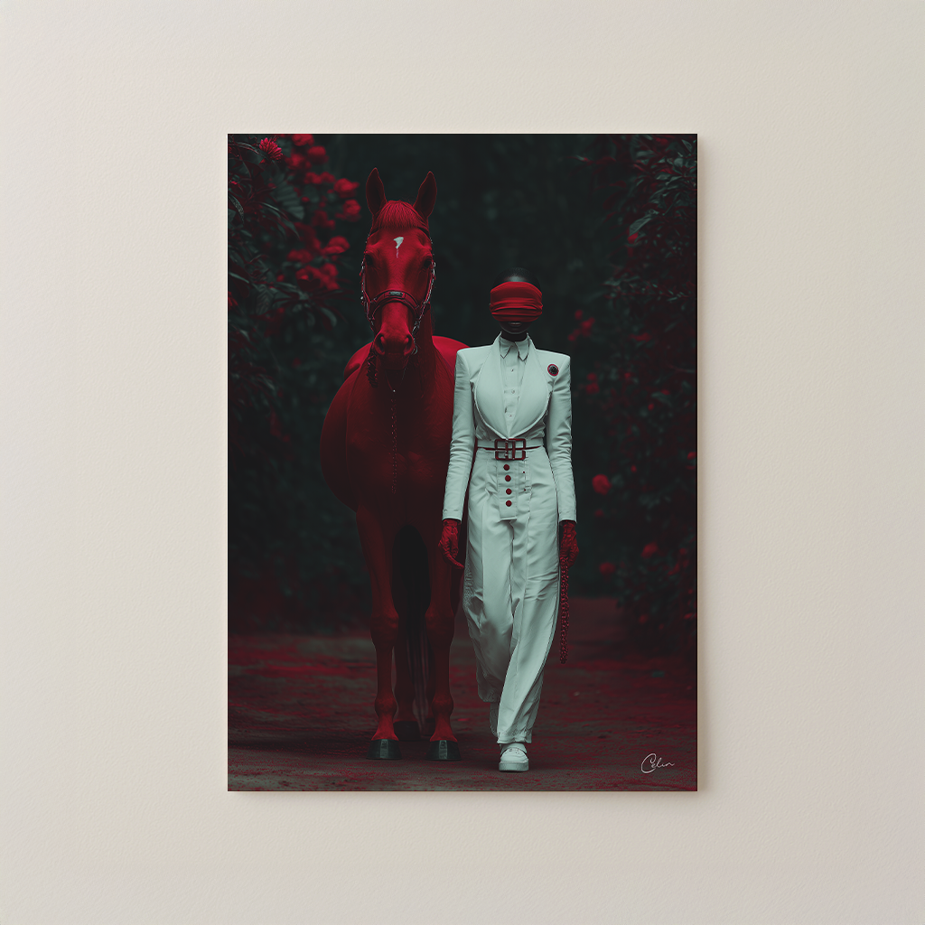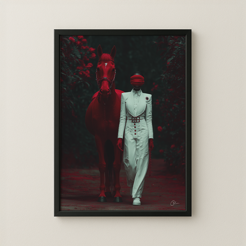 En kvinna med förbundna ögon går med lugn auktoritet bredvid en slående röd häst, båda klädda i perfekt kontrast till sin mörka omgivning. Det är ett ögonblick som präglas av kontroll och mystik.