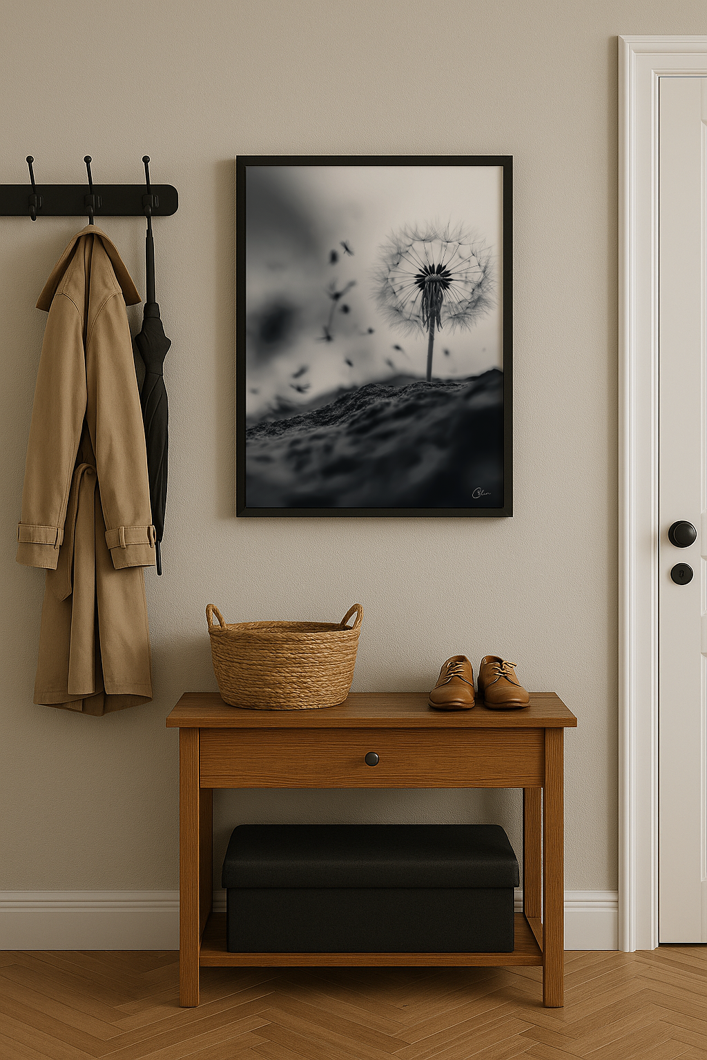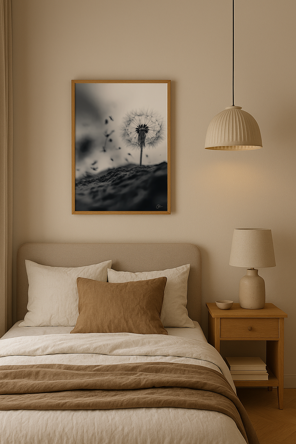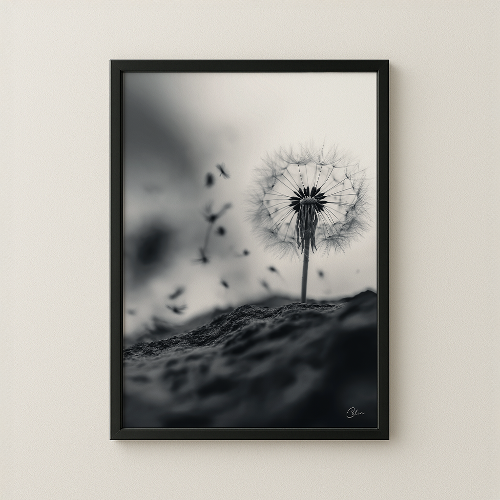 Ett poetiskt svartvitt konstverk som fångar den stilla skönheten hos en maskros som släpper sina frön i vinden. Den mjuka kontrasten och den minimalistiska kompositionen framkallar lugn och självrannsakan, vilket gör det till ett tidlöst verk för vardagsrummet, sovrummet eller hallen.