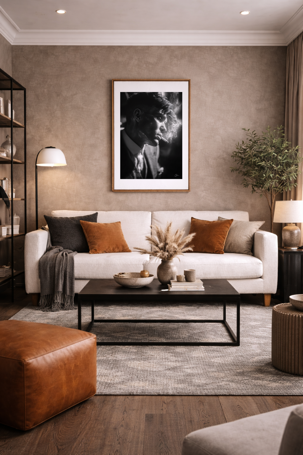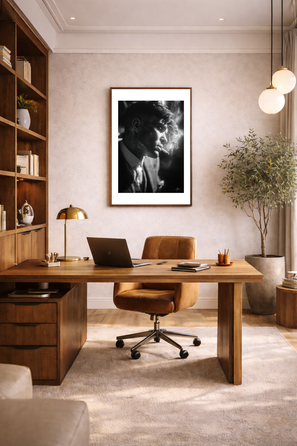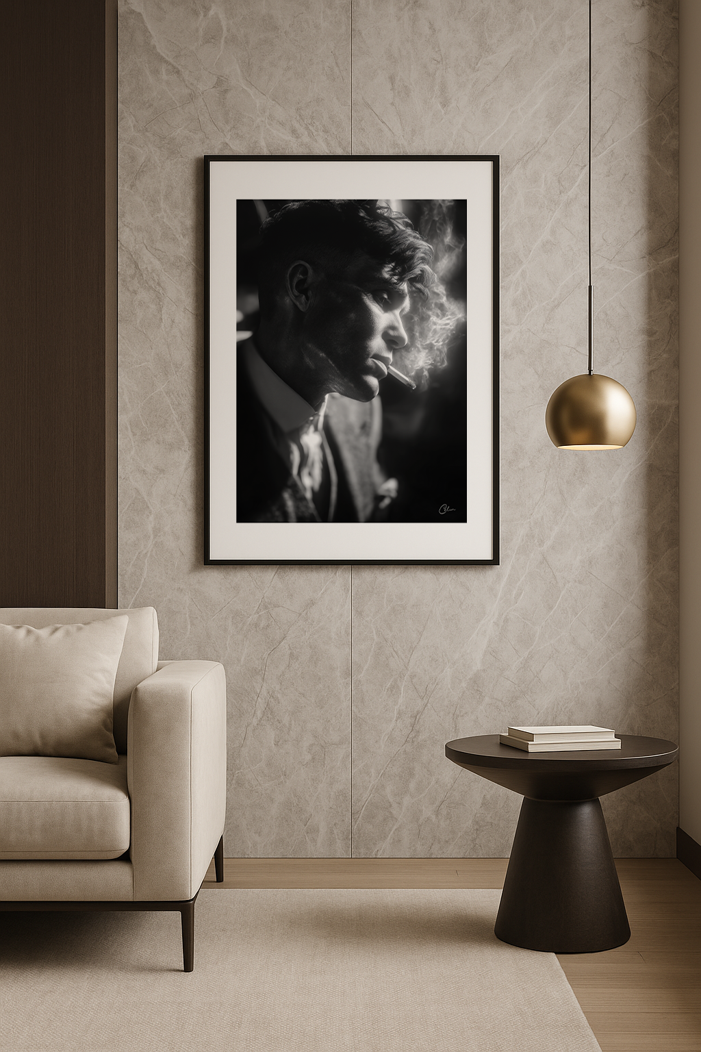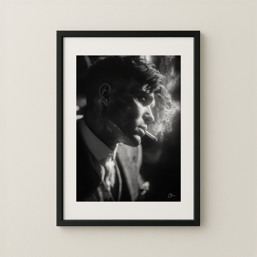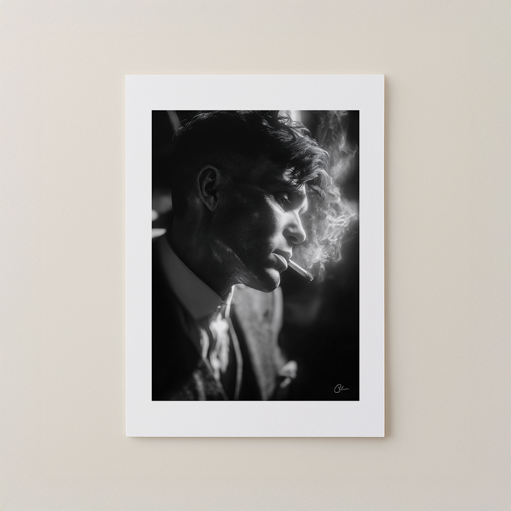 Smoke Shadow är ett filmiskt monokromt porträtt inspirerat av den ikoniska karaktären Thomas Shelby, där drivande rök och starka kontraster formar ett spänt, atmosfäriskt ögonblick. Konstverket uppnår sin mest raffinerade presentation med en digital vit passepartout , vilket förstärker djupet och ger kompositionen en ren, galleriliknande inramning.